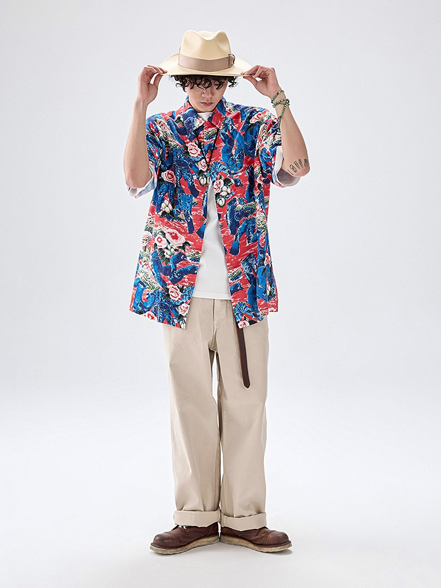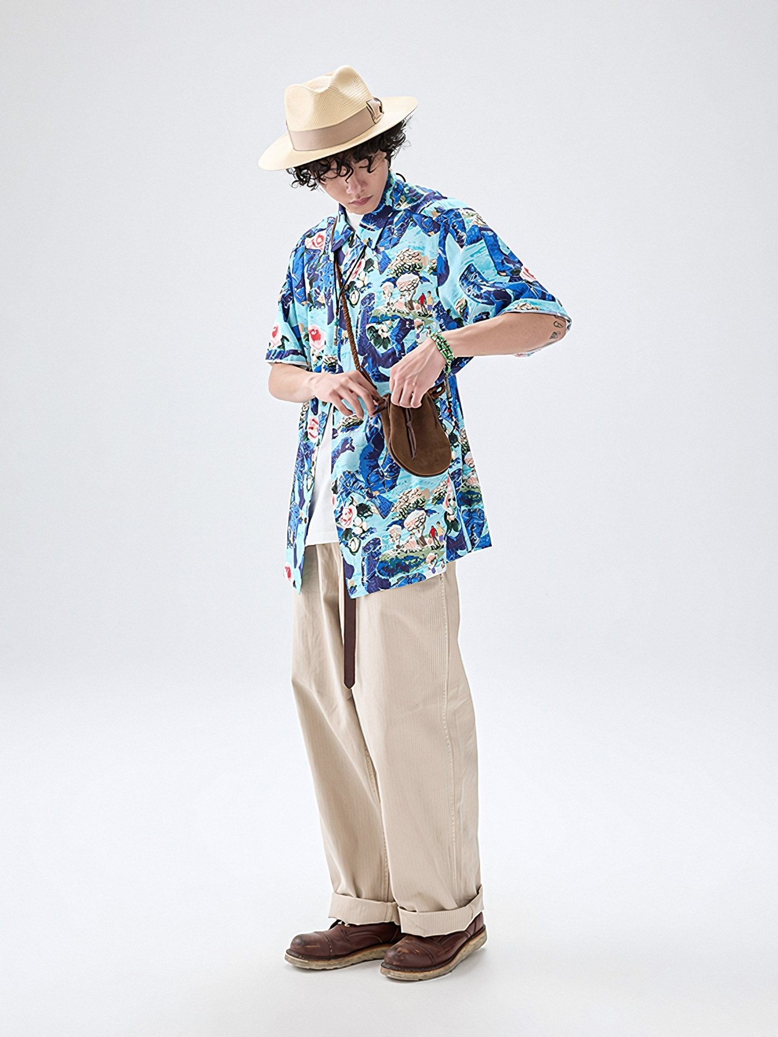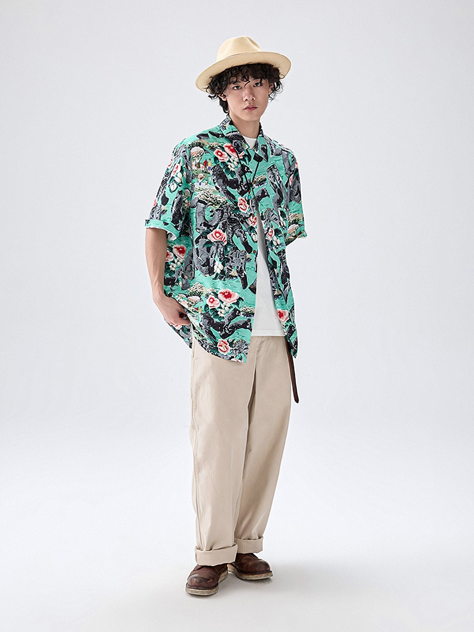 レトロなハワイアンのキューバシャツの特徴は、印刷の色彩の鮮やかさにあります。複数回のサンプリングを経て、底色として選ばれた3つのカラーを慎重に選定し、彩度の完璧な表現を確保しました。
