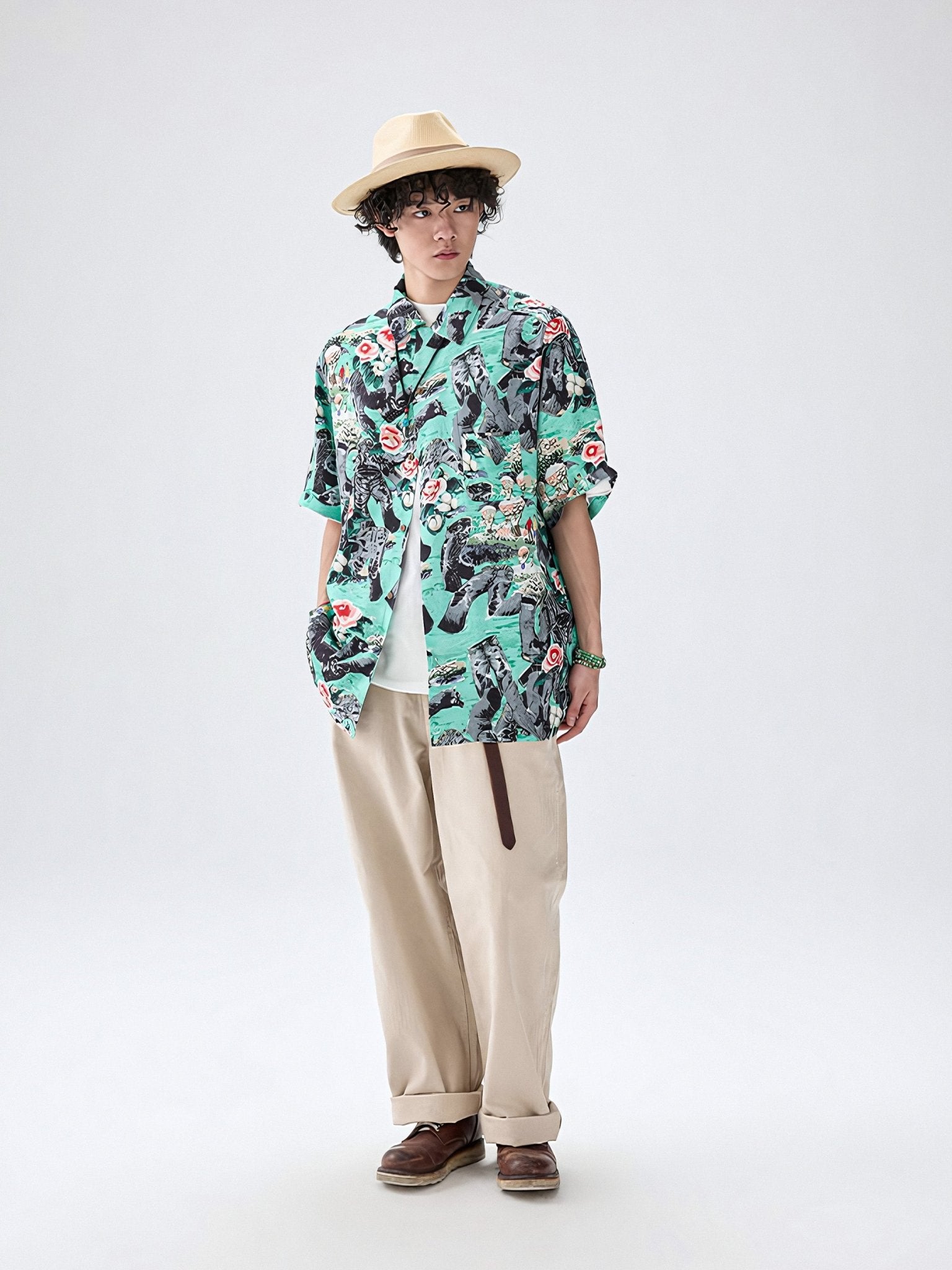 花柄の制作工程では、デジタルプリントとロータリータイプのシルクスクリーン印刷を採用し、柄のクリアな表現と鮮やかな色彩を保証しています。ボタンは全てココナッツシェルボタンで、シャツに個性的な自然な雰囲気を加えています。