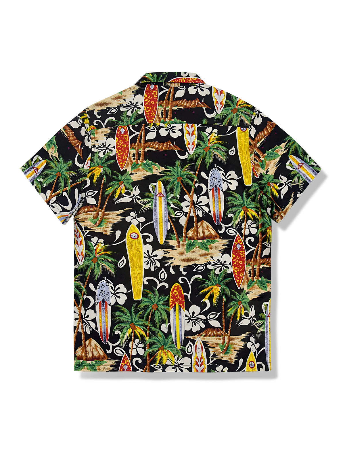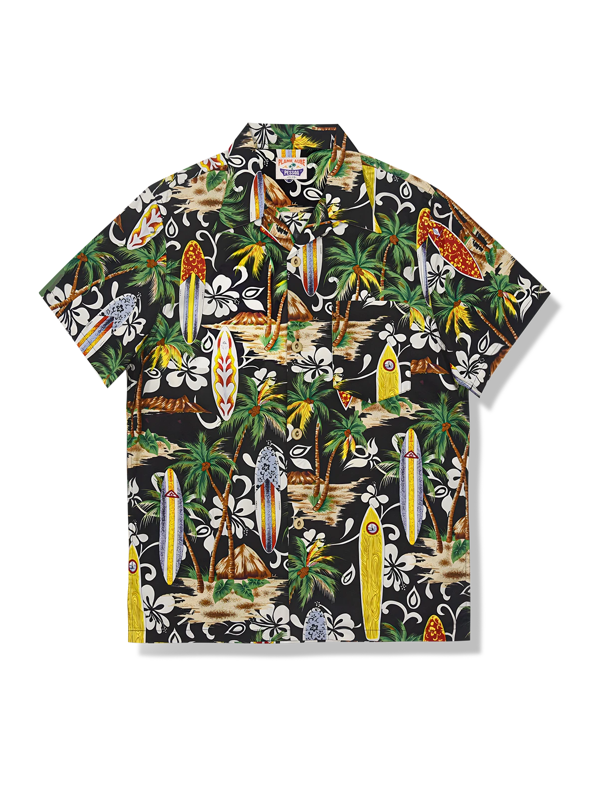 夏を感じさせるハワイアンシャツが新登場!このシャツにはサーフボード、小さな島、そしてヤシの木といった3つの夏を象徴するアイテムがプリントされており、そのカラフルな配色は夏の陽気さを演出しています。ユニークなデザインに加え、キューバ襟が華やかでオシャレ度アップ。リゾート感あふれるスタイリングにもぴったりの一着です。