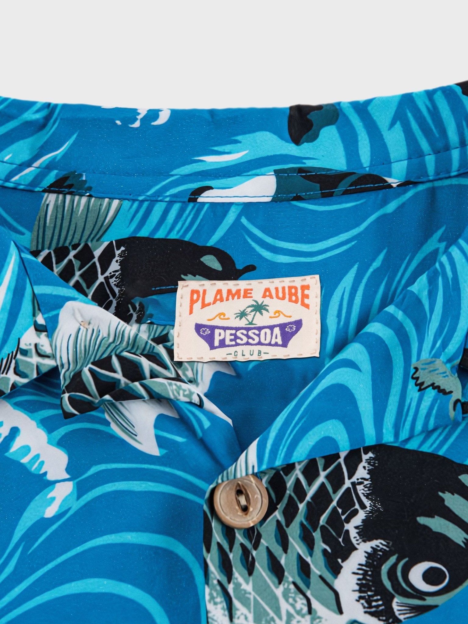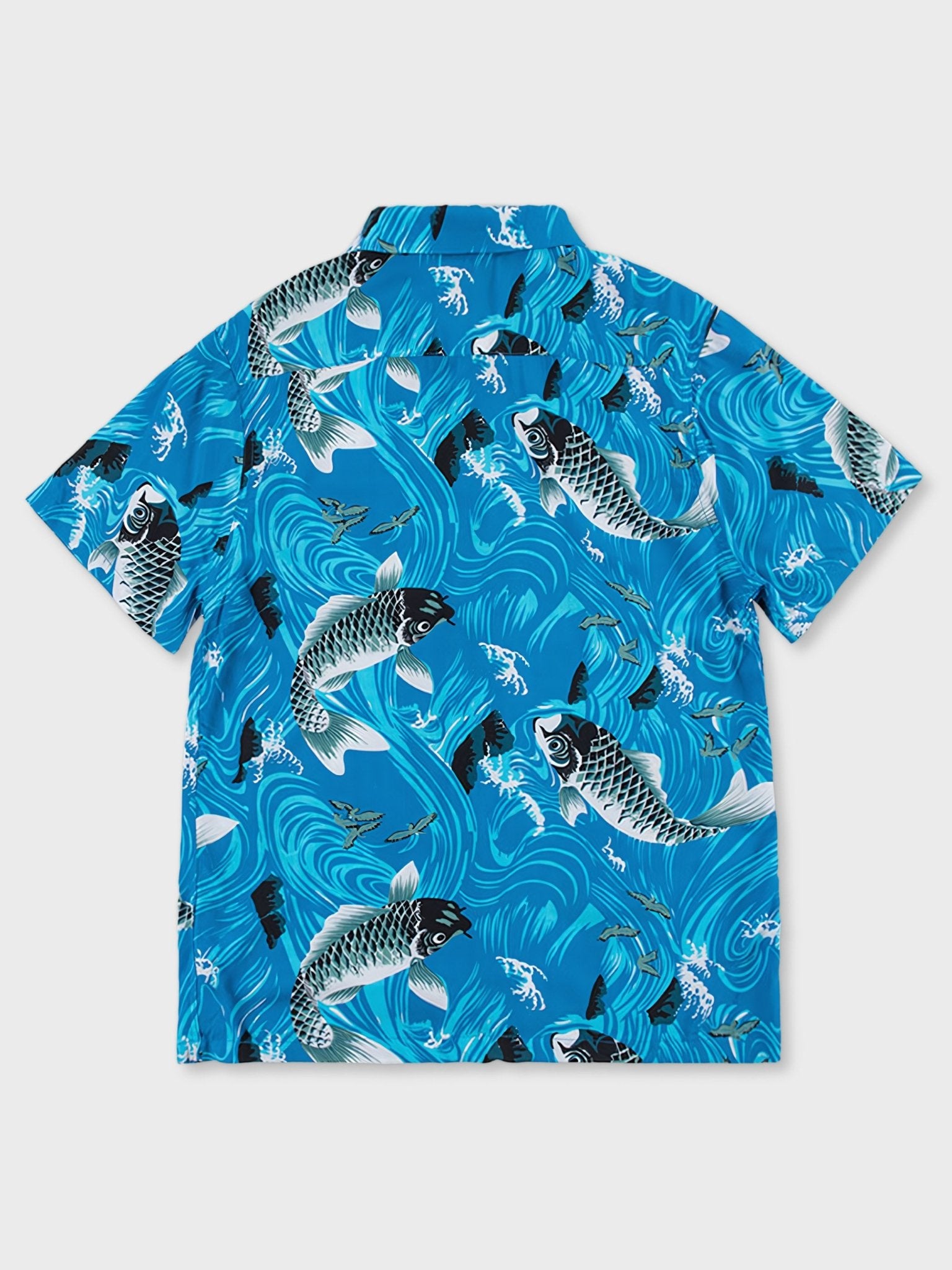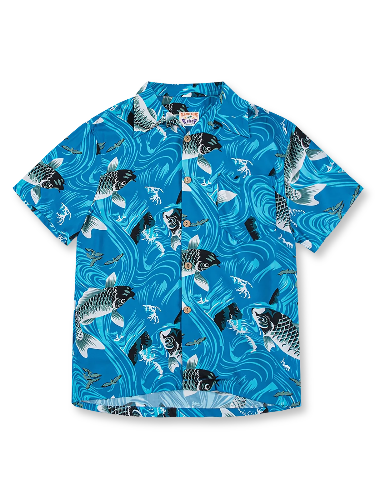 鮮やかな青色の背景に、カラフルな鯉がプリントされており、夏の陽気な雰囲気を演出してくれます。さらに、古巴カラーの襟がクラシックでスタイリッシュな雰囲気を加え、着こなしを引き締めてくれます。