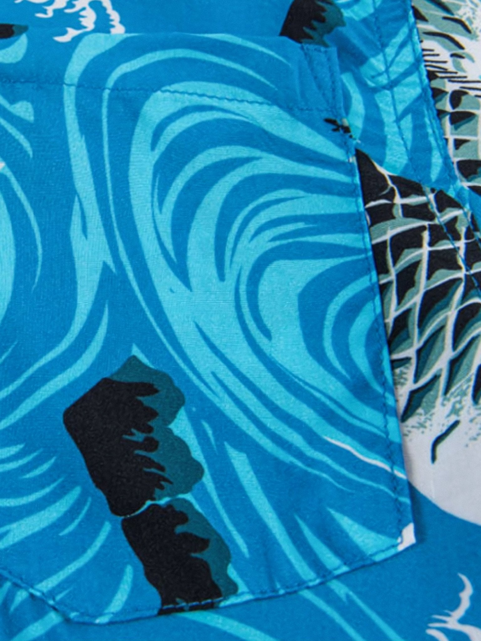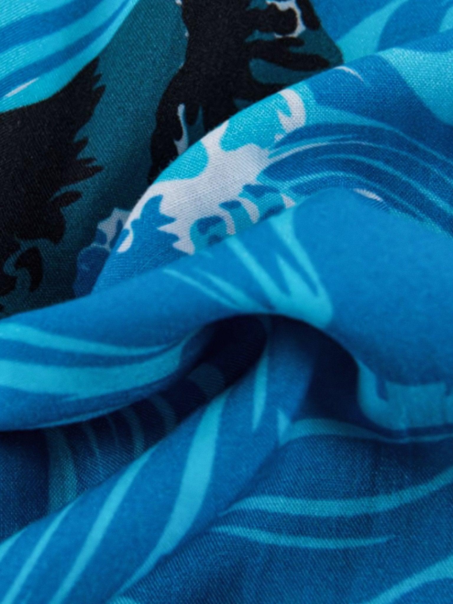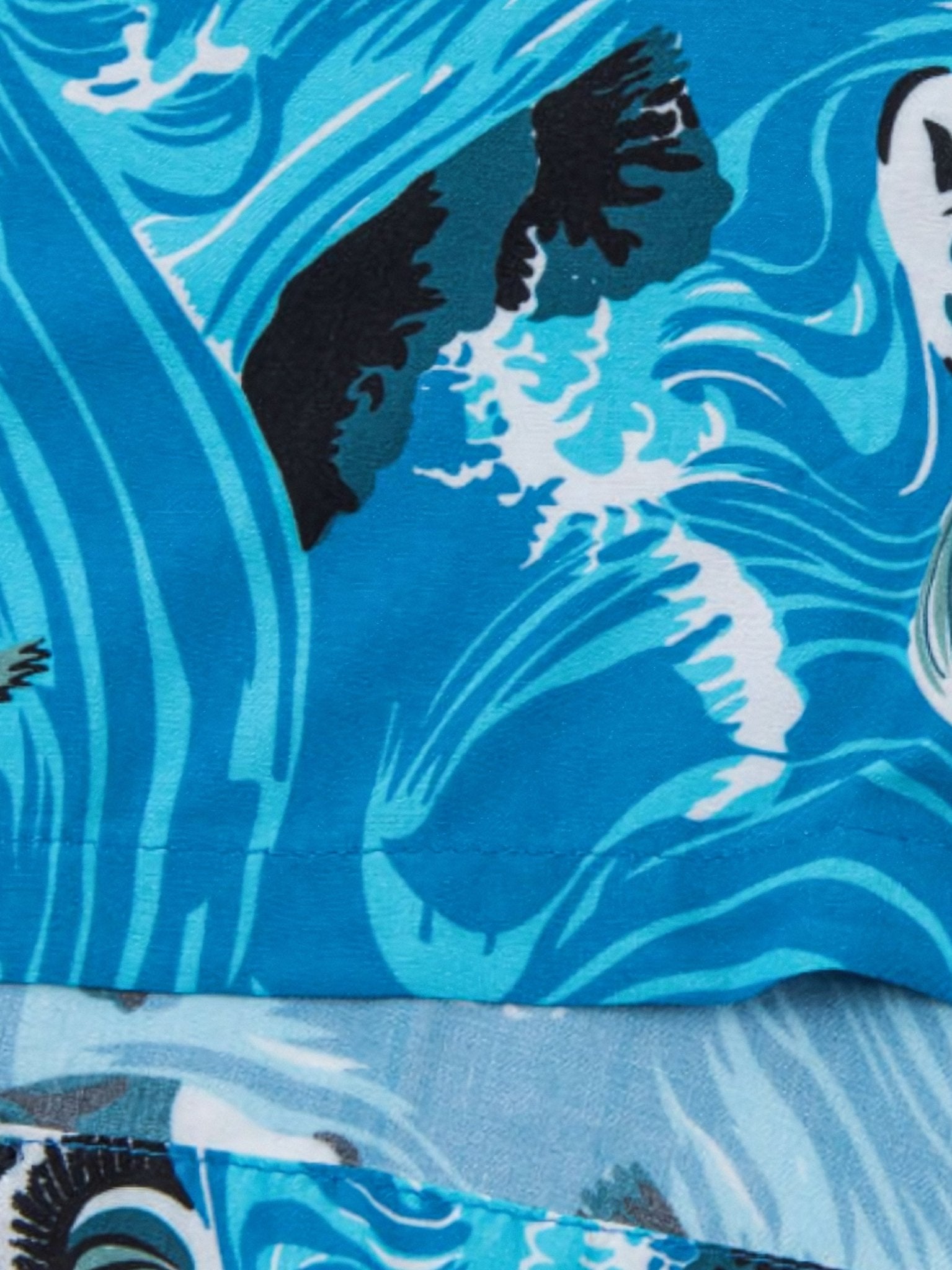 鮮やかな青色の背景に、カラフルな鯉がプリントされており、夏の陽気な雰囲気を演出してくれます。さらに、古巴カラーの襟がクラシックでスタイリッシュな雰囲気を加え、着こなしを引き締めてくれます。
