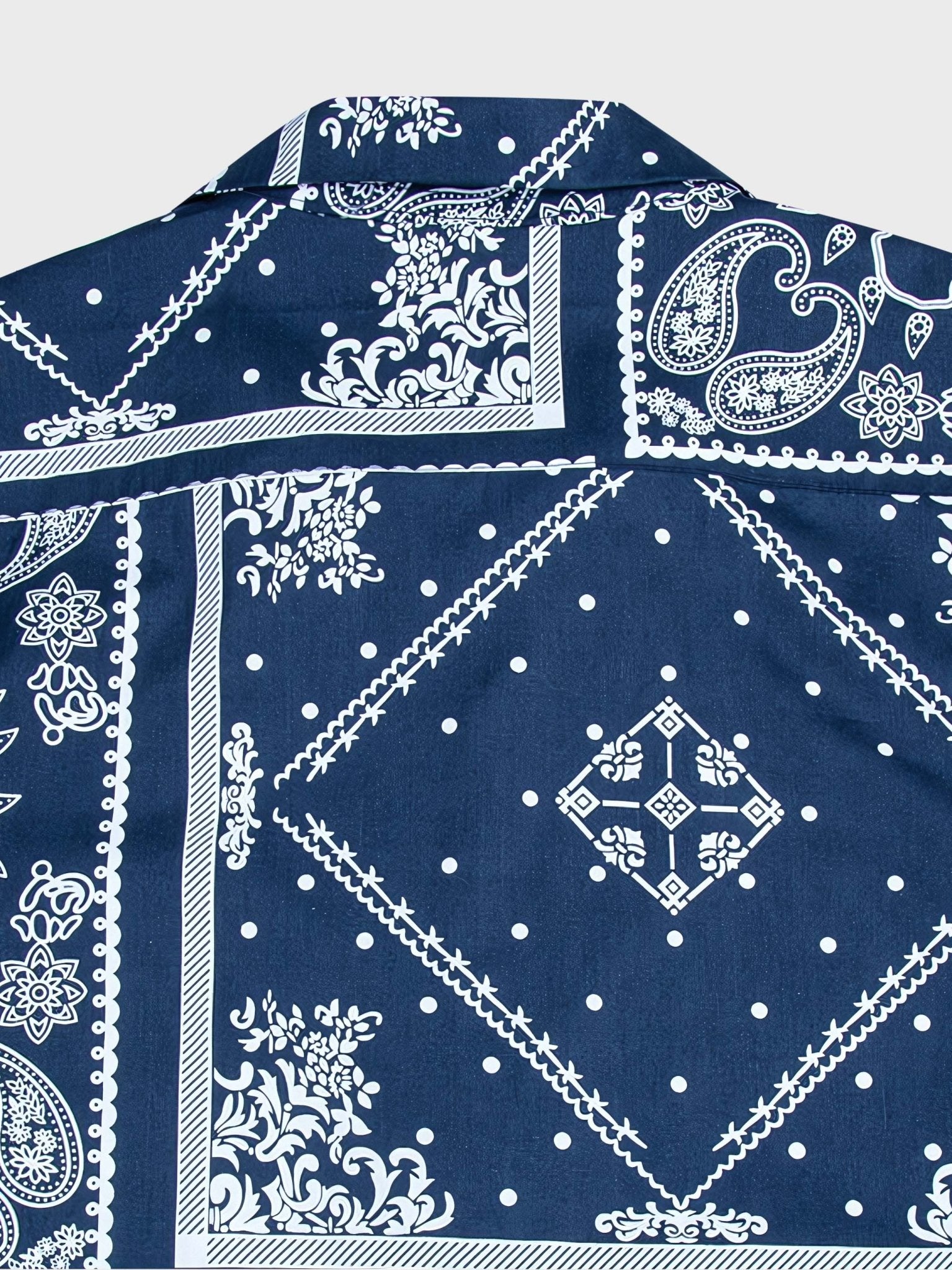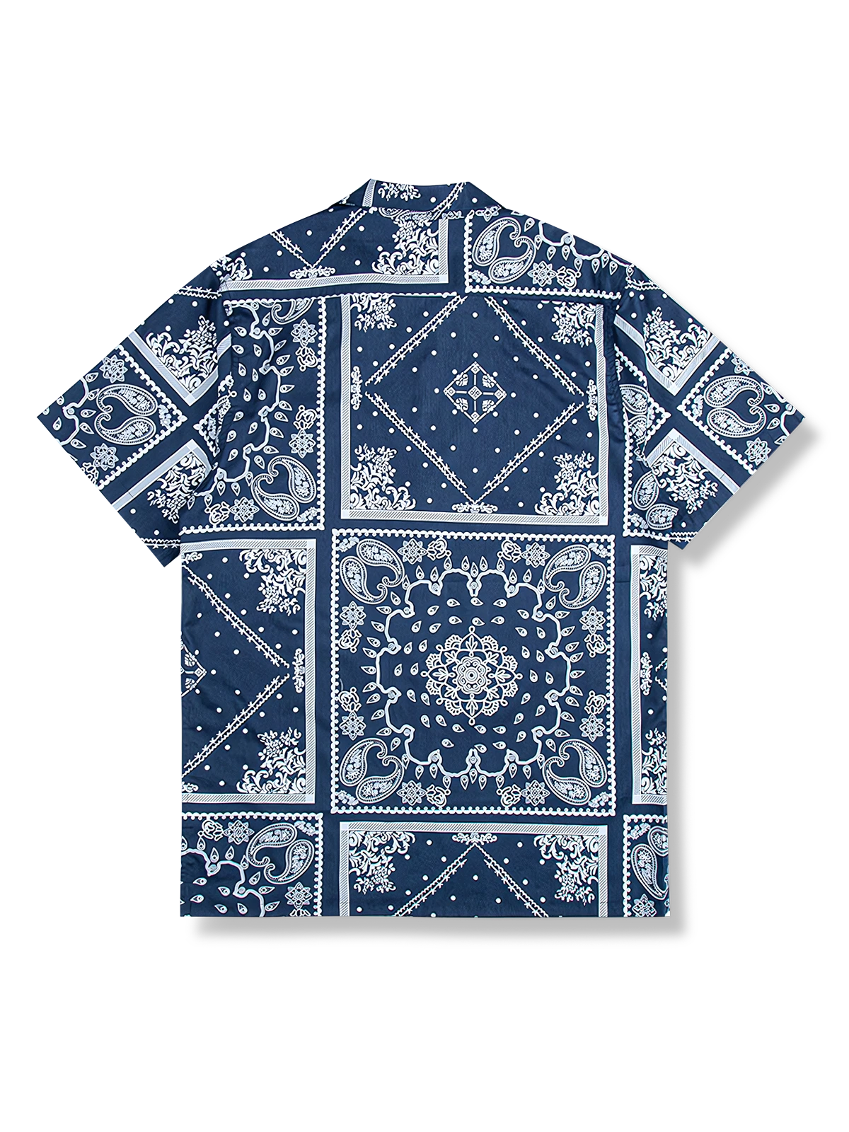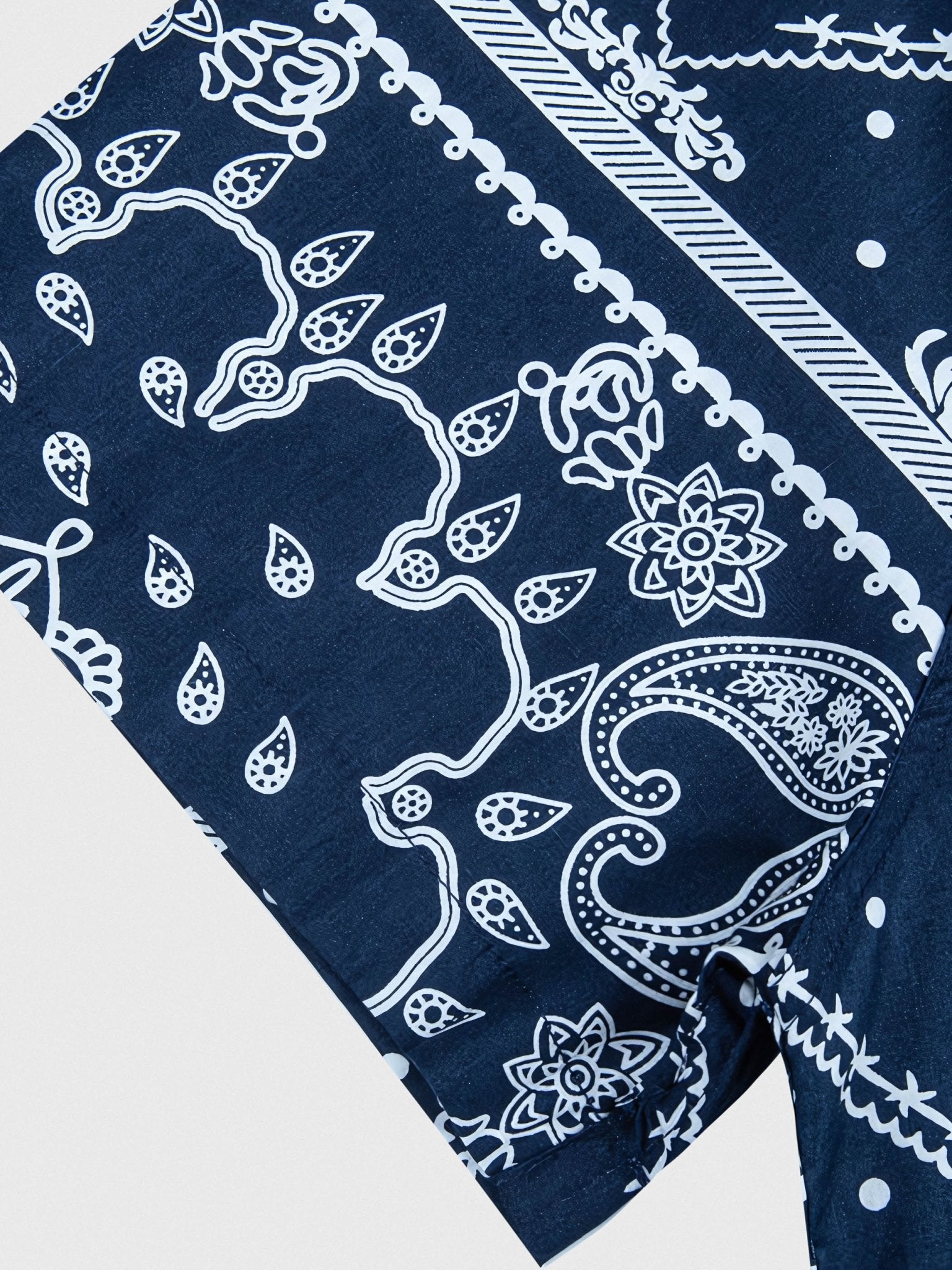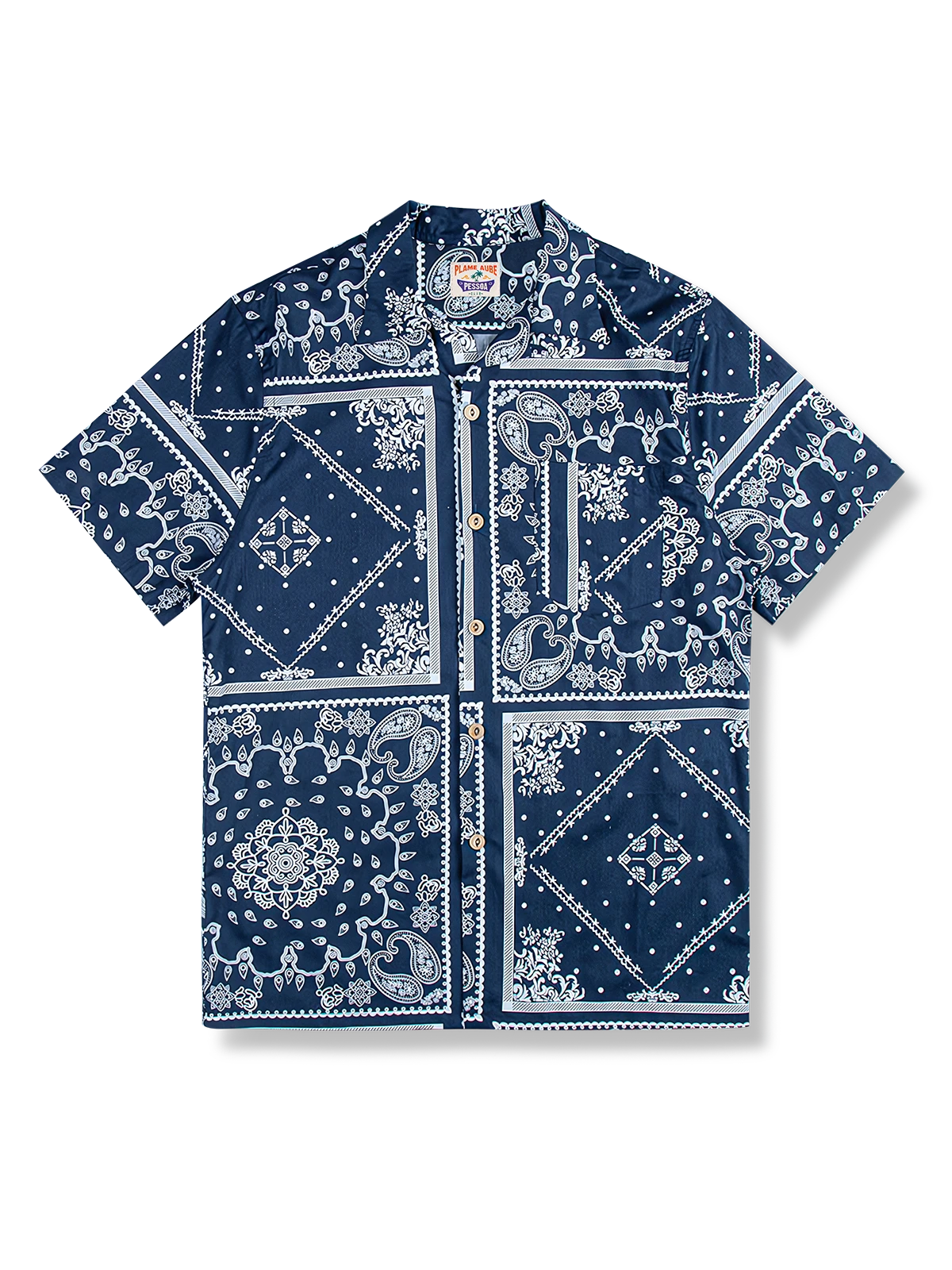 このアロハシャツは、ネイビーのベースカラーとペイズリー柄のプリントが使用されて、優雅なスタイルを演出しています。非対称のプリントデザインはユニークで、シャツに個性的な魅力を加えます。