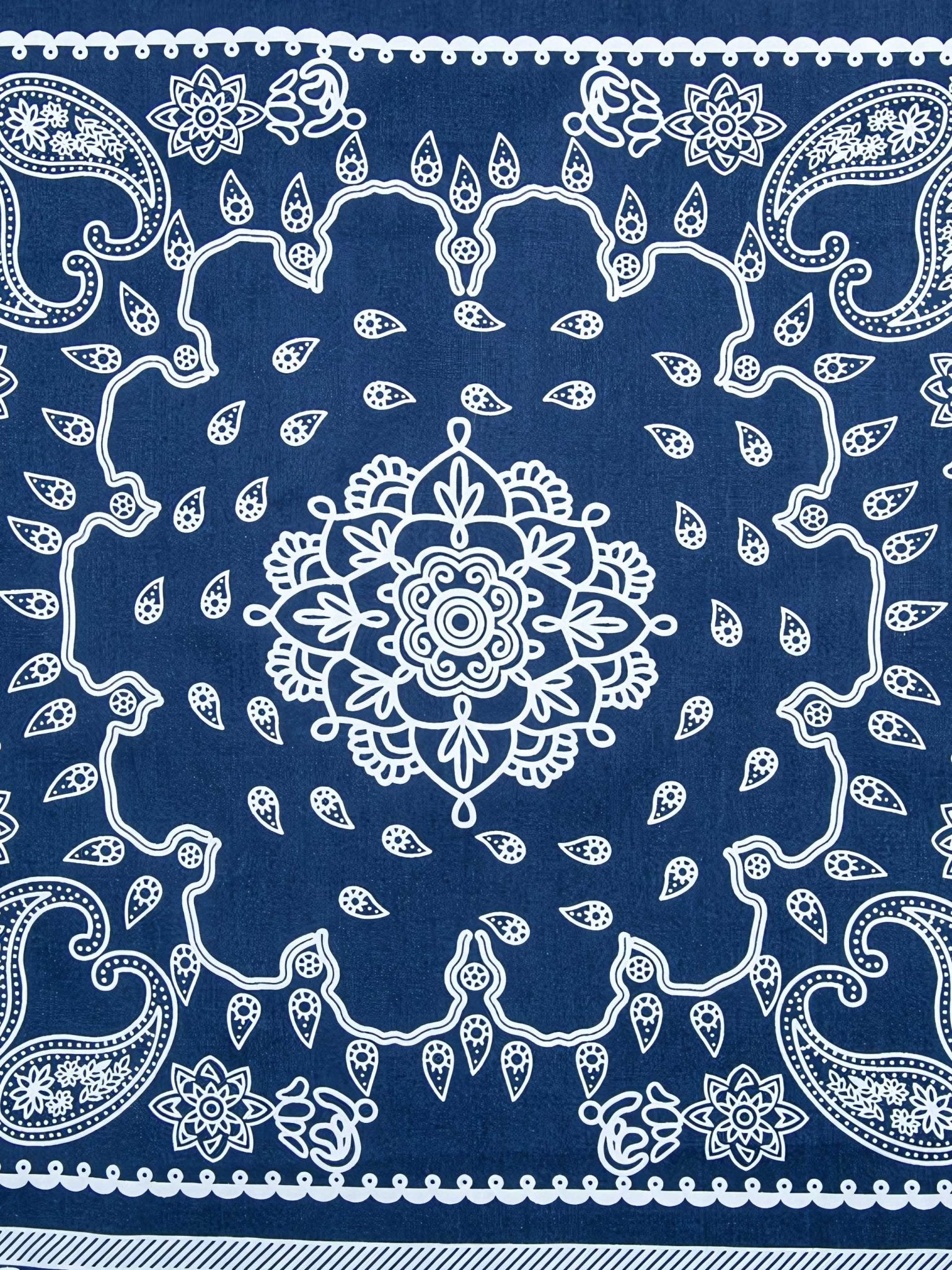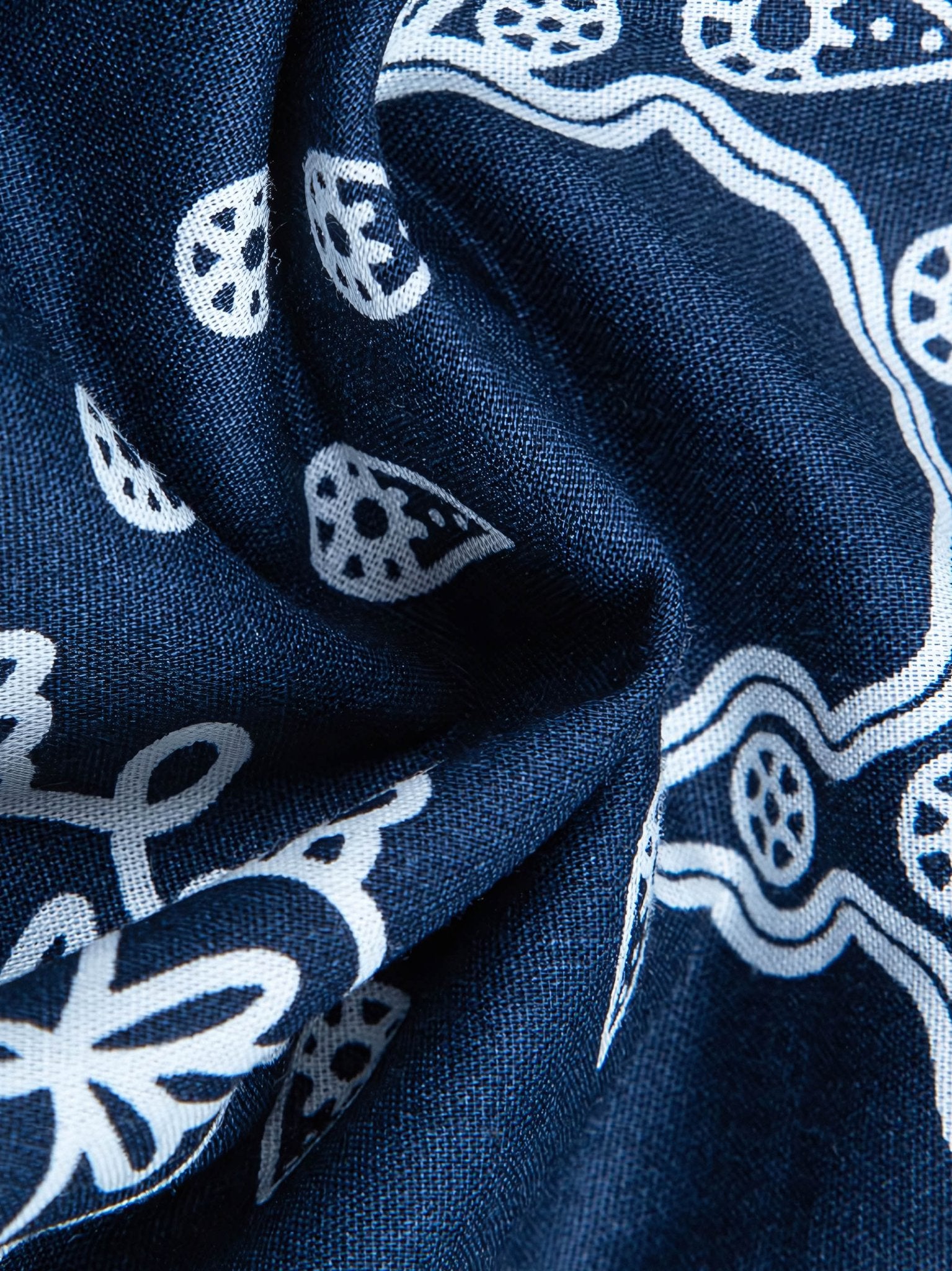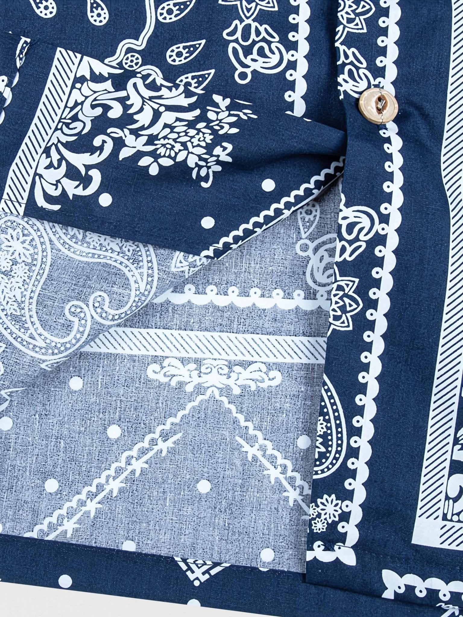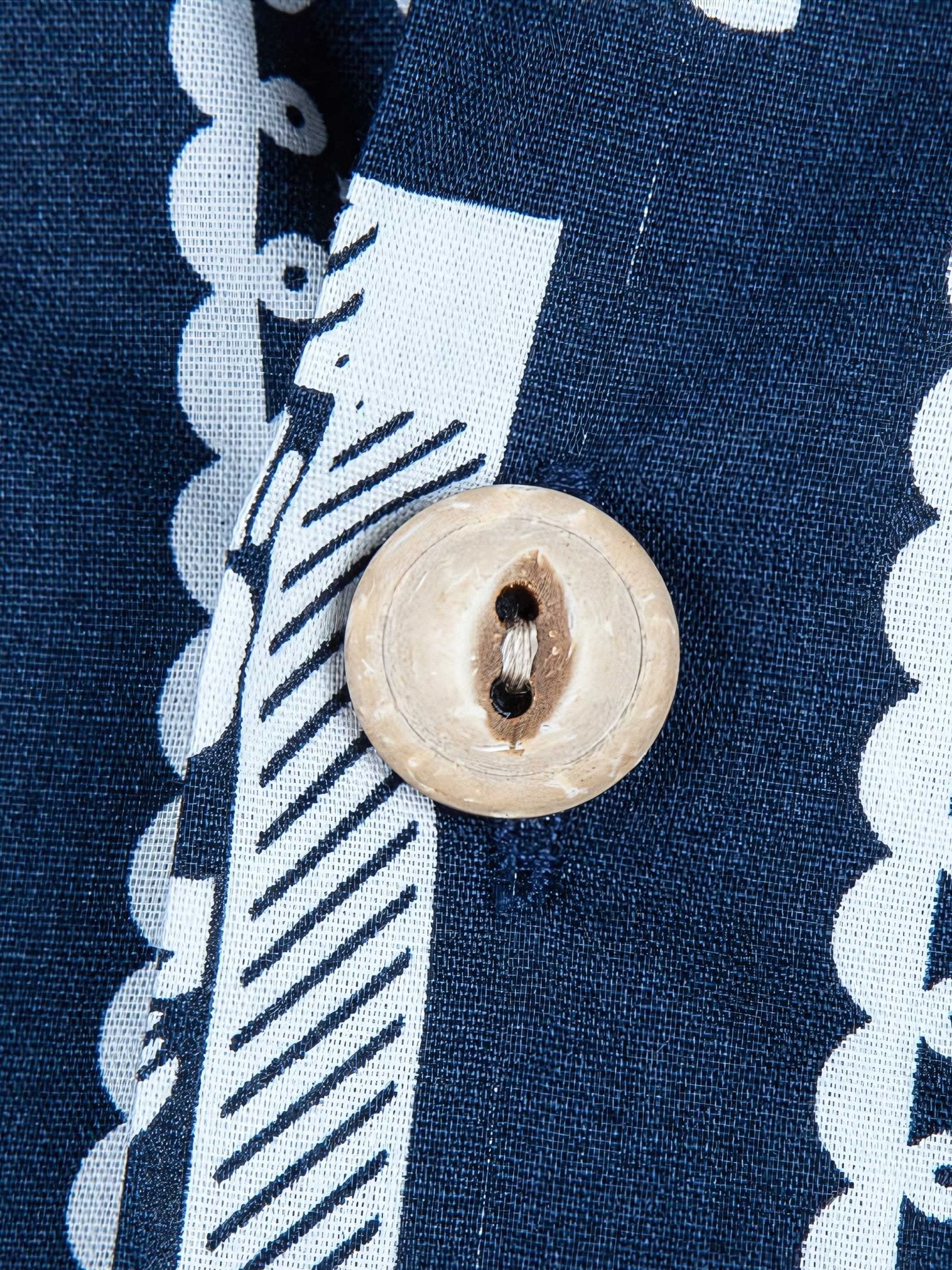 このアロハシャツは、ネイビーのベースカラーとペイズリー柄のプリントが使用されて、優雅なスタイルを演出しています。非対称のプリントデザインはユニークで、シャツに個性的な魅力を加えます。