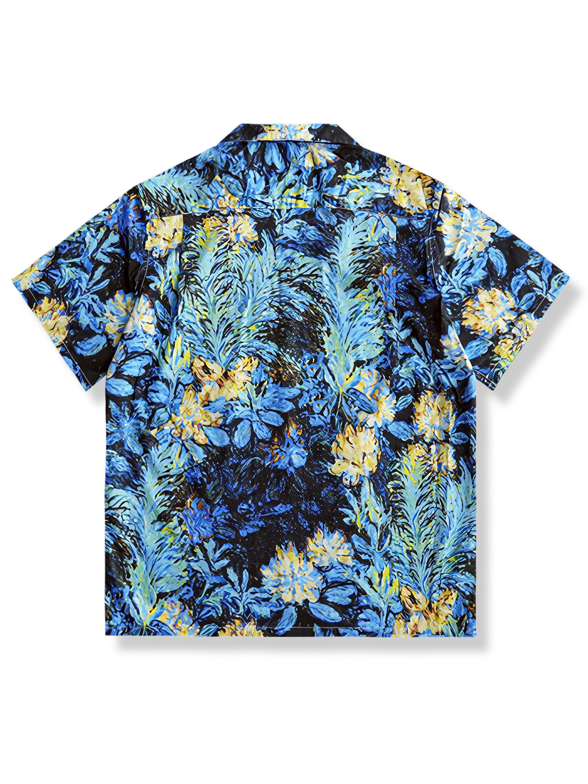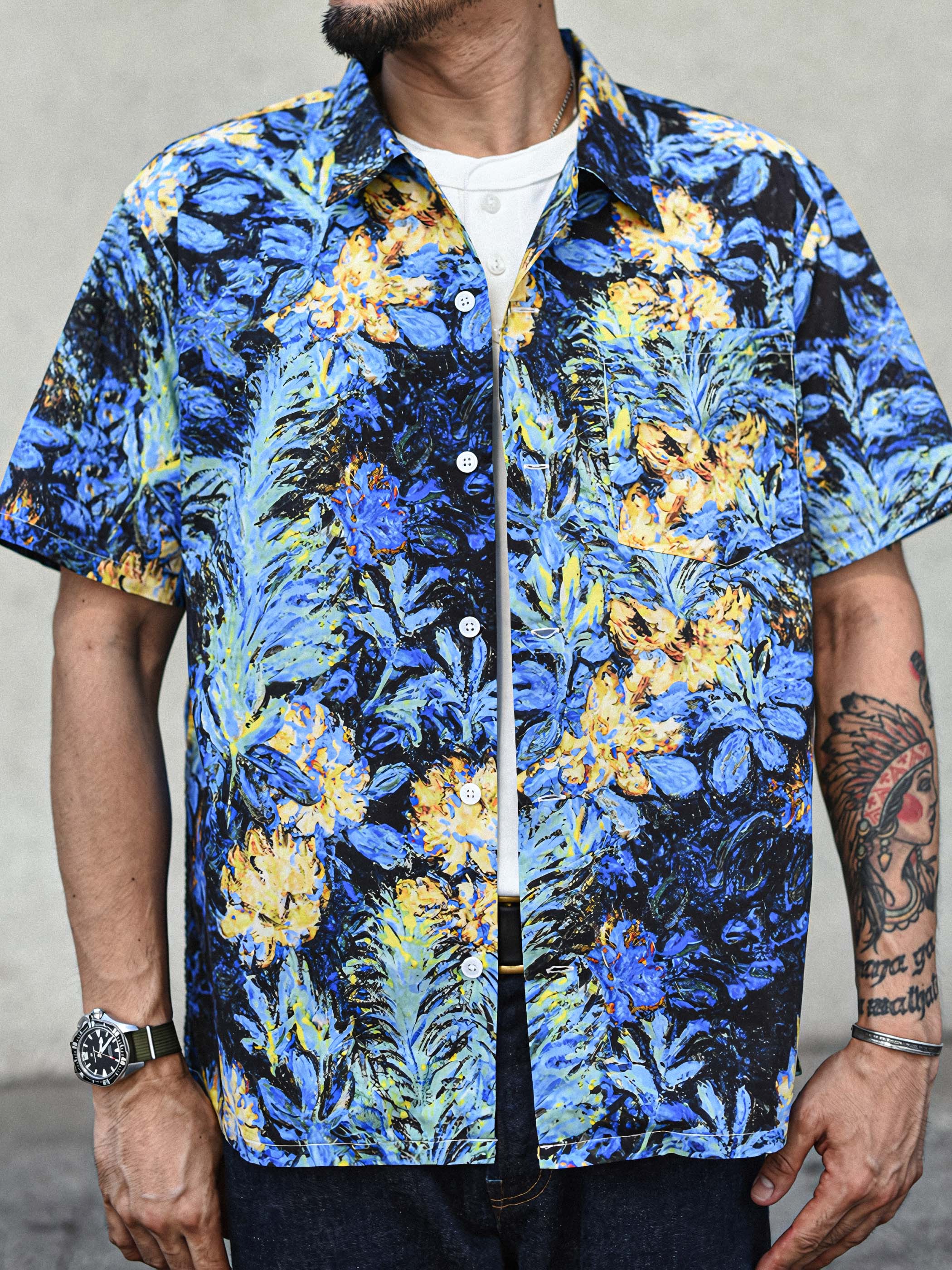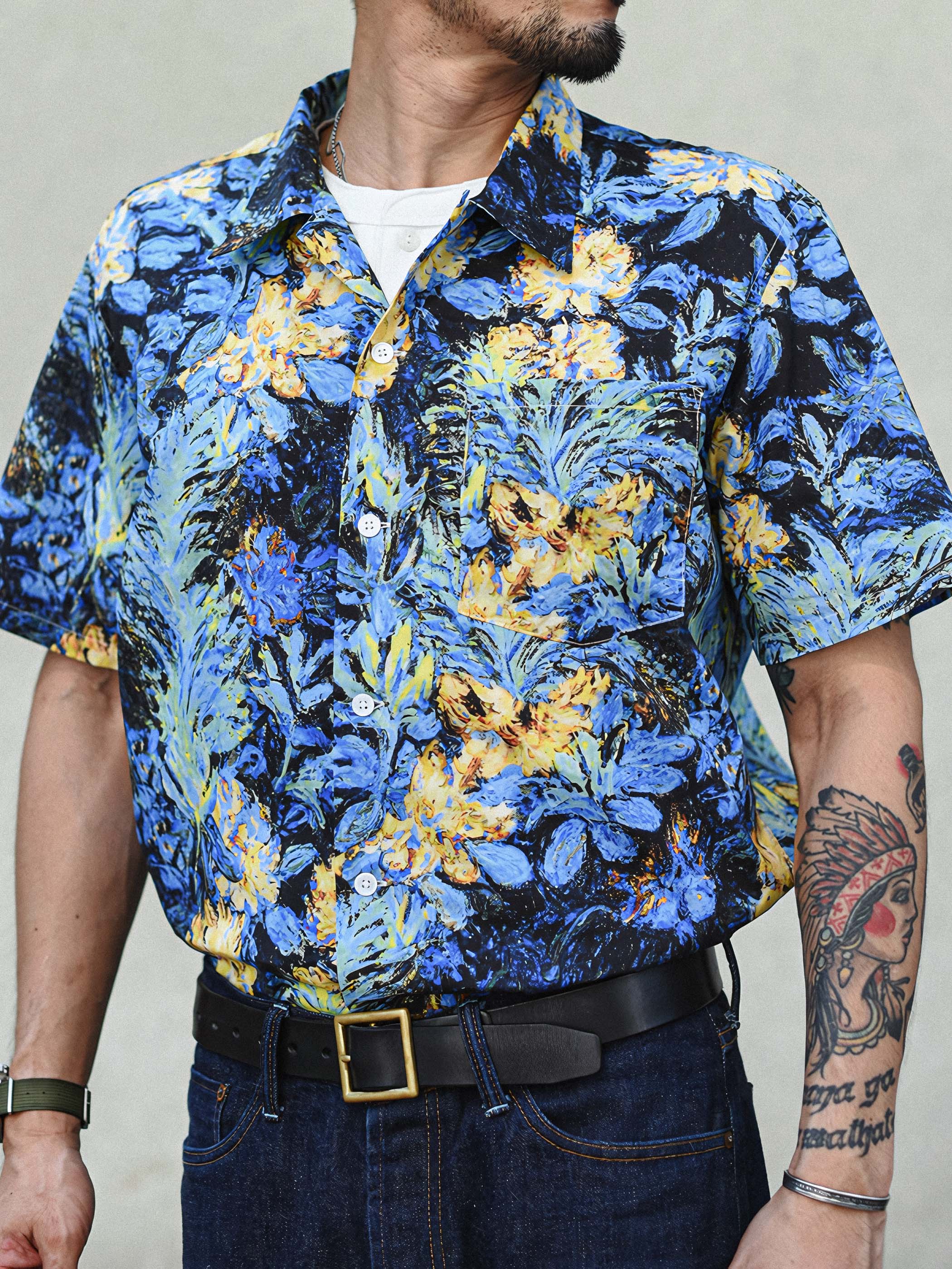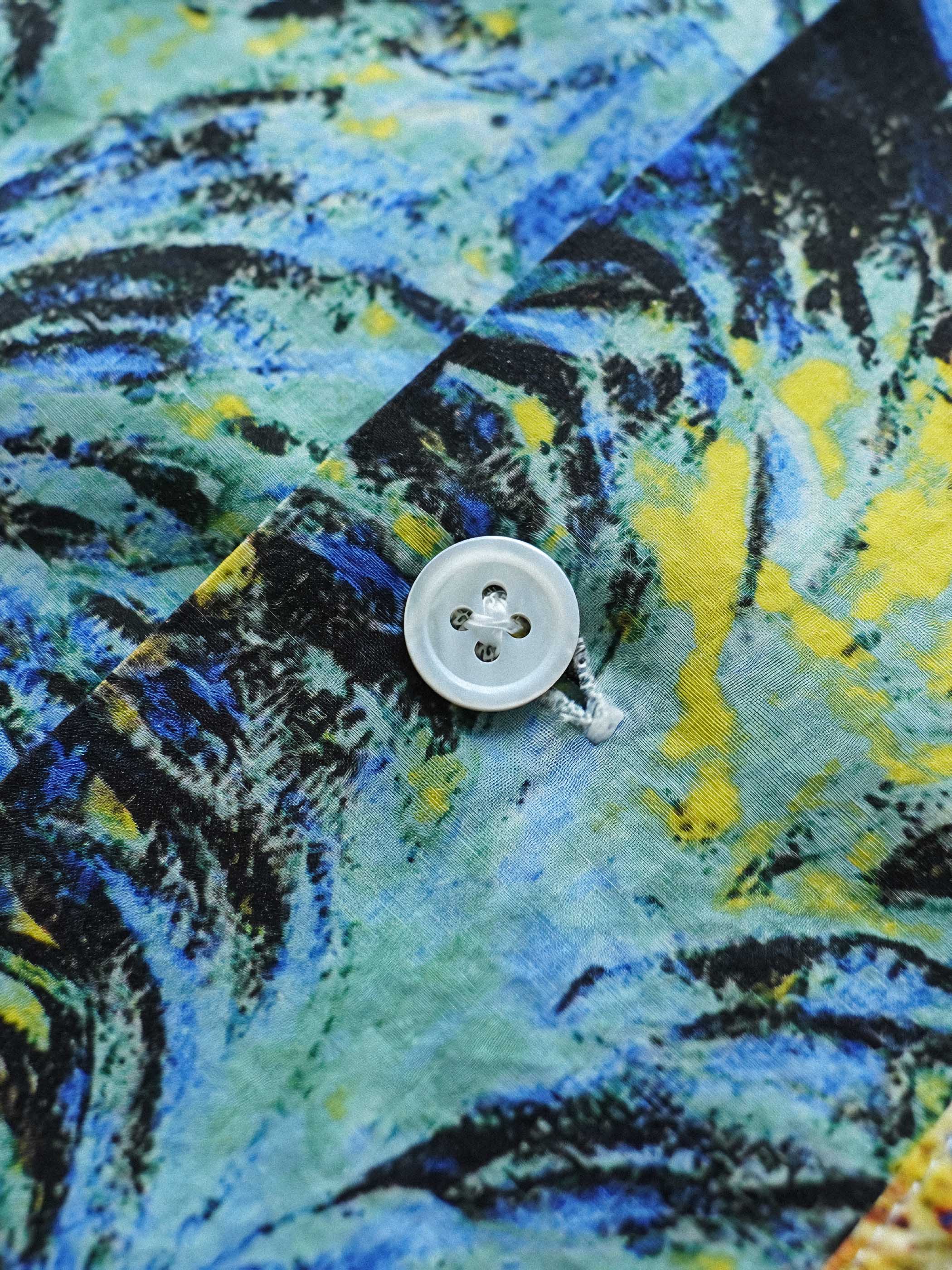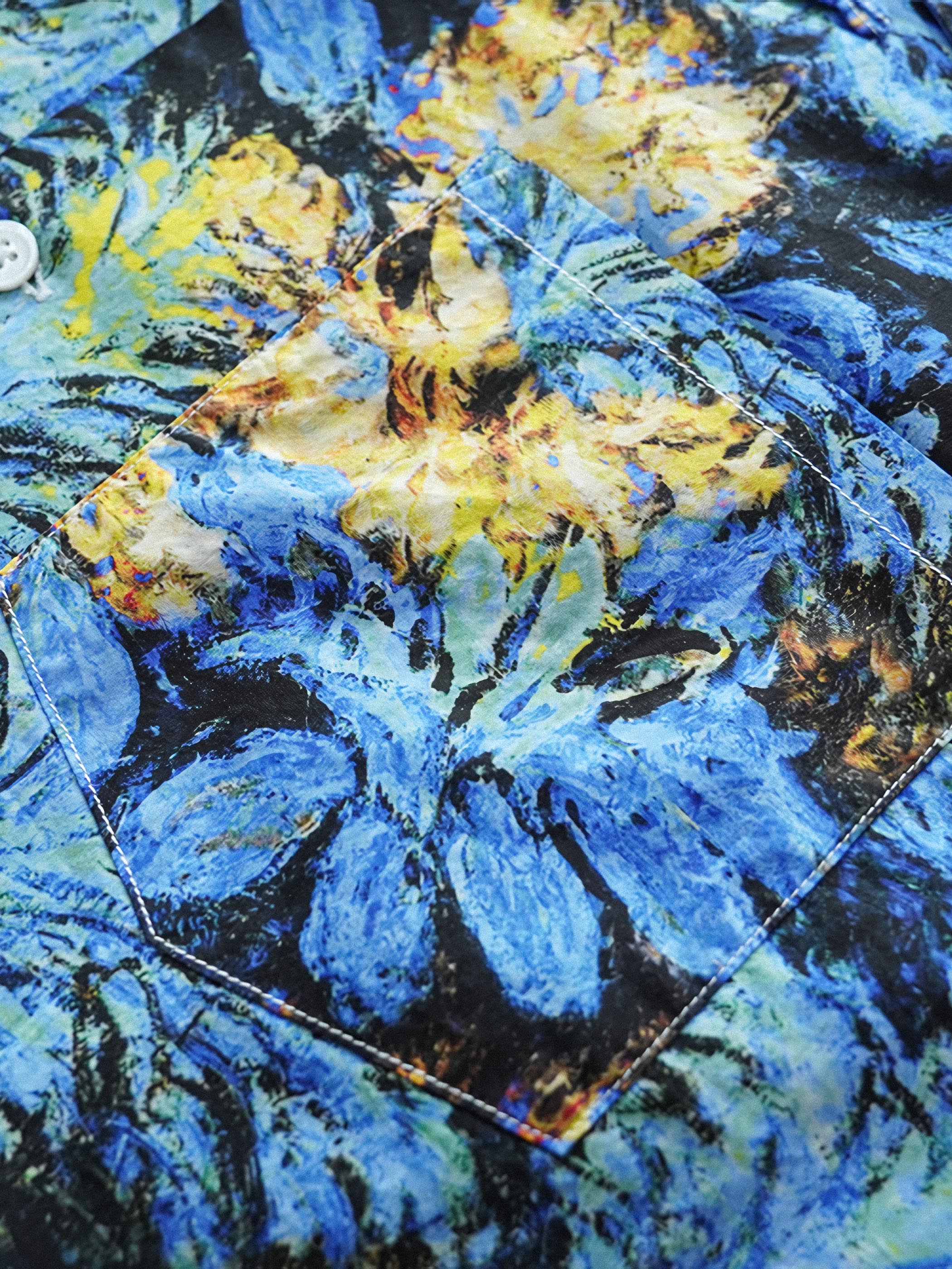 シャツには明るい油絵風のプリントが施され、独特の触感と質感が高品質感を表現しています。シルクのような光沢と相まって、豪華な雰囲気を演出します。