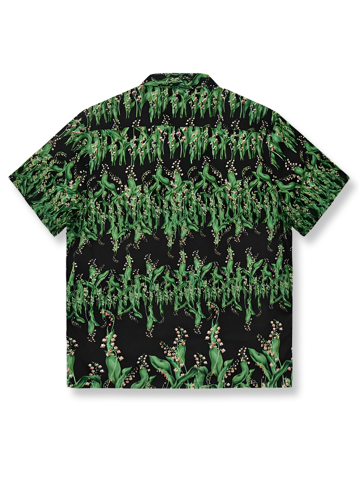 このシャツは、グリーンとピンクのカンパニュラの花をあしらった鮮やかな柄が特徴的です。カンパニュラ柄のシャツは、春や夏にぴったりの明るく爽やかな印象があります。