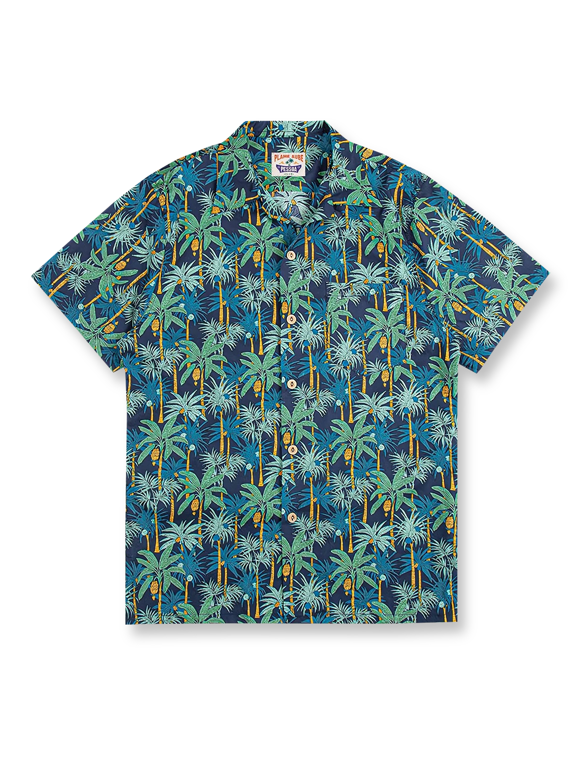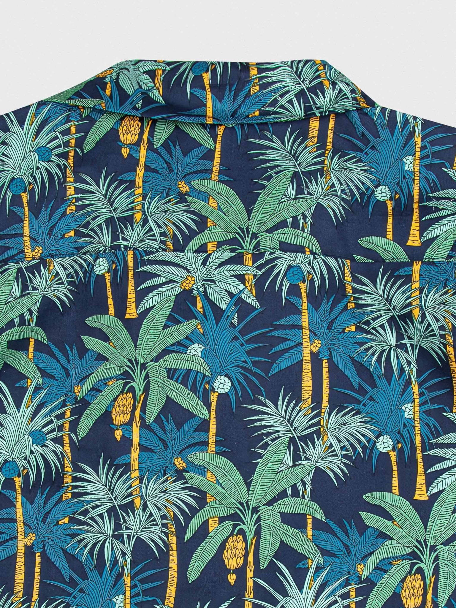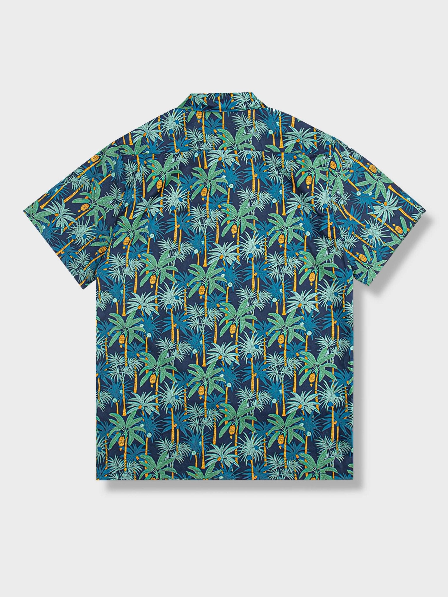 このシャツは、大面積のヤシの木をあしらった鮮やかな柄が特徴的です。ヤシの木柄のシャツは、夏にぴったりの明るく爽やかな印象があります。