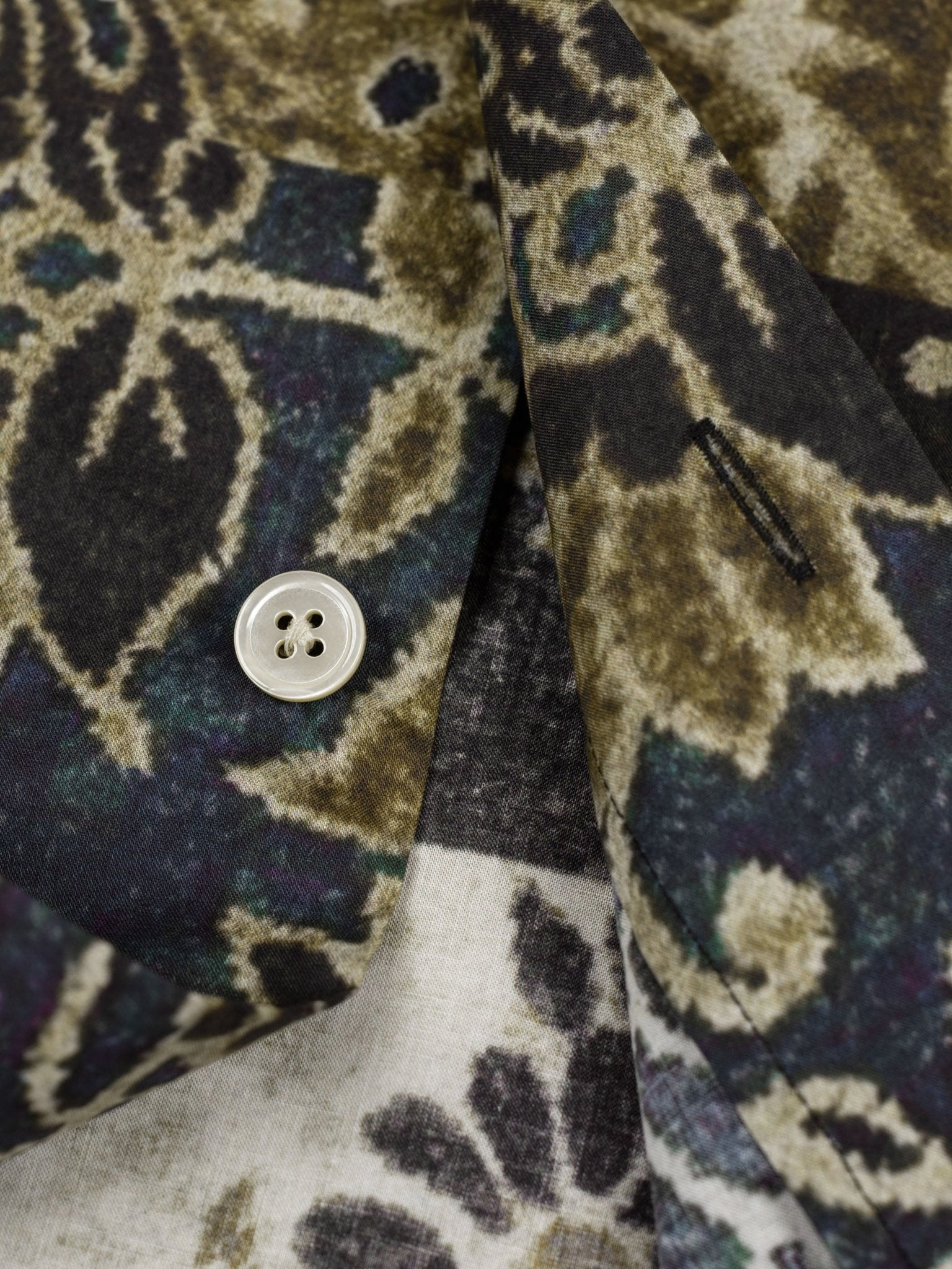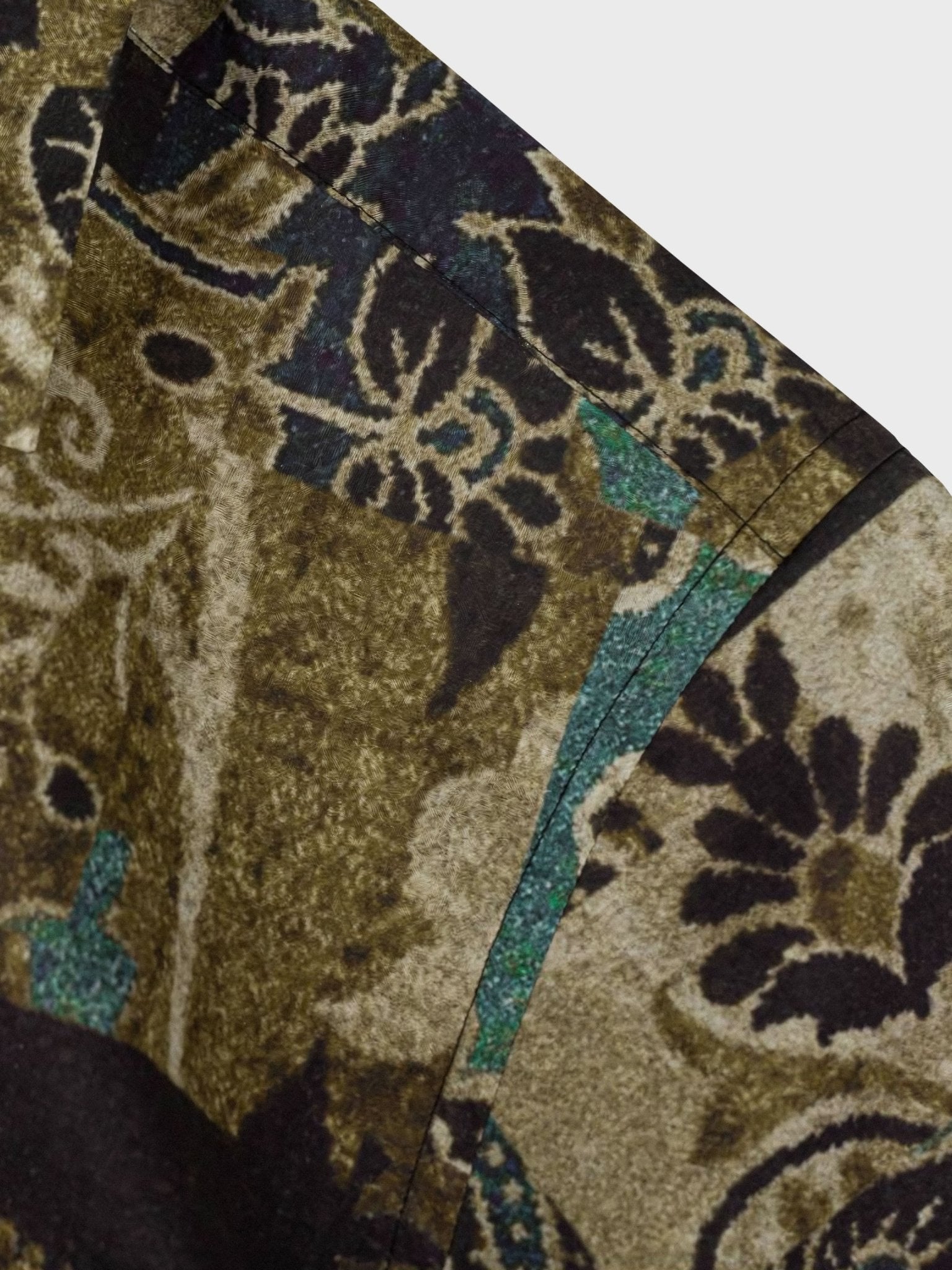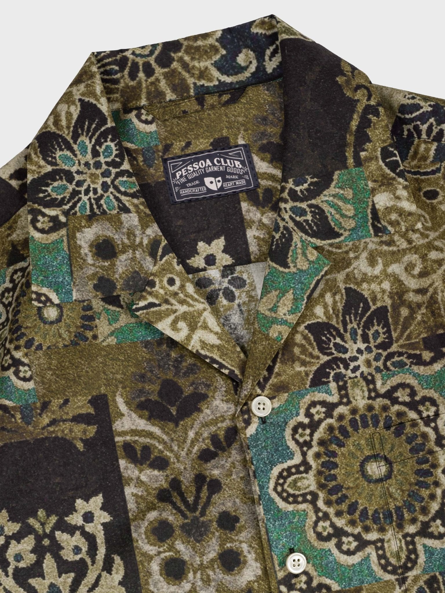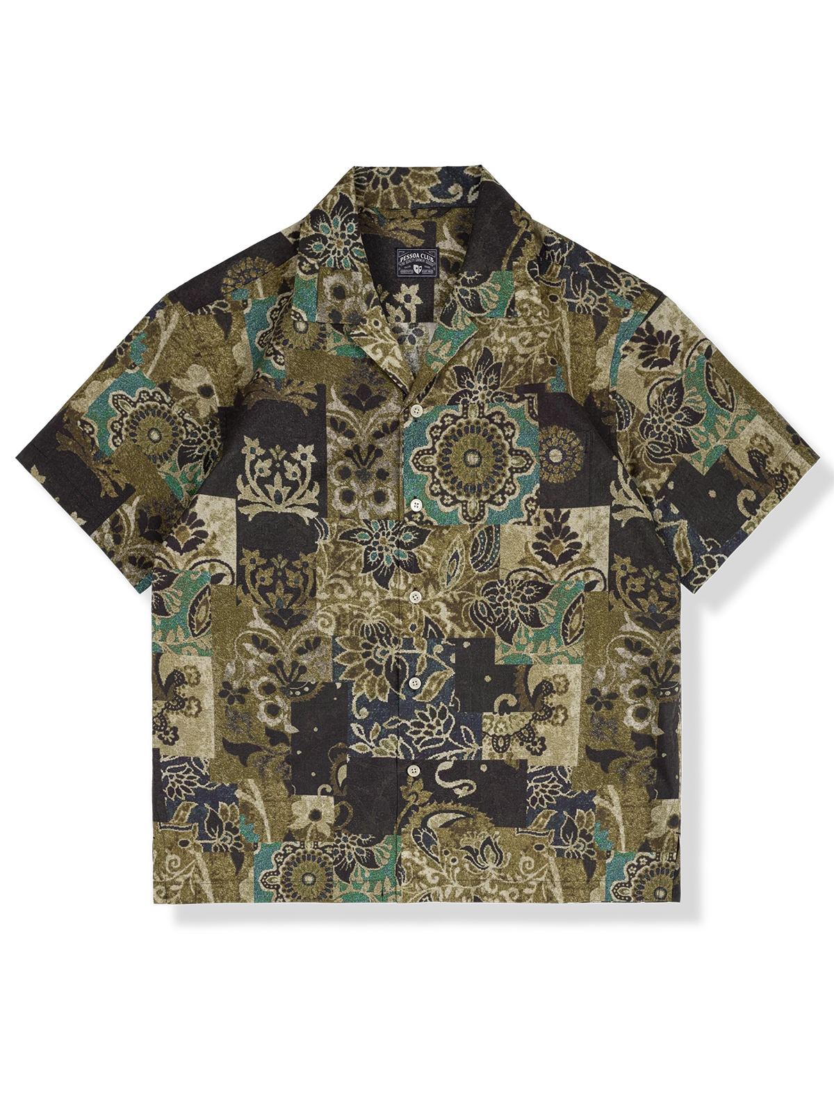 こちらはレトロな雰囲気が漂うアロハシャツで、大小や柄の異なる布地が巧みに組み合わされています。それぞれの布地は独特の風合いや色彩を持っていますが、調和して落ち着いた棕緑色合わせを作り出しています。自然やシンプルなスタイルが好きな方にお勧めです。