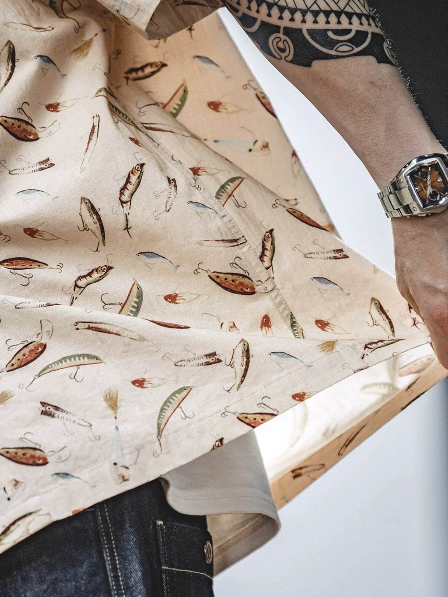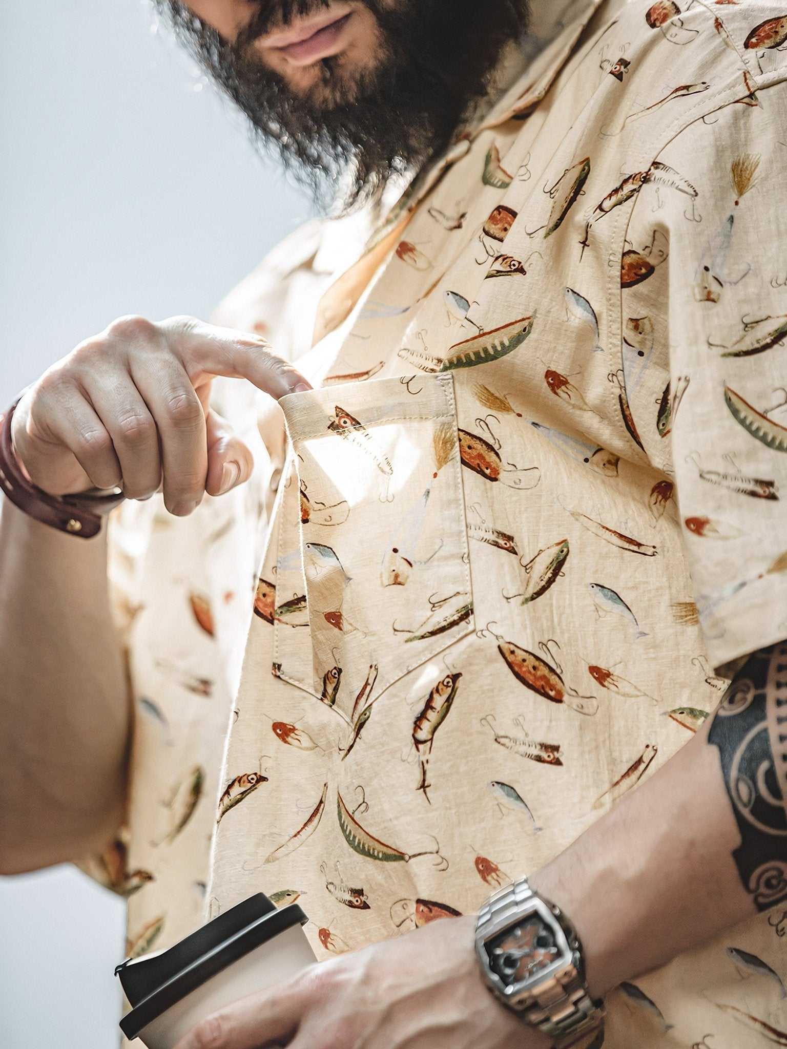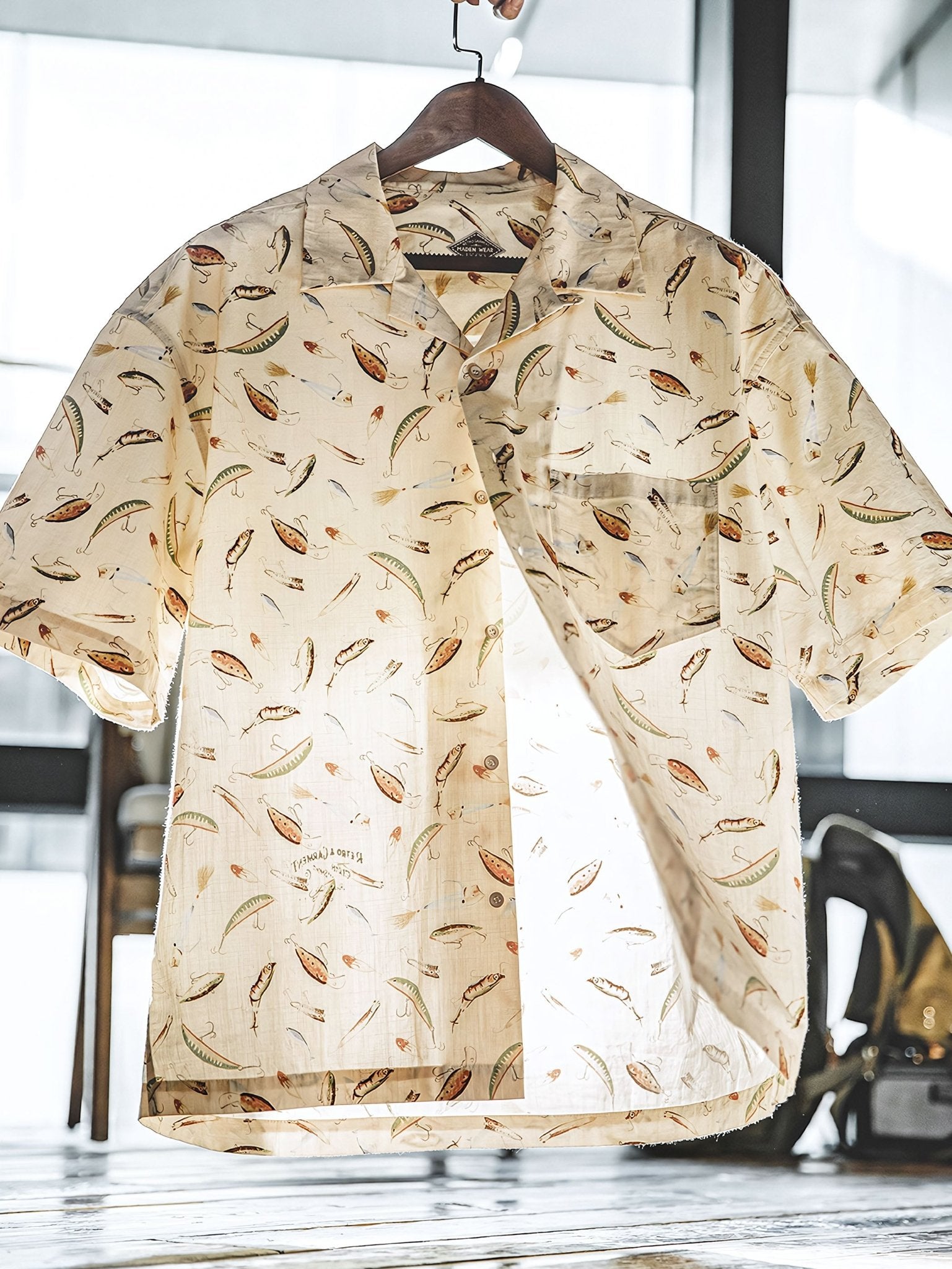 ルアーフィッシングのプリントにはカートゥーン風の水墨処理が施されています。古くから伝わるキューバカラーと胸ポケットのクラシックなデザインはそのままに、純粋なスラブコットンの素材を使用しています。ボタンには同色系の木製のボタンを特別にカスタマイズし、細部まで品質感を引き立てています。