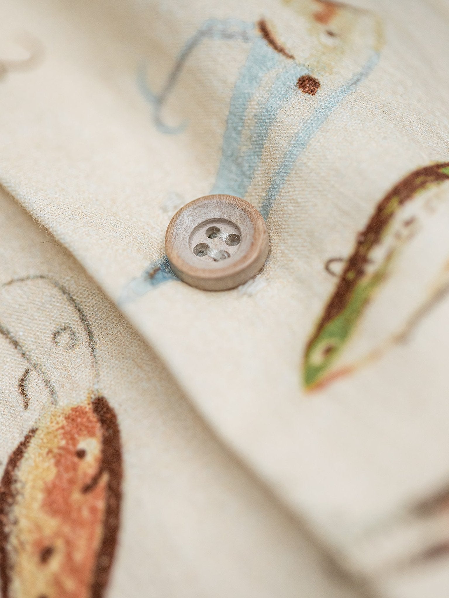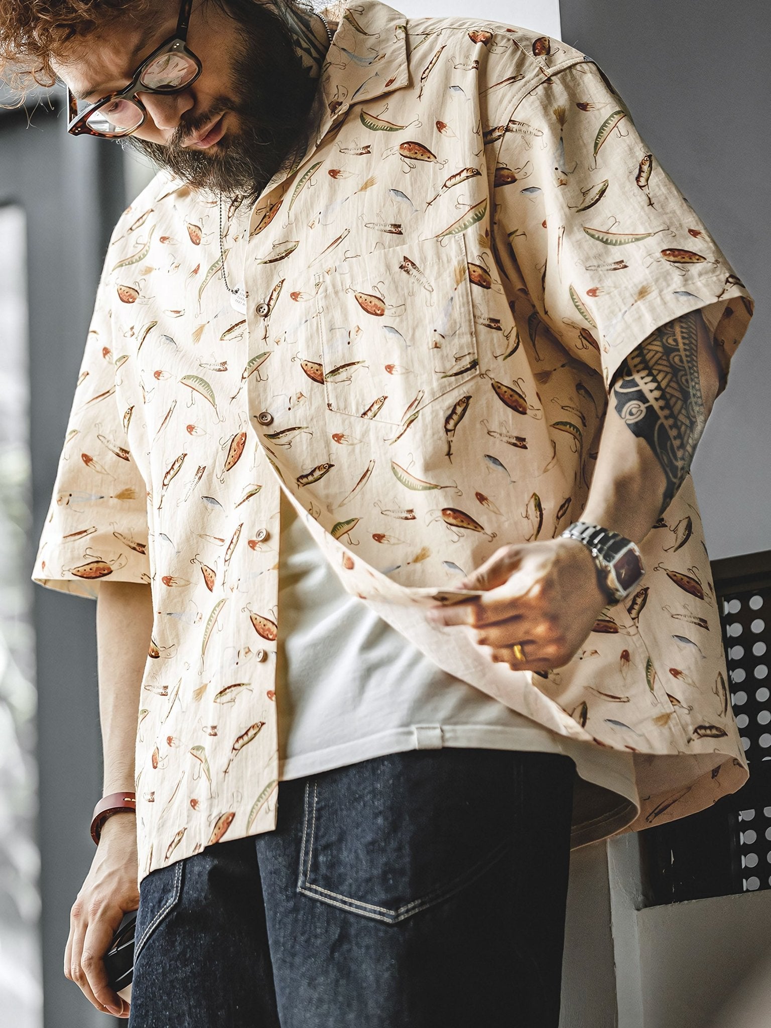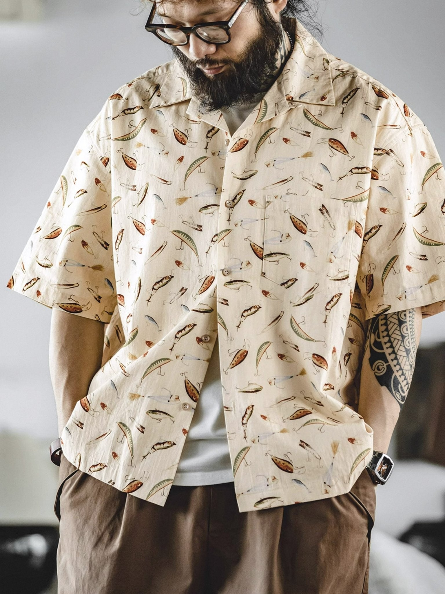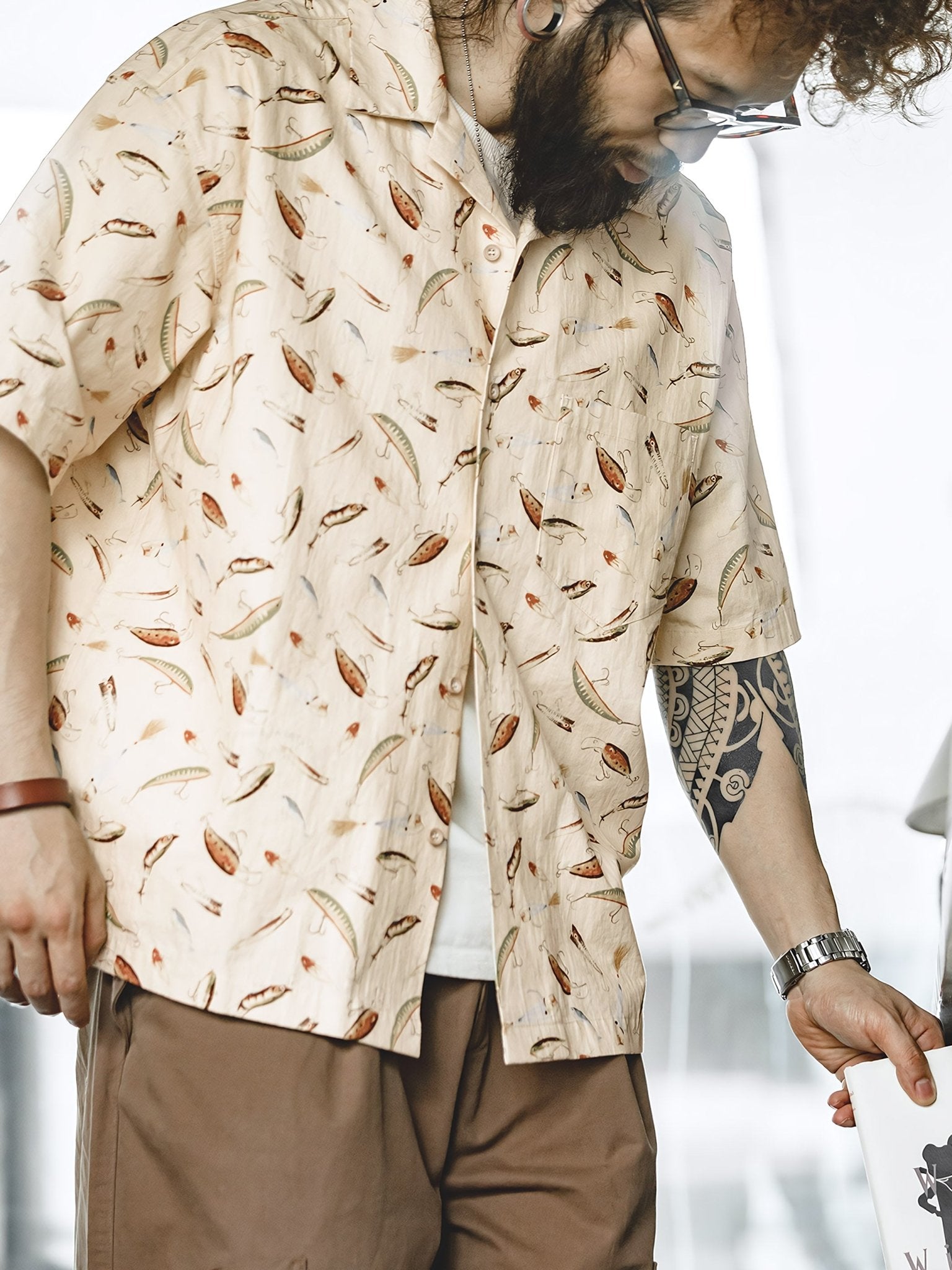 ルアーフィッシングのプリントにはカートゥーン風の水墨処理が施されています。古くから伝わるキューバカラーと胸ポケットのクラシックなデザインはそのままに、純粋なスラブコットンの素材を使用しています。ボタンには同色系の木製のボタンを特別にカスタマイズし、細部まで品質感を引き立てています。
