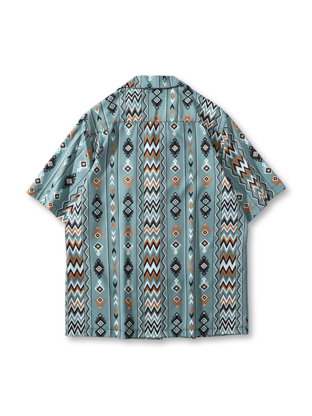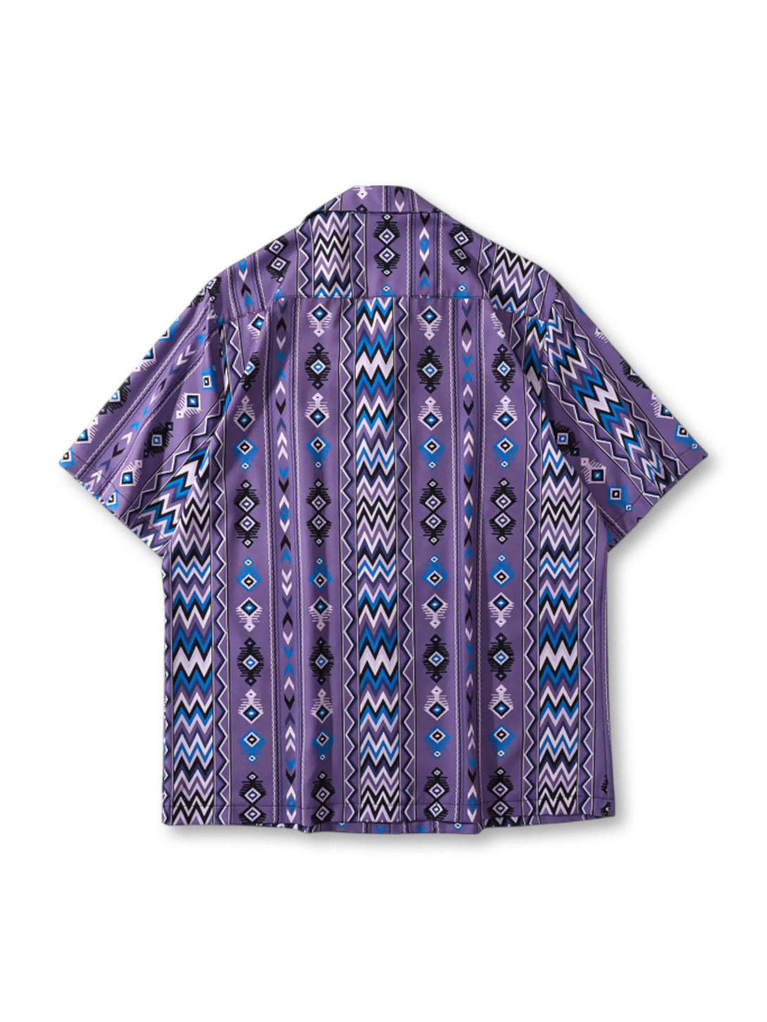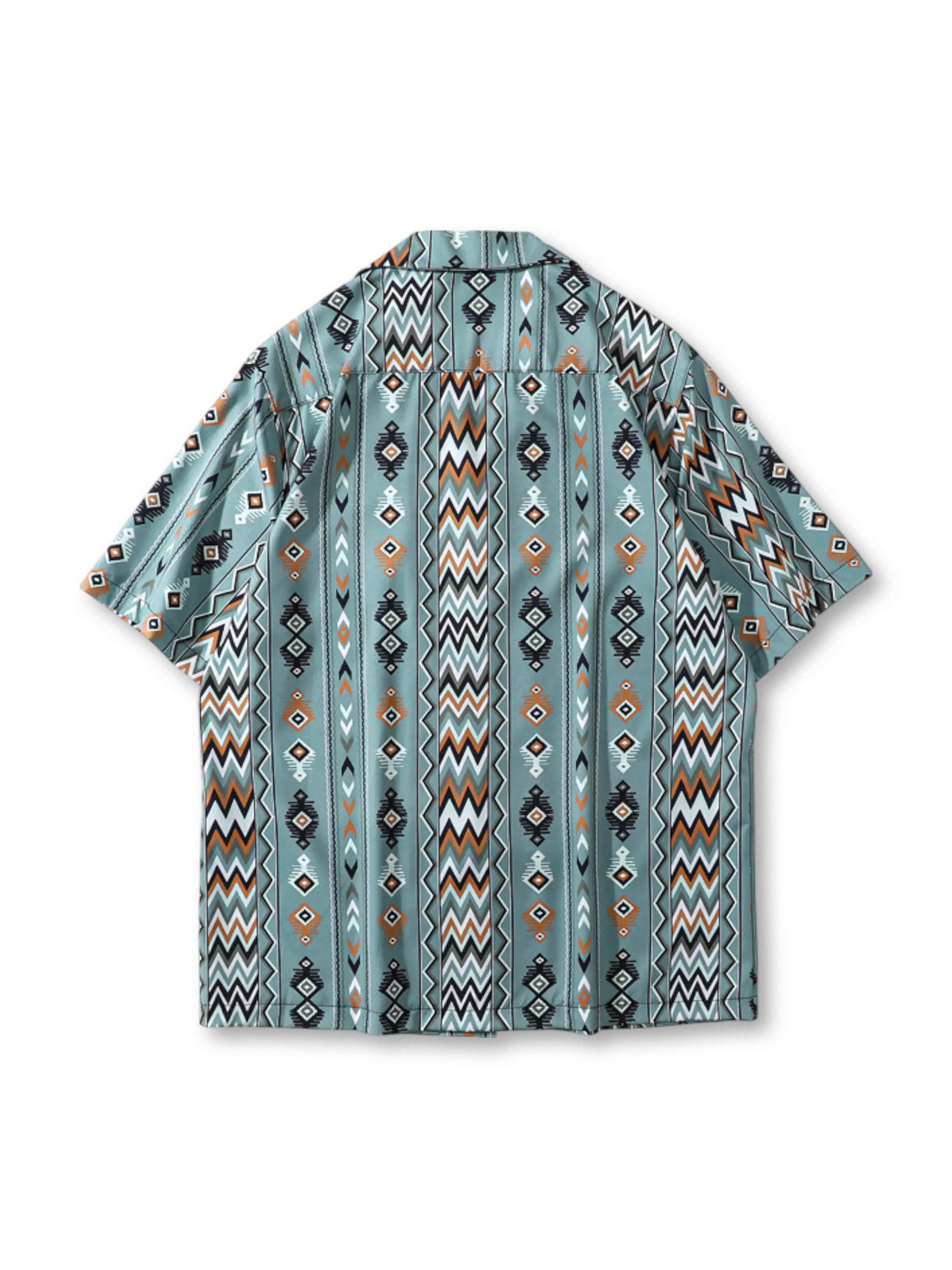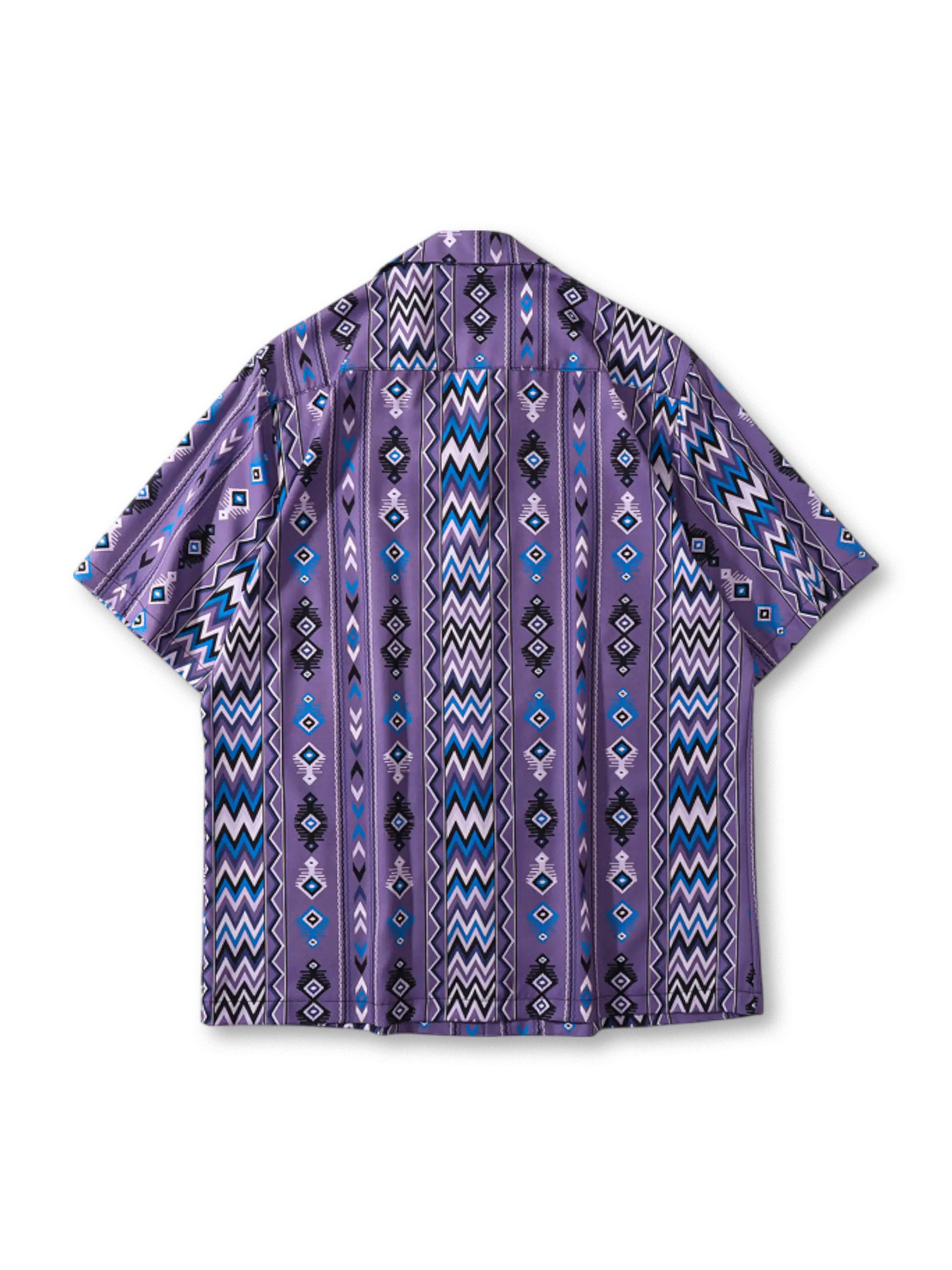 鮮やかなジグザグストライプと幾何学模様を組み合わせたトライバルプリントが、リゾートからタウンユースまで映える一枚。100%ポリエステルの速乾性生地はシワになりにくく、紫・ミントの2色から選べるバリエーションも魅力。開襟キューバカラーとドロップショルダーのリラックスシルエットで、ショーツやライトデニムとも好相性です。