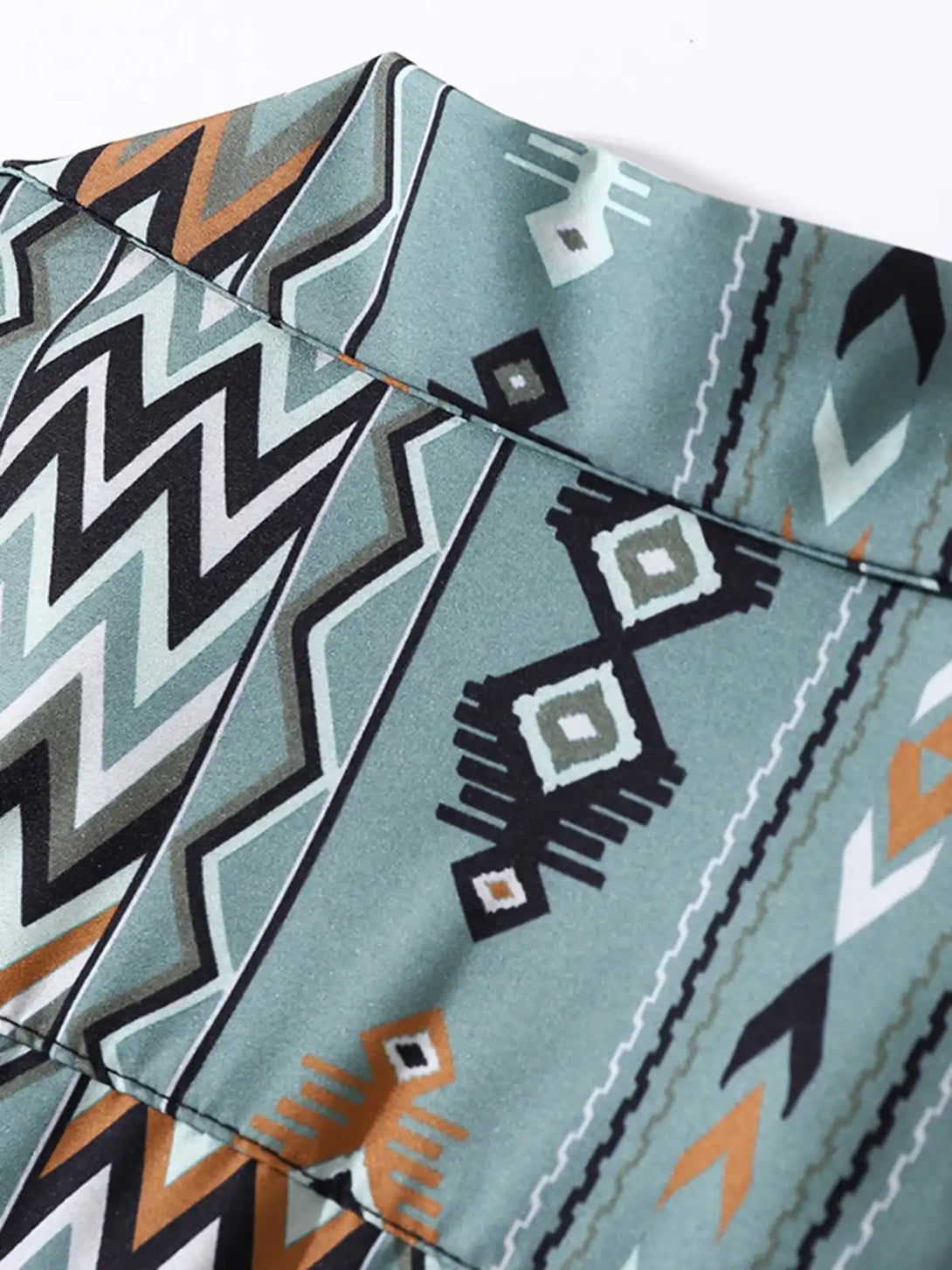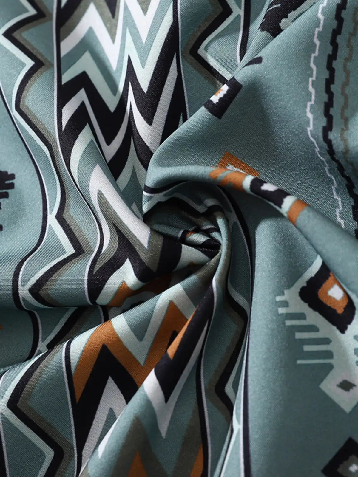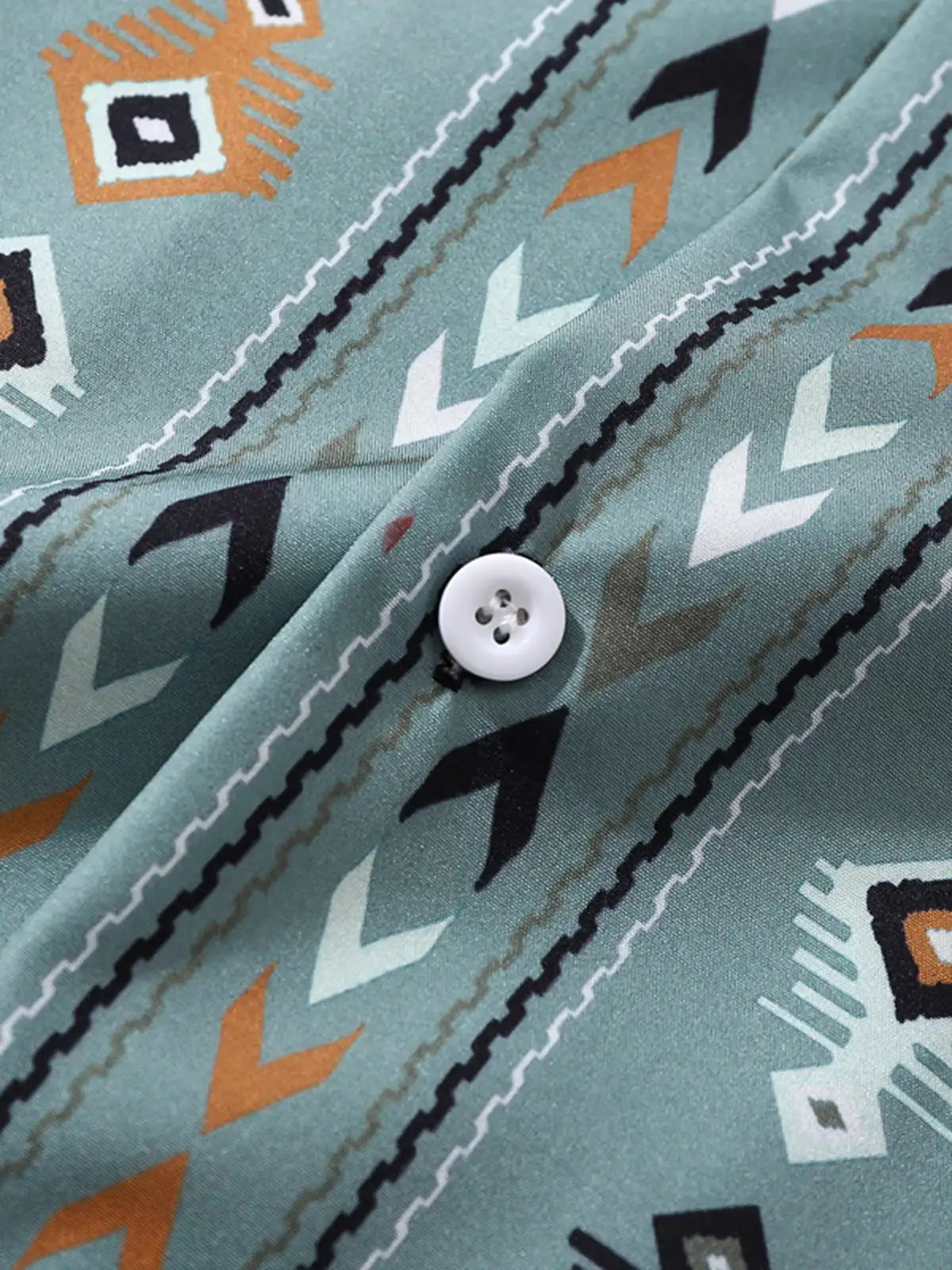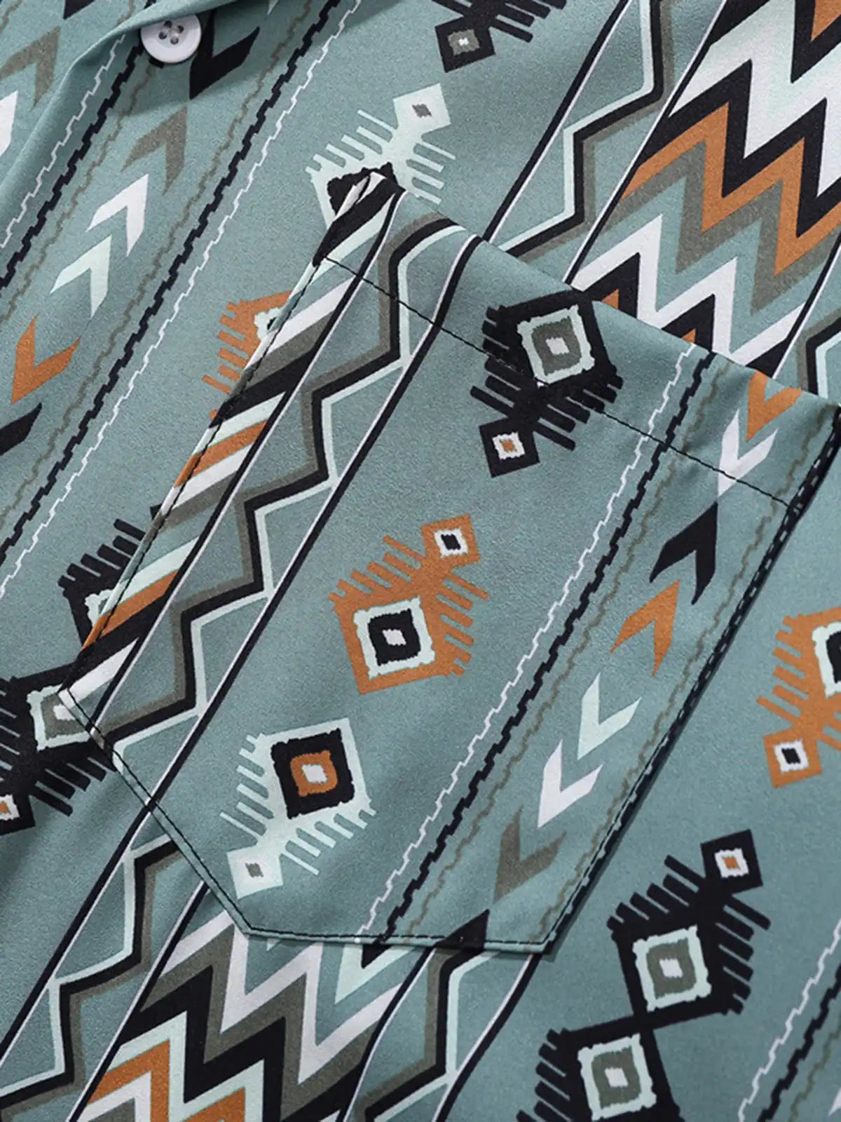 鮮やかなジグザグストライプと幾何学模様を組み合わせたトライバルプリントが、リゾートからタウンユースまで映える一枚。100%ポリエステルの速乾性生地はシワになりにくく、紫・ミントの2色から選べるバリエーションも魅力。開襟キューバカラーとドロップショルダーのリラックスシルエットで、ショーツやライトデニムとも好相性です。