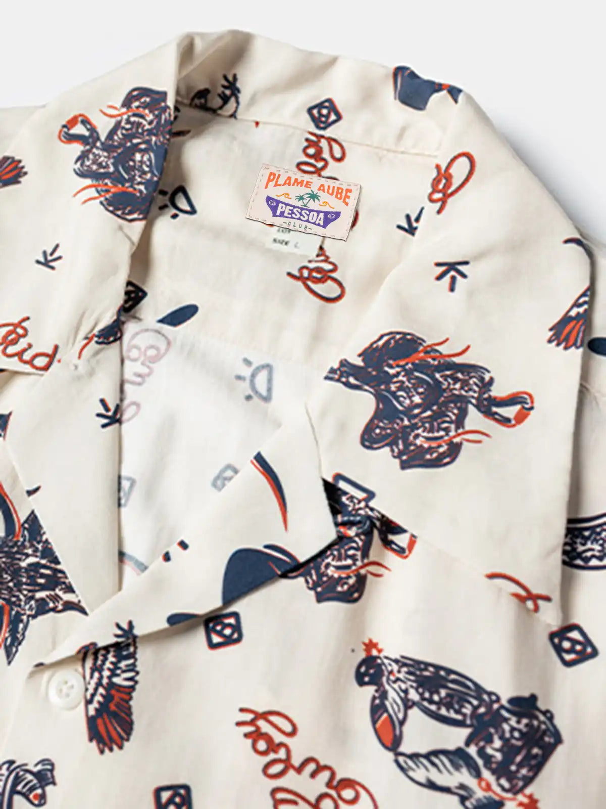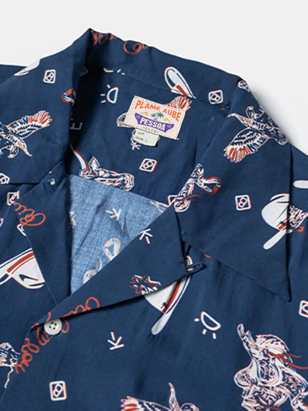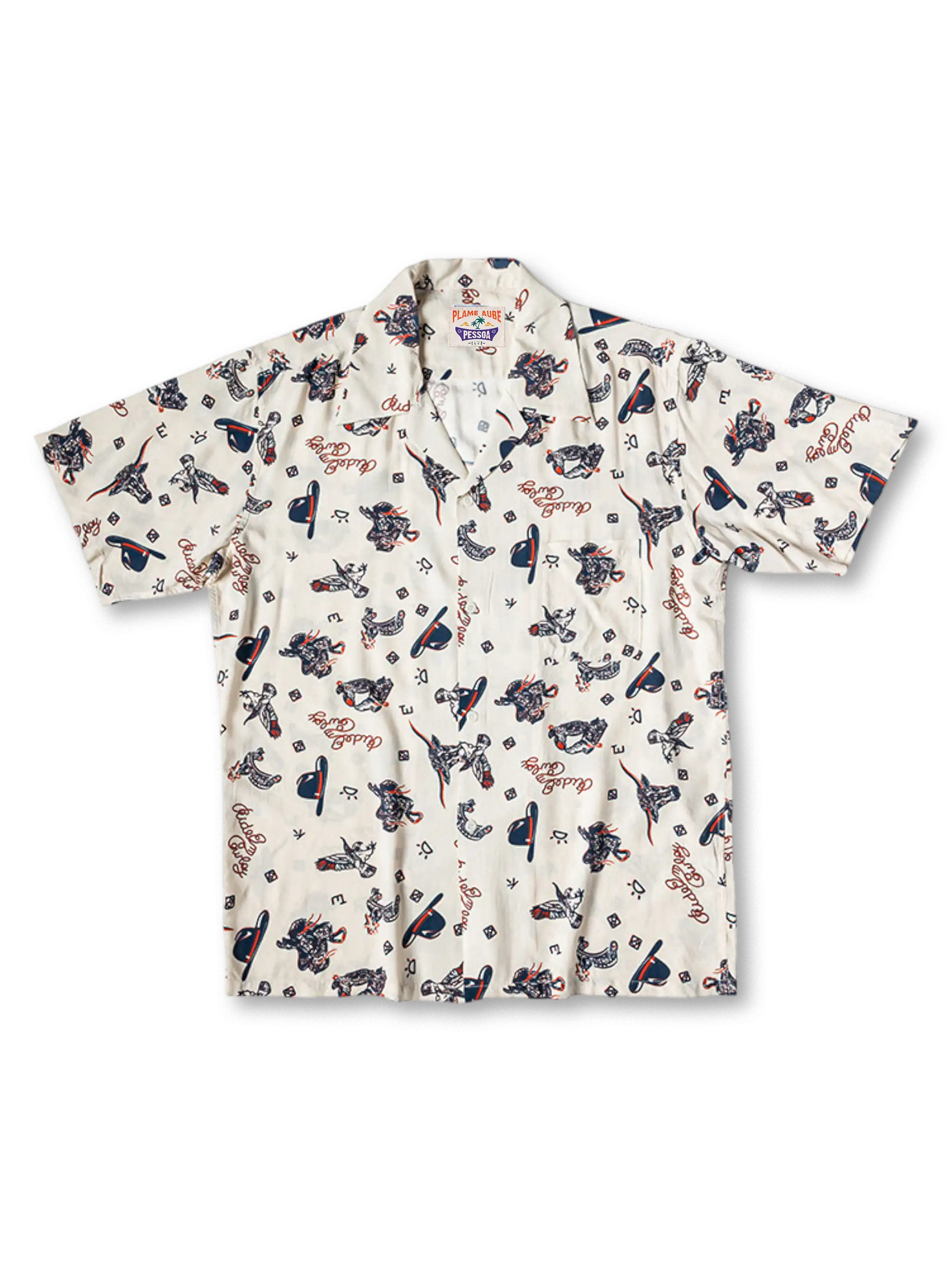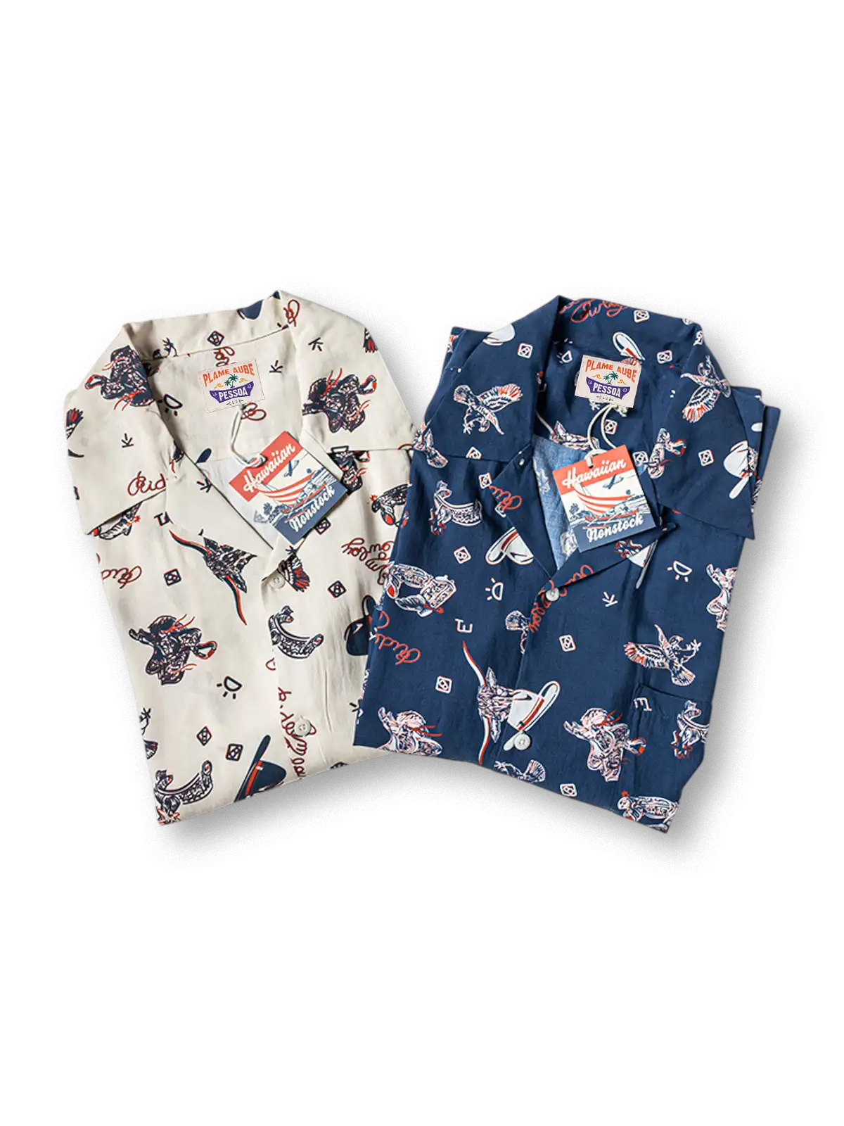 40年代のヴィンテージバンダナ(バンダナ)から着想を得た馬蹄、ブーツ、ハット、バッファロー、イーグル、牧場ロゴなどの西部モチーフを、触感のないプリントでレーヨン生地全体に大胆に配置。旧式キューバカラーとゆったりとしたボックスシルエットは、真夏でもリゾートやタウンで肩の力を抜いたリラックスムードを演出。100%レーヨンの40sヴィンテージシャンブレーツイル生地は、しなやかでありながら適度な厚みを持ち、汗をかいても肌にまとわりつかず、快適な着用感をキープ。ラウンドした裾とシンプルな胸ポケットがデザインに程よいアクセントを与え、ショーツやライトデニム、リネンパンツと合わせるだけで、上質な夏のカウボーイルックを完成させます。