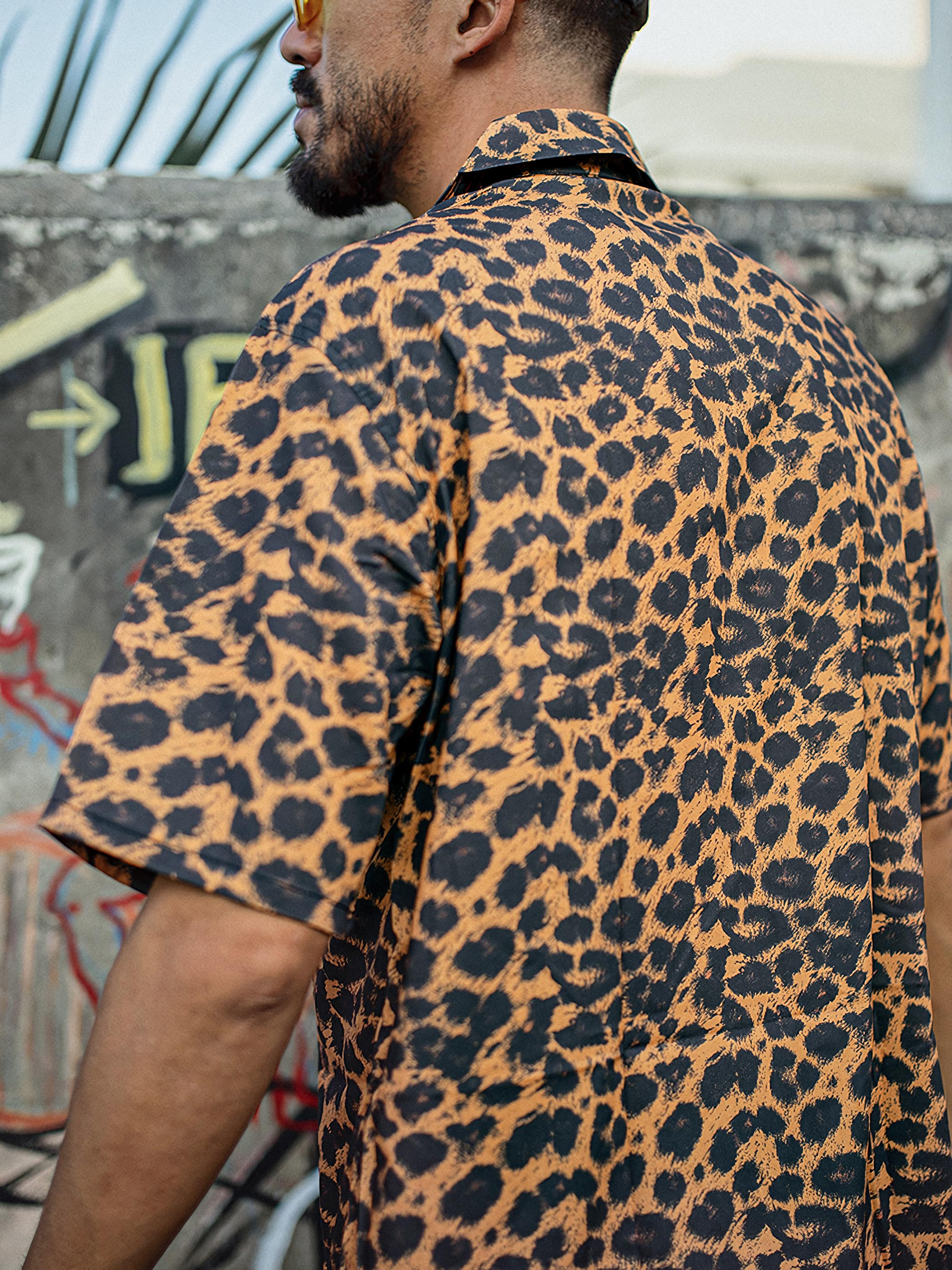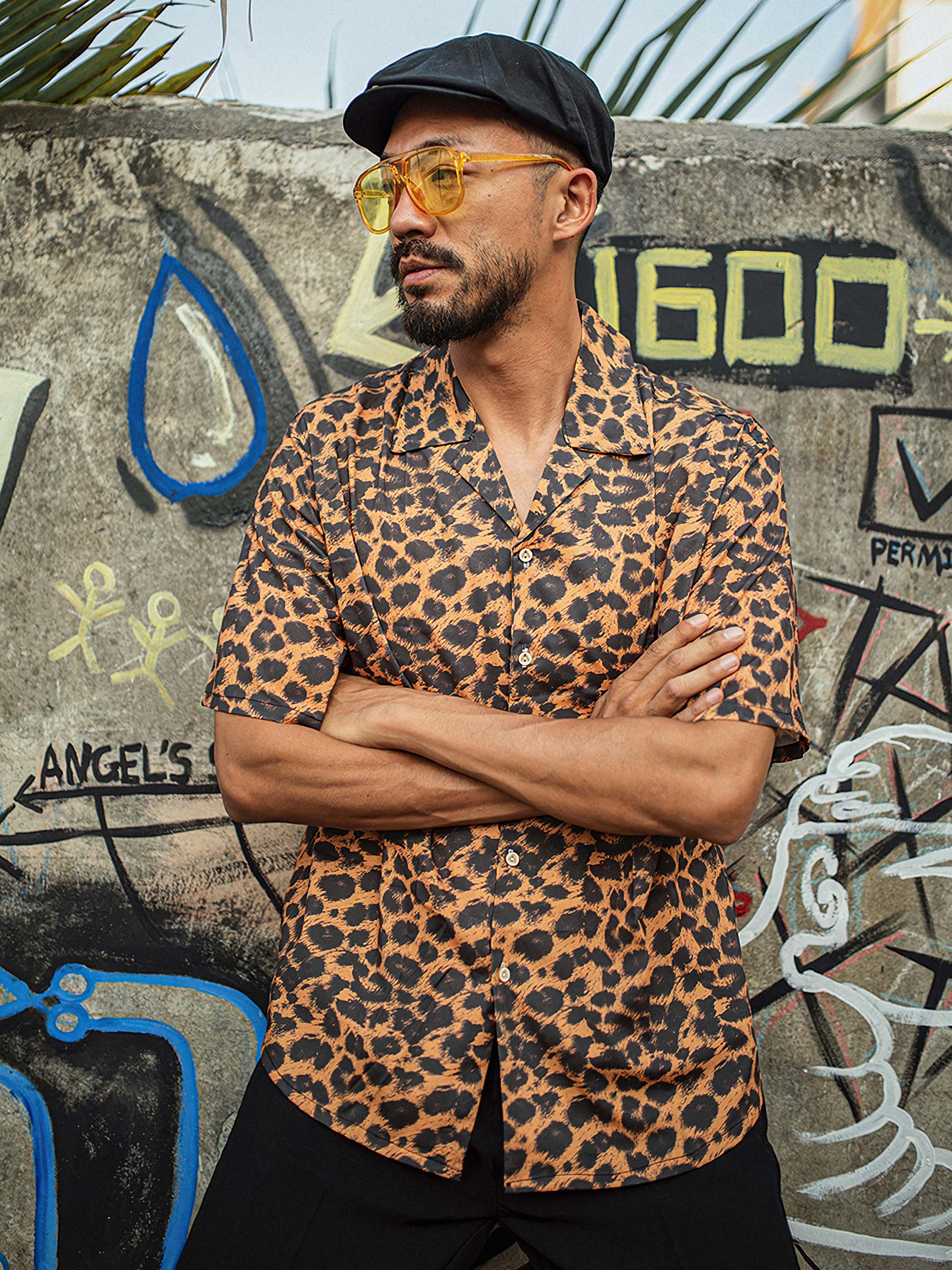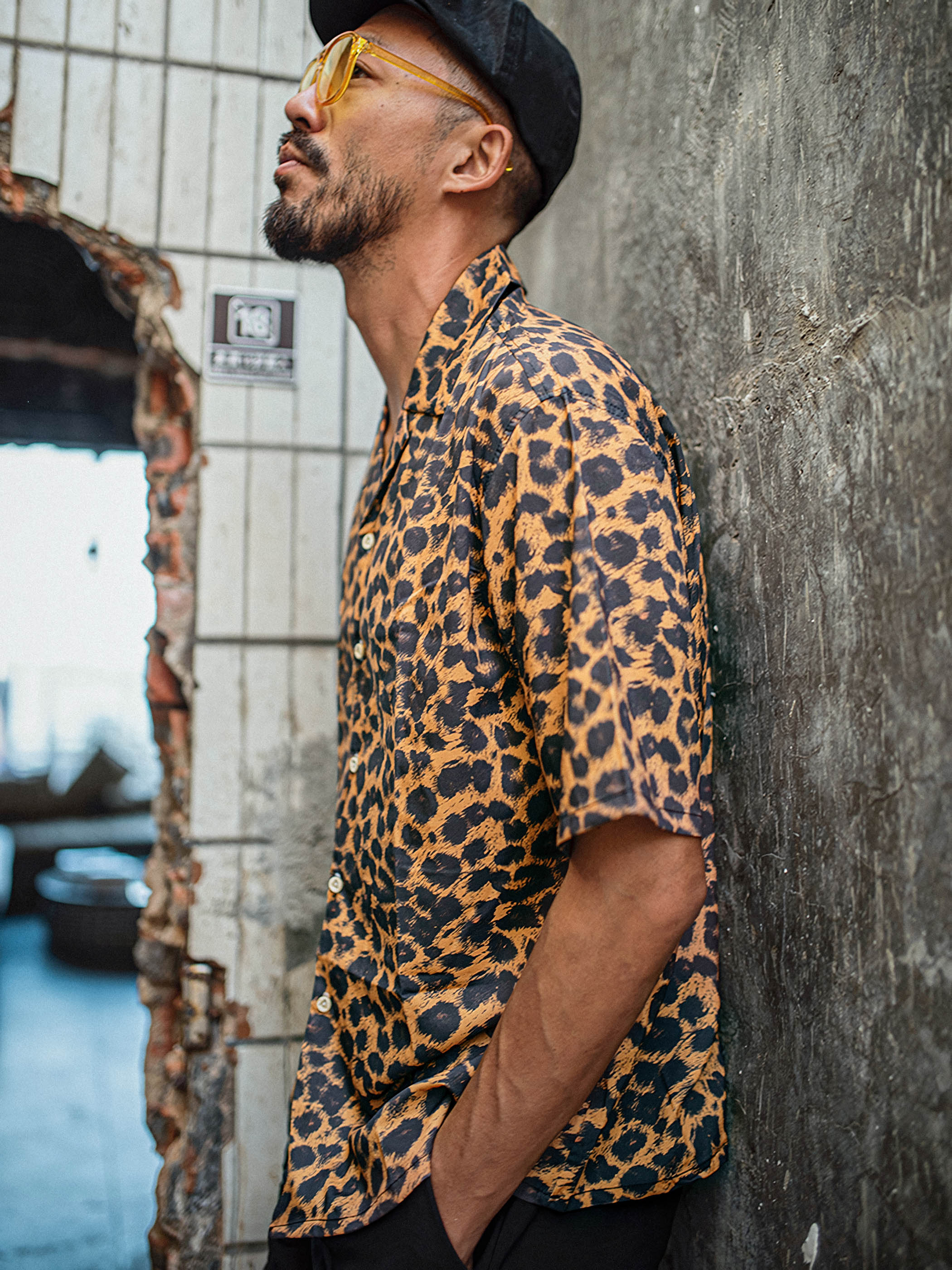 この アロハシャツは、独特なブラウンのヒョウ柄デザインでファッション性と個性を表現しています。キューバ襟のデザインはカジュアルさとスタイル感を加え、全体的なシャツをより特別で目を引くものにします。ヒョウ柄はファッションのトレンドに対応し、着る人に野性的で自信に満ちた雰囲気を与えます。
