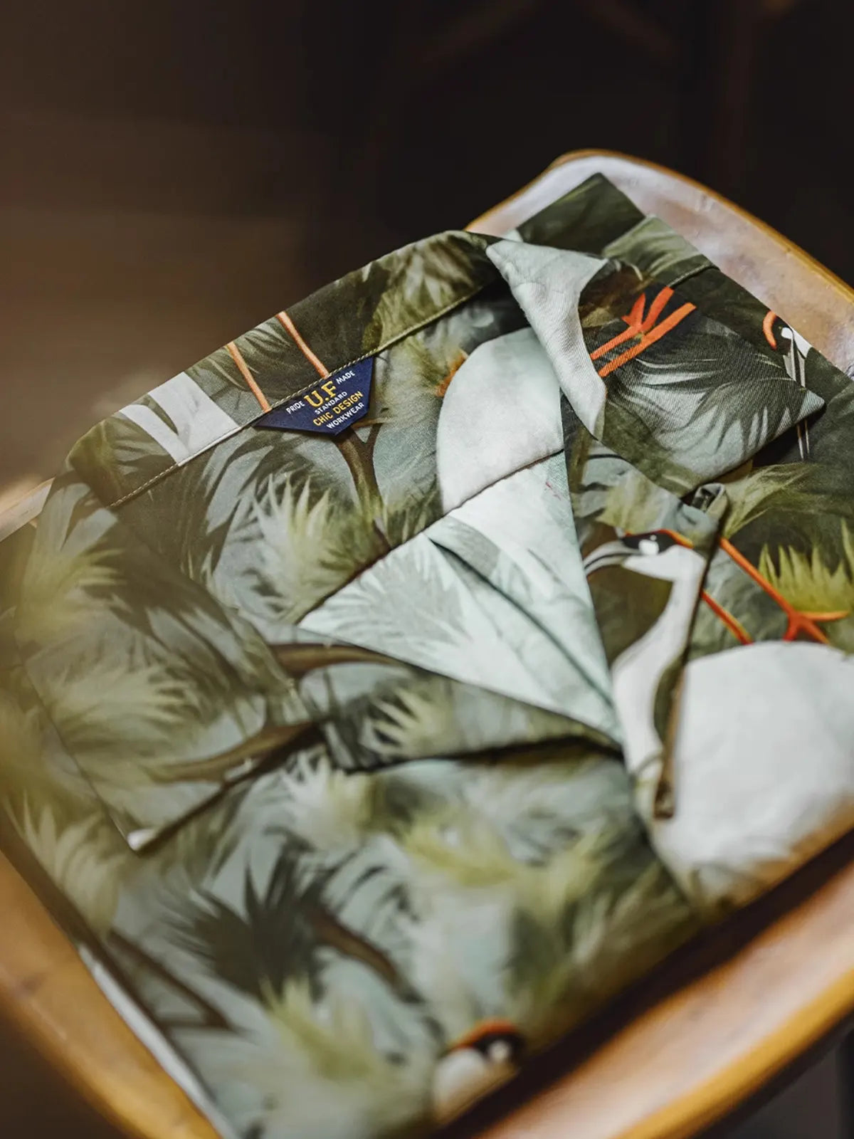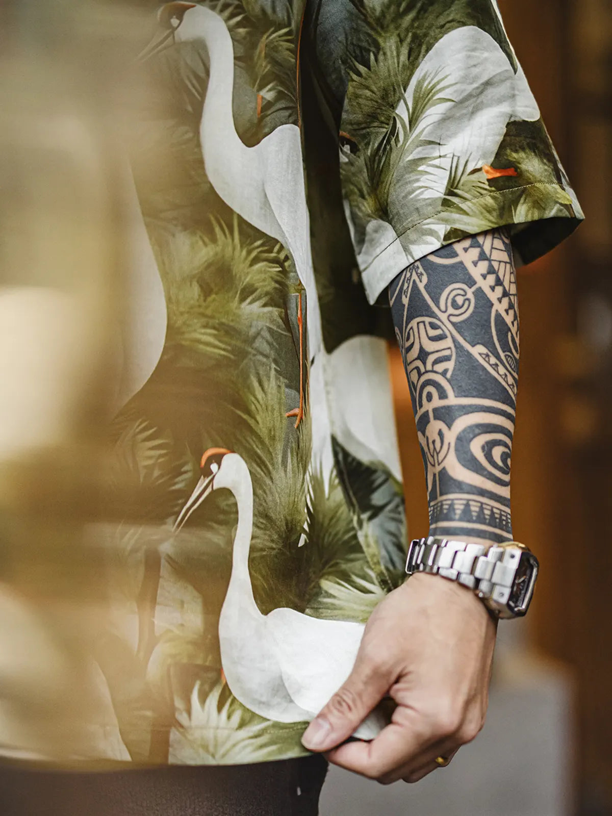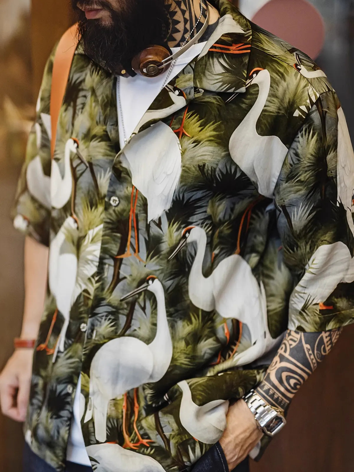 この開襟シャツは、日本の浮世絵美学を現代に解釈し、鶴と松を満艦飾にプリントしたデザインが視覚的な張力を放ちます。100%リヨセルの極細繊維は微細な通気孔を備え、さらりとした肌触りで汗ばむ季節にも爽快な着心地を実現。四眼の仮石ボタンや後襟のマイクロファイバーレザーパーツといった上質ディテールが、単体はもちろんジャケットのインナー使いにも映え、デニムやチノと合わせるだけで夏の着こなしに男らしい自信を添えます。