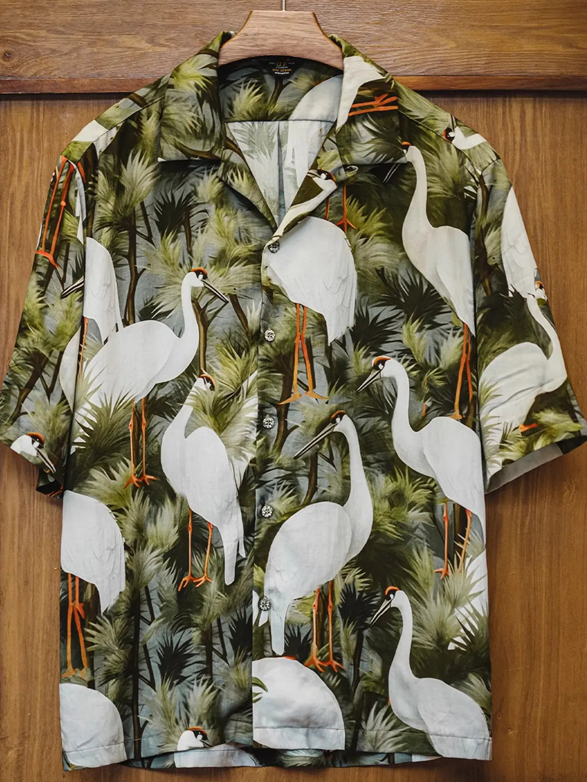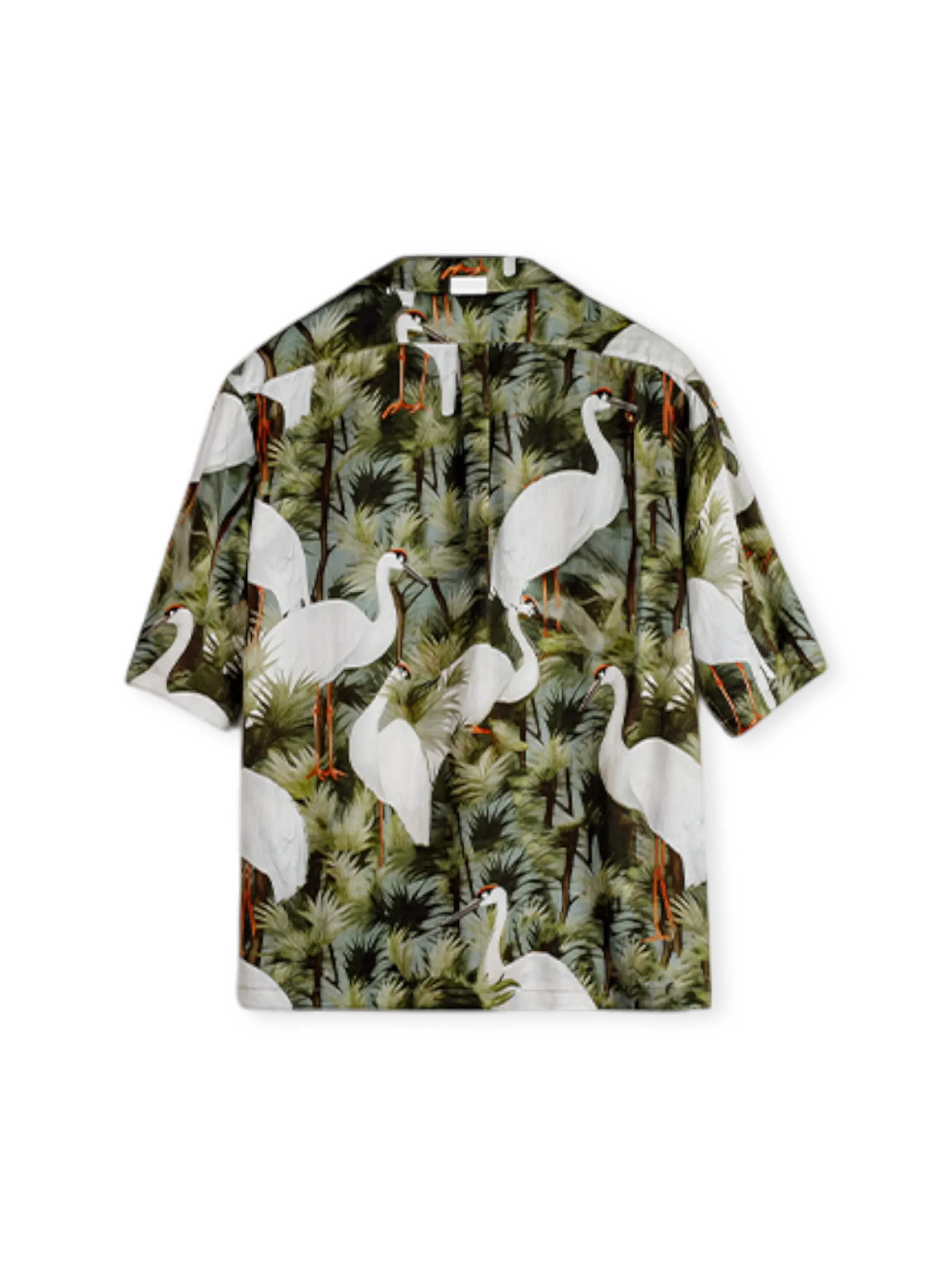 浮世絵の鶴と松を描いたグラフィックが映える、呼吸するリヨセル素材の開襟シャツ。