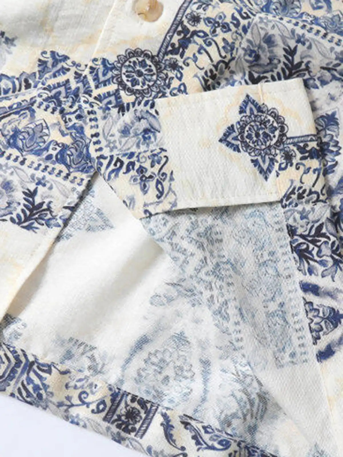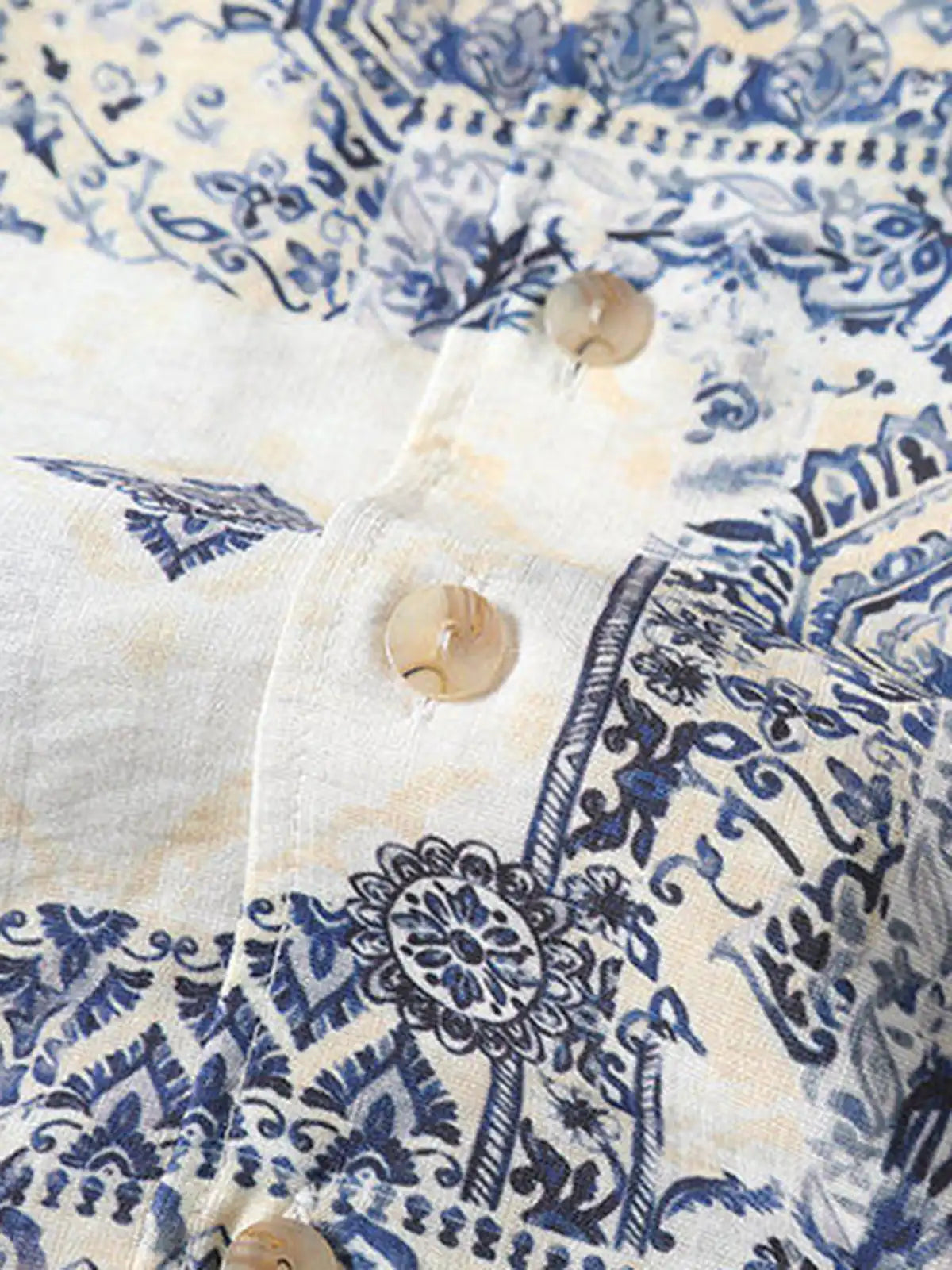 1930年代に南カリフォルニアで生まれたキューバカラーシャツのリラックスしたシルエットを踏襲しつつ、日本の古典陶磁器が描く繊細なブルー&ホワイトのタイル柄を全面にプリント。通気性とドレープ性に優れるポリエステル生地は夏場にも快適で、デニムにもチノにも合わせやすい一着です。