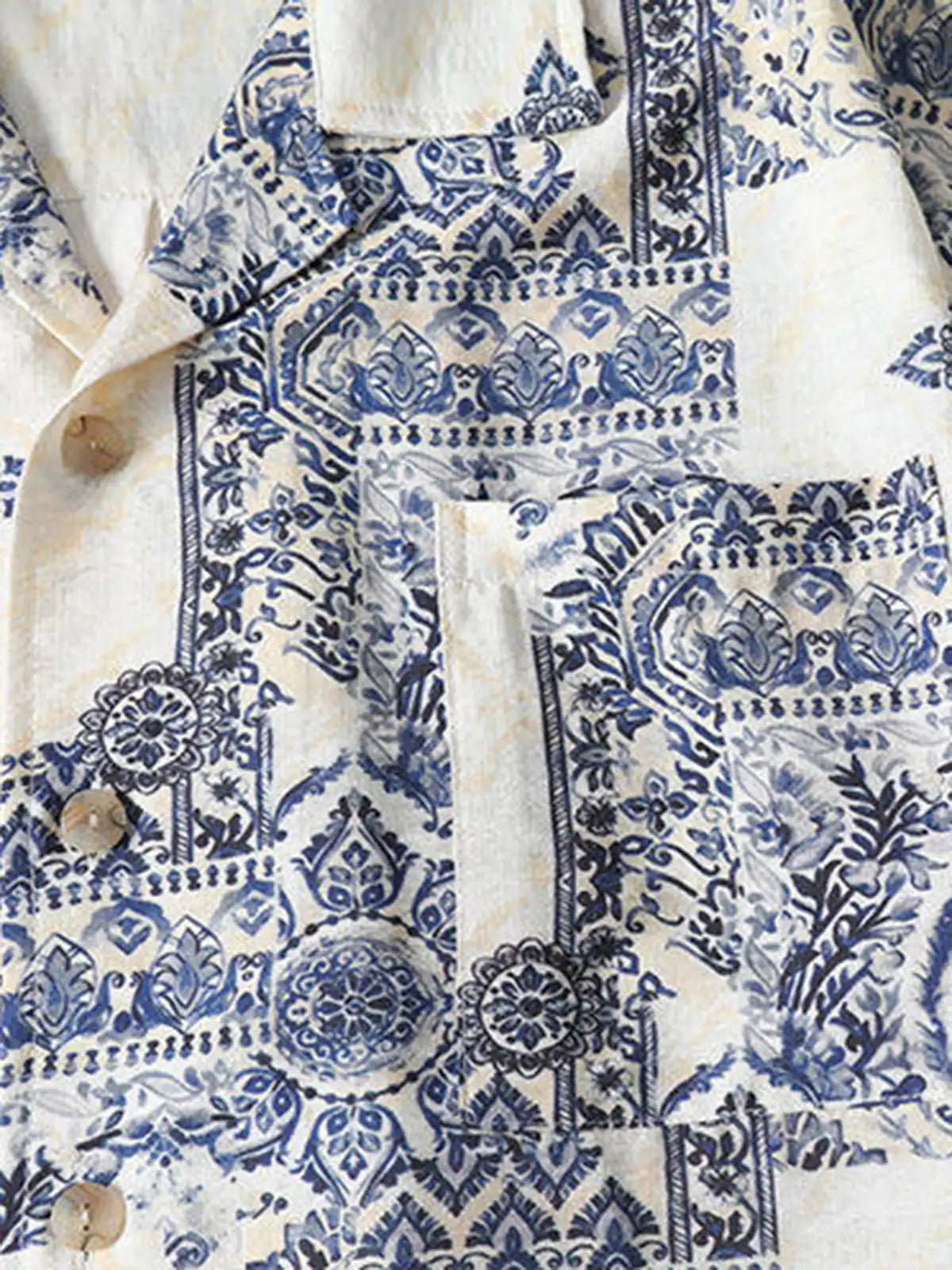 江戸期の伊万里焼を想起させるタイル柄がモダンな印象を与える、キューバカラーの半袖シャツです。