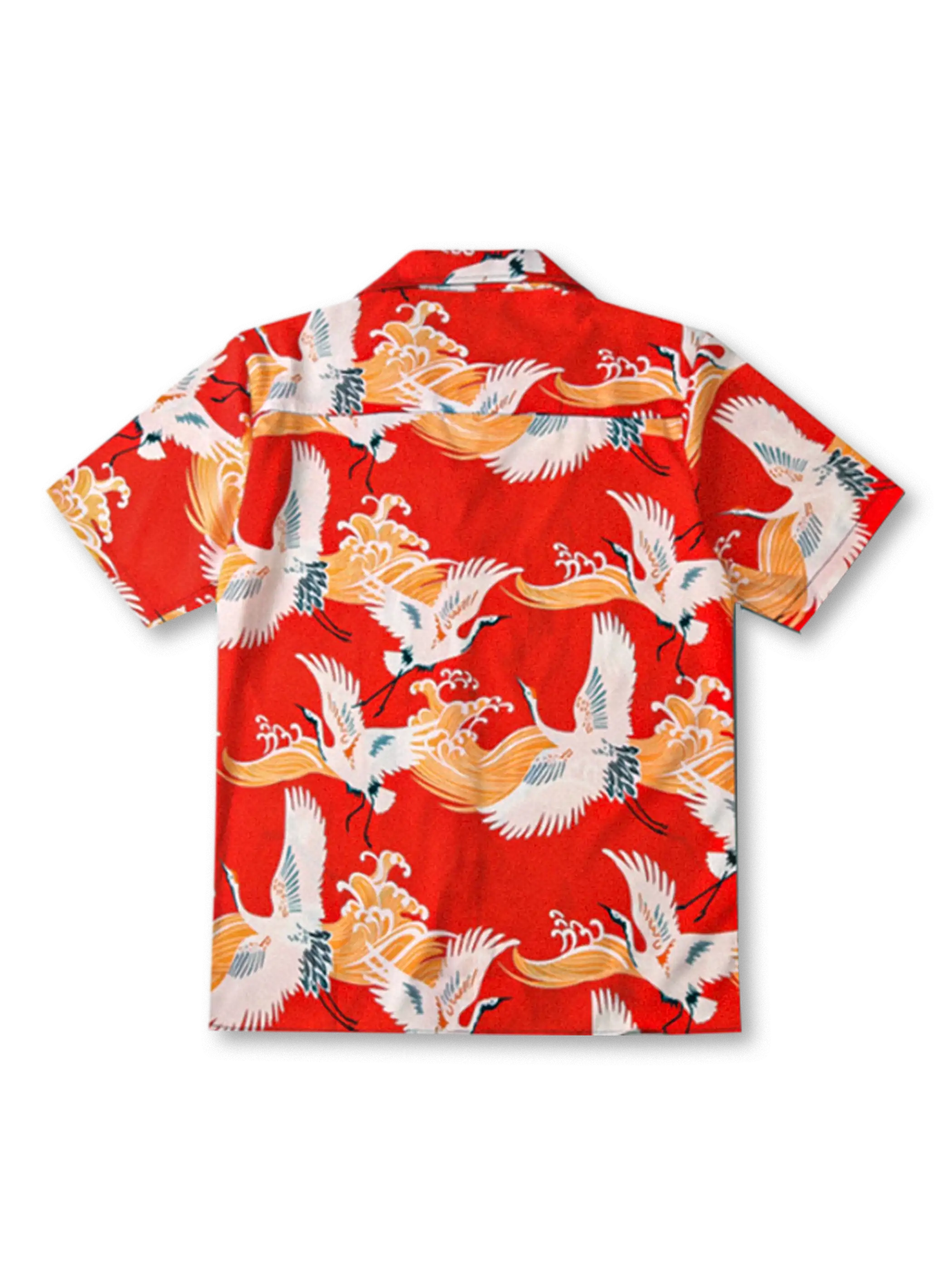 鶴と荒波モチーフを大胆に配した、鮮烈な赤色TENCEL®アロハシャツ。