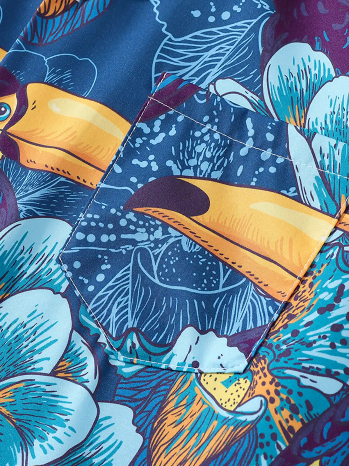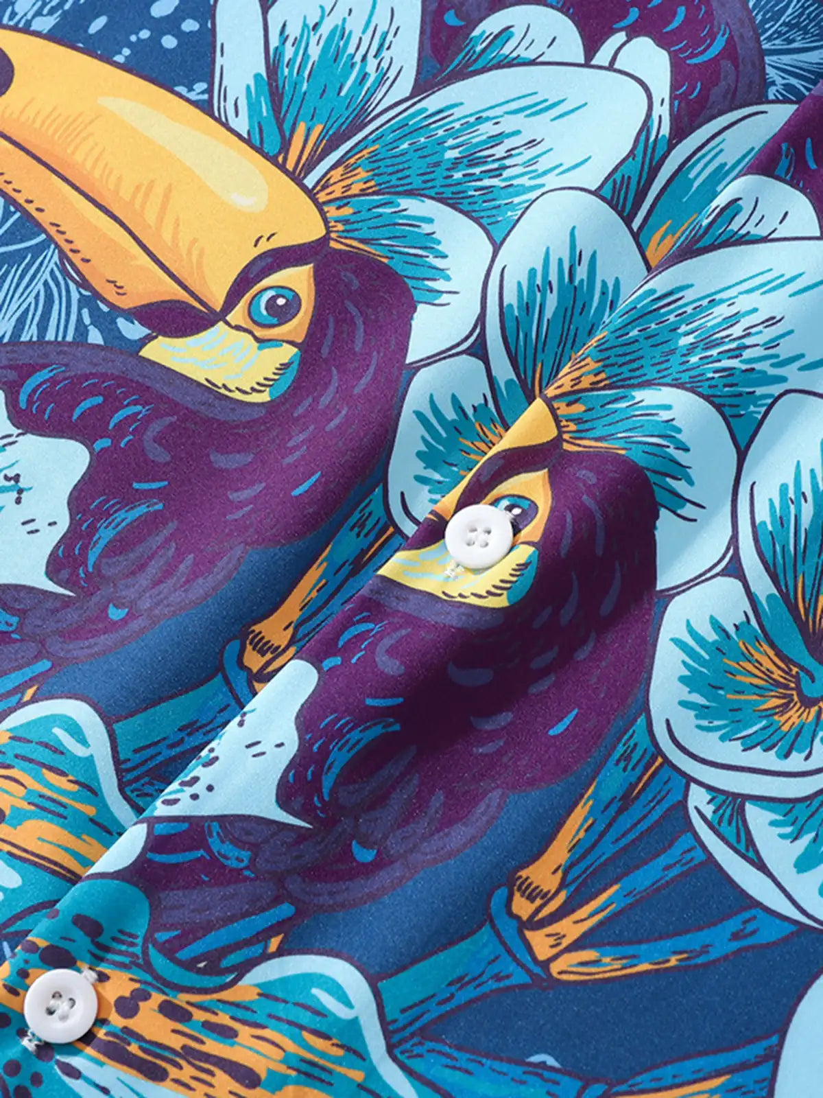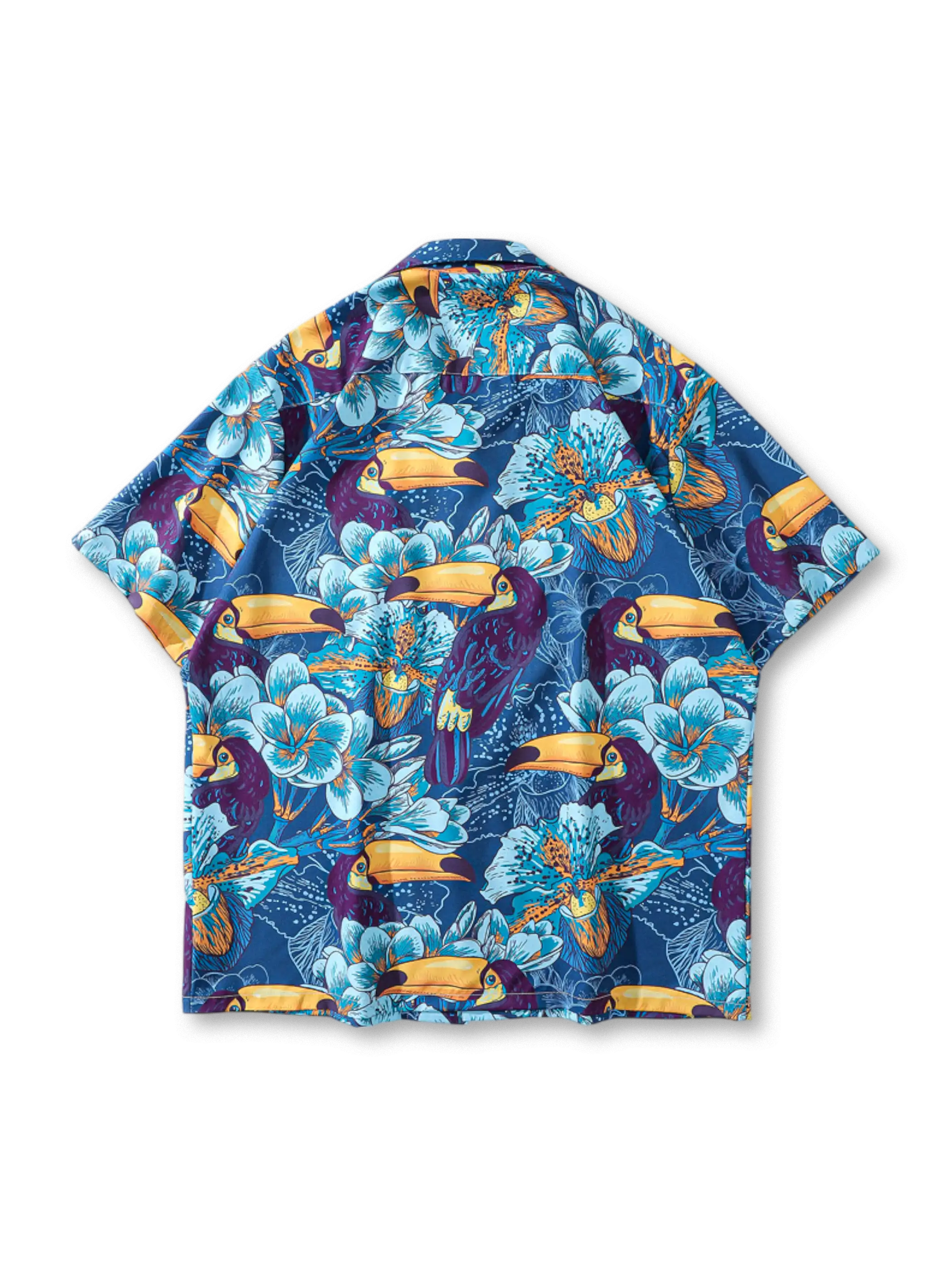 鮮やかなトゥーカンとトロピカルフラワーが夏の気分を盛り上げる、軽やかなポリエステル半袖シャツ。