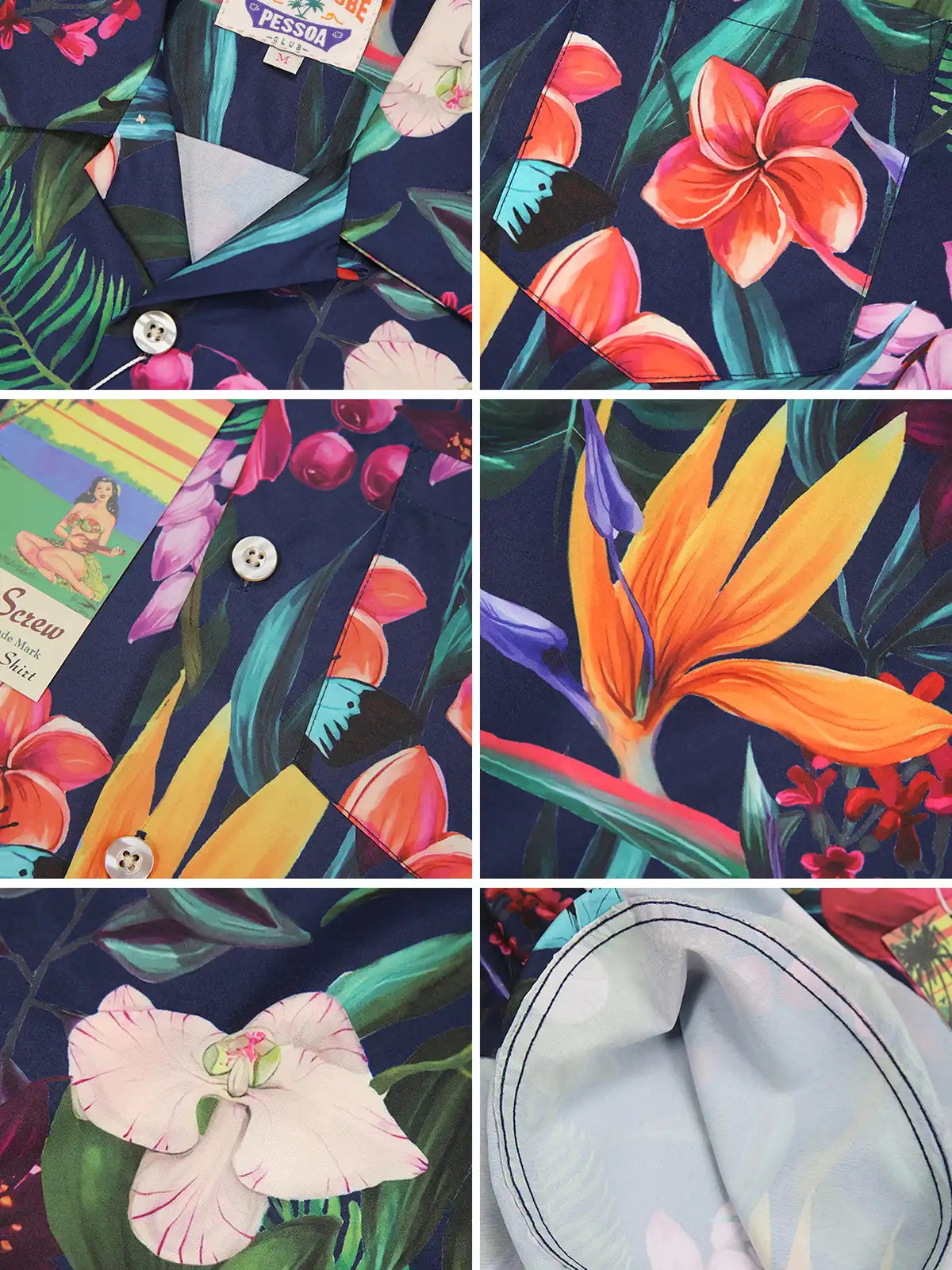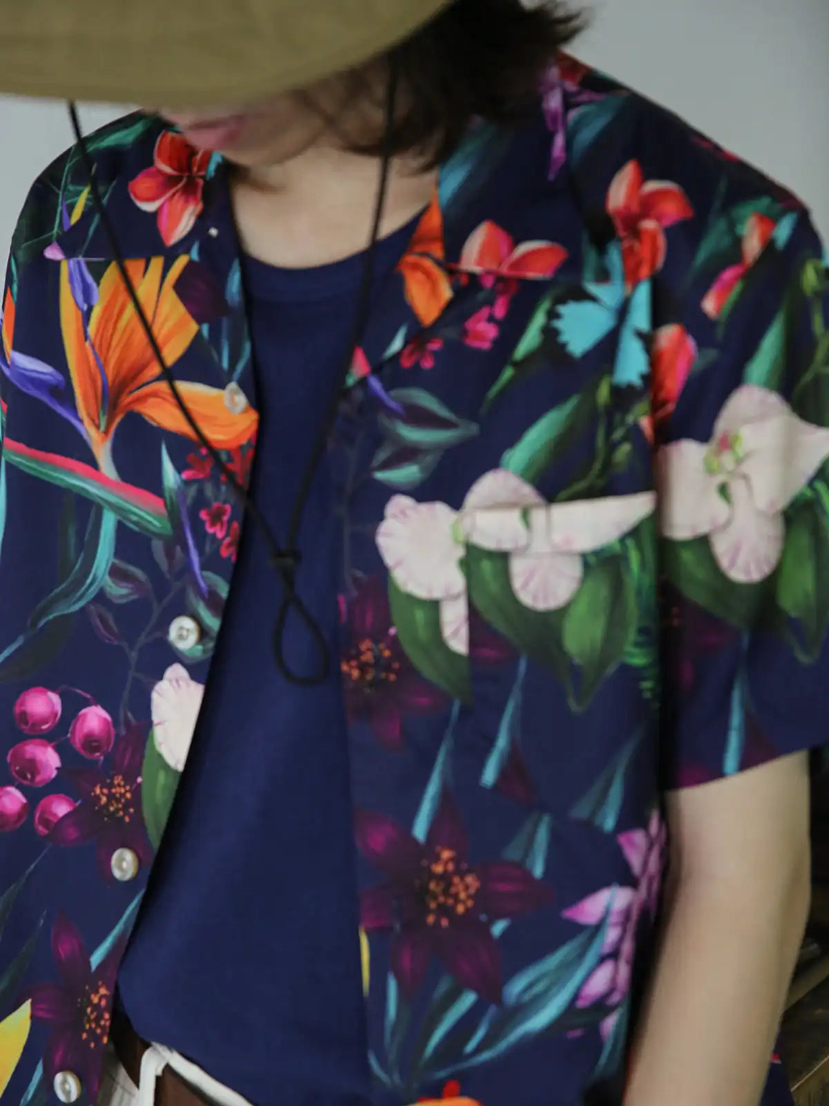 コットン90%・スパンデックス10%の軽量ストレッチ生地に、蝶蘭とストレリチア(極楽鳥花)を大胆に配したトロピカルプリントを康丽デジタルで表現。程よい光沢とソフトなドレープが上質な着心地を演出しつつ、吸水速乾性に優れて汗ばむ季節も快適。キューバカラーとボックスシルエットがリゾート感を高め、観光はもちろんオフィスカジュアルにも対応する一枚。