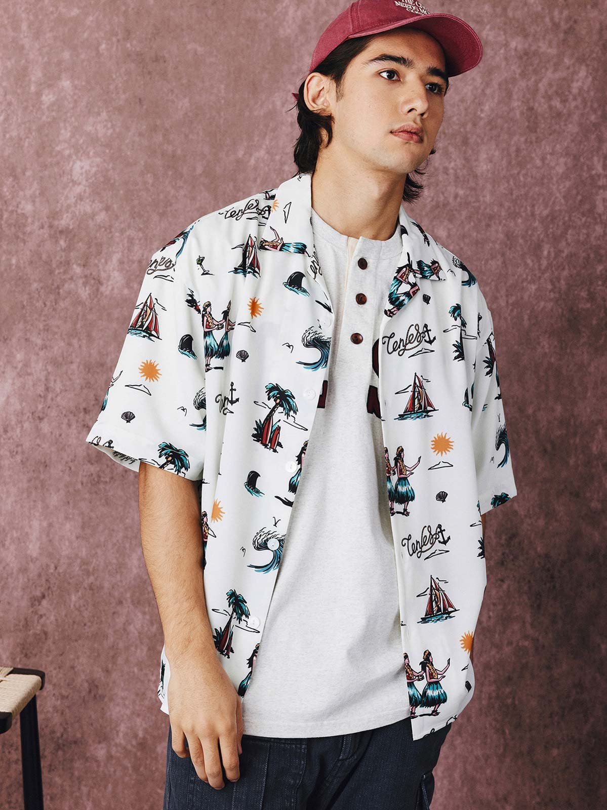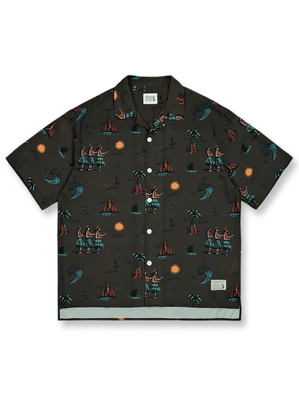 165Gのシルキーなポリエステル混紡生地を使用しており、通気性が高く涼しさを提供します。クラシックなハワイアンシャツのデザインに、裾にスリットを加えることで、よりカジュアルなスタイルを強調しています。