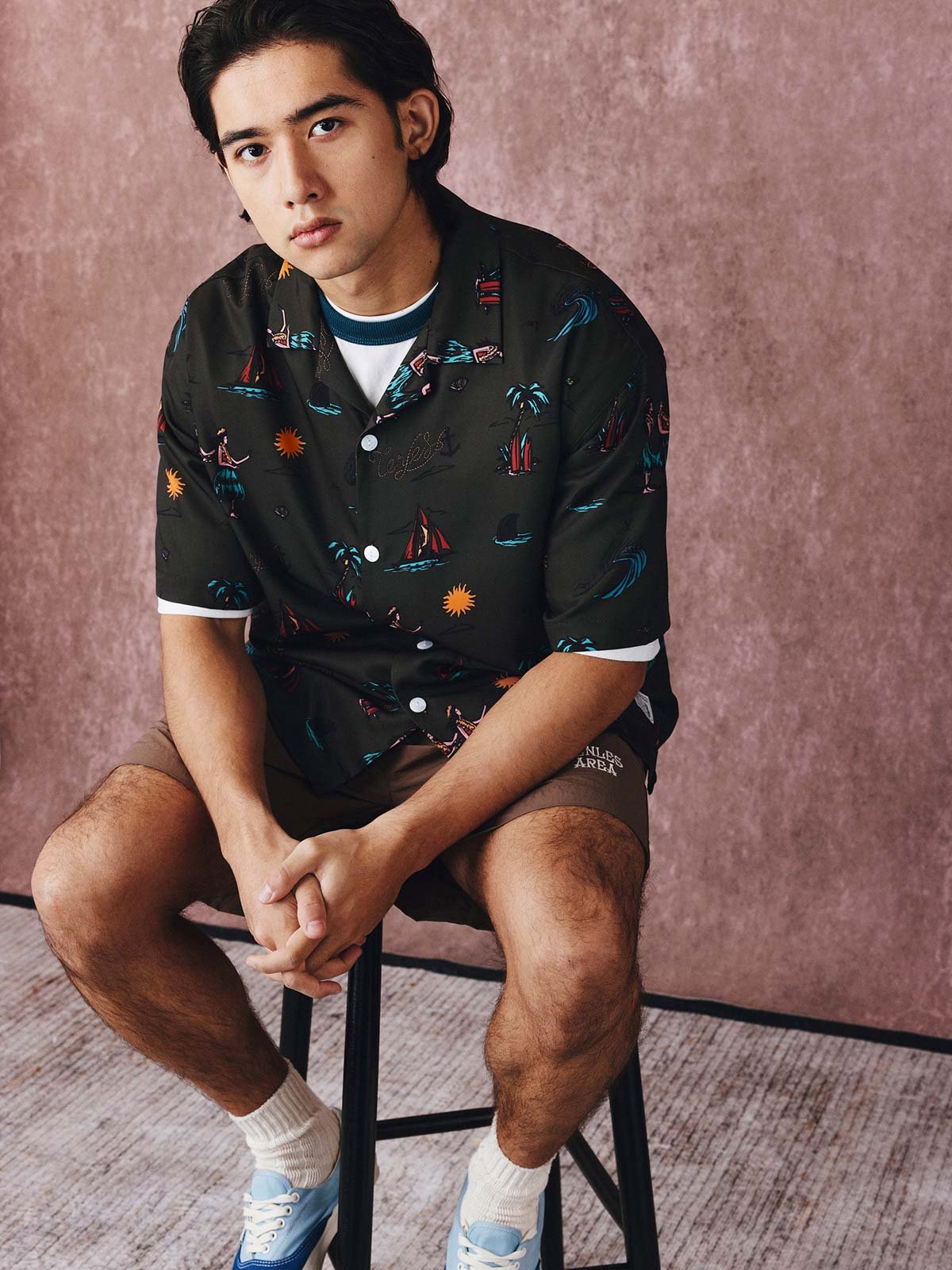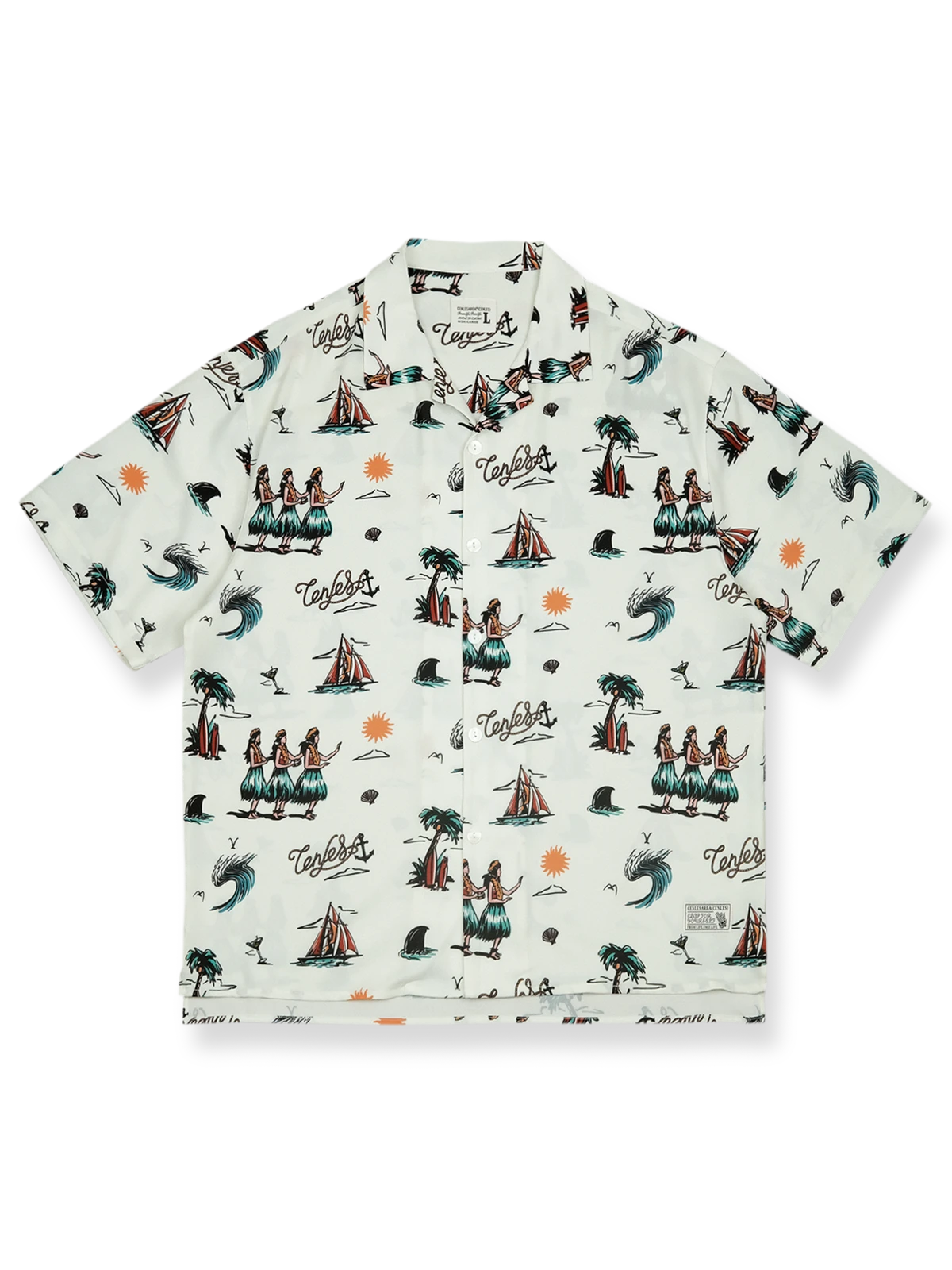 高解像度のデジタルプリント技術により、パターンの鮮明さが保証されています。天然の貝殻ボタンを使用し、シャツのユニークさとレトロな雰囲気を際立たせています。細部にまでこだわりが見られる製作過程は、ブランドの品質への強いコミットメントを感じさせます。