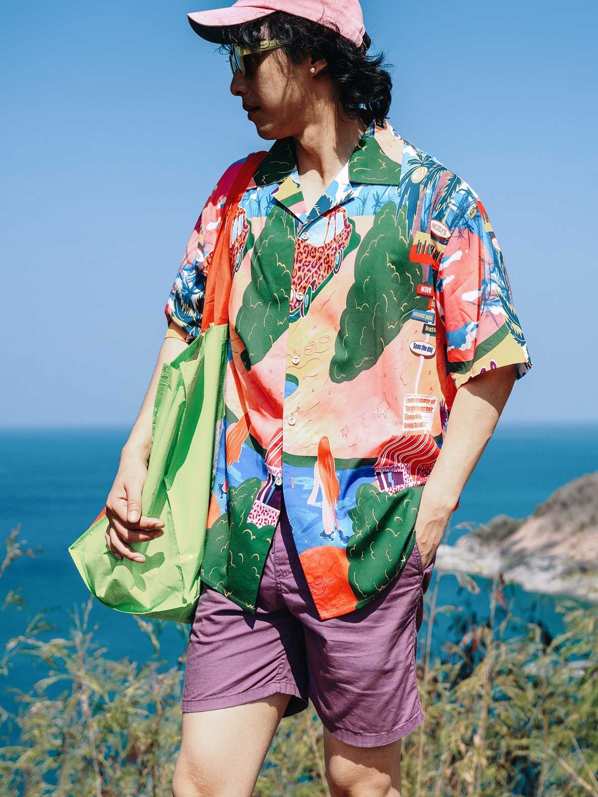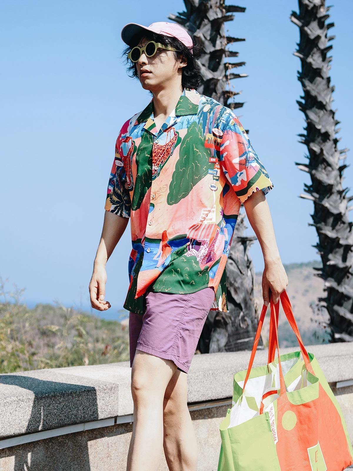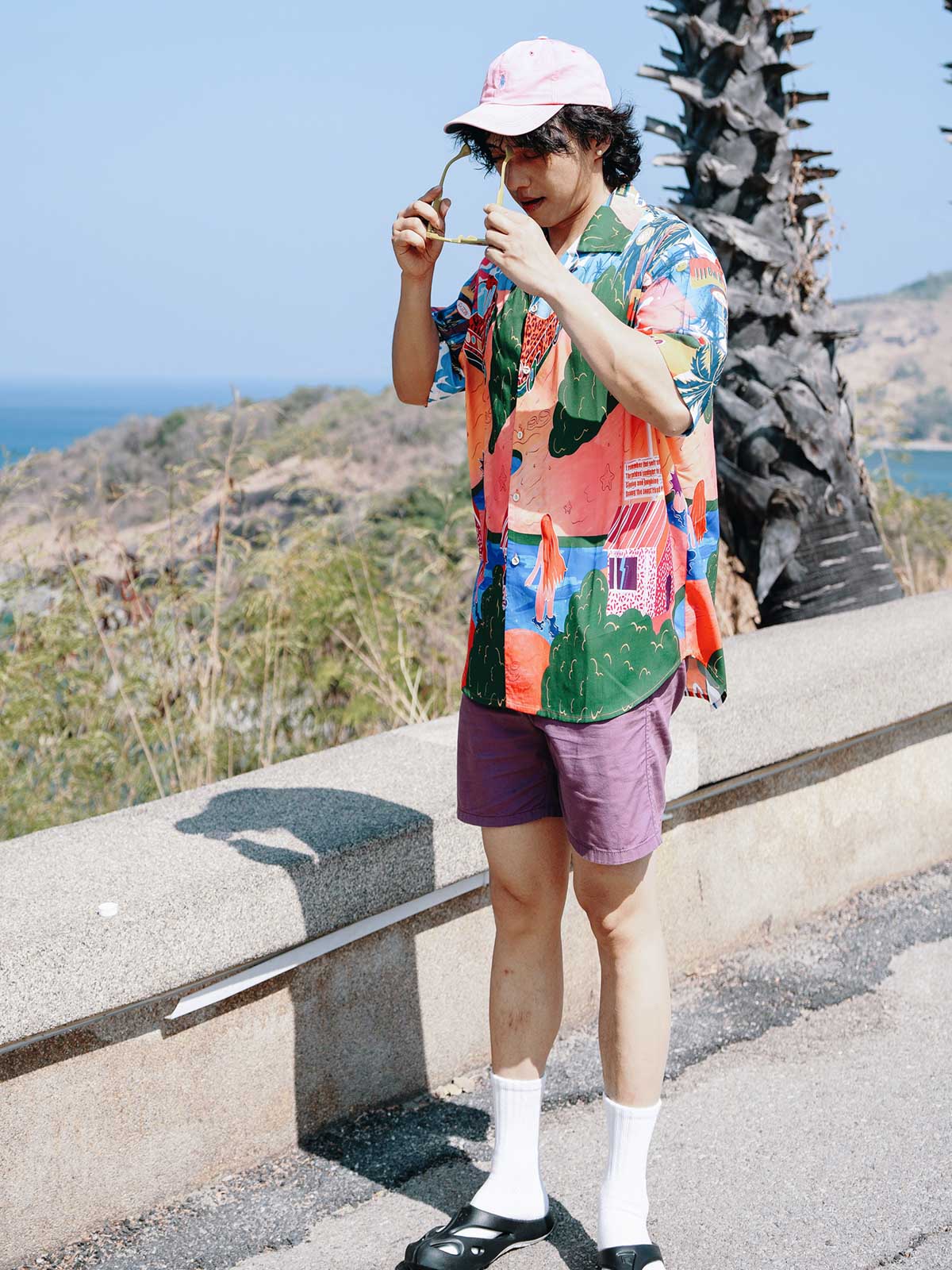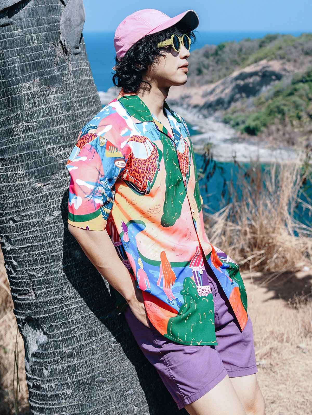 シャツのパターンと色彩を引き立てるため、シンプルな単色のショーツとカジュアルシューズの組み合わせを推奨します。これにより、夏のカジュアルで個性的なストリートスタイルが完成します。