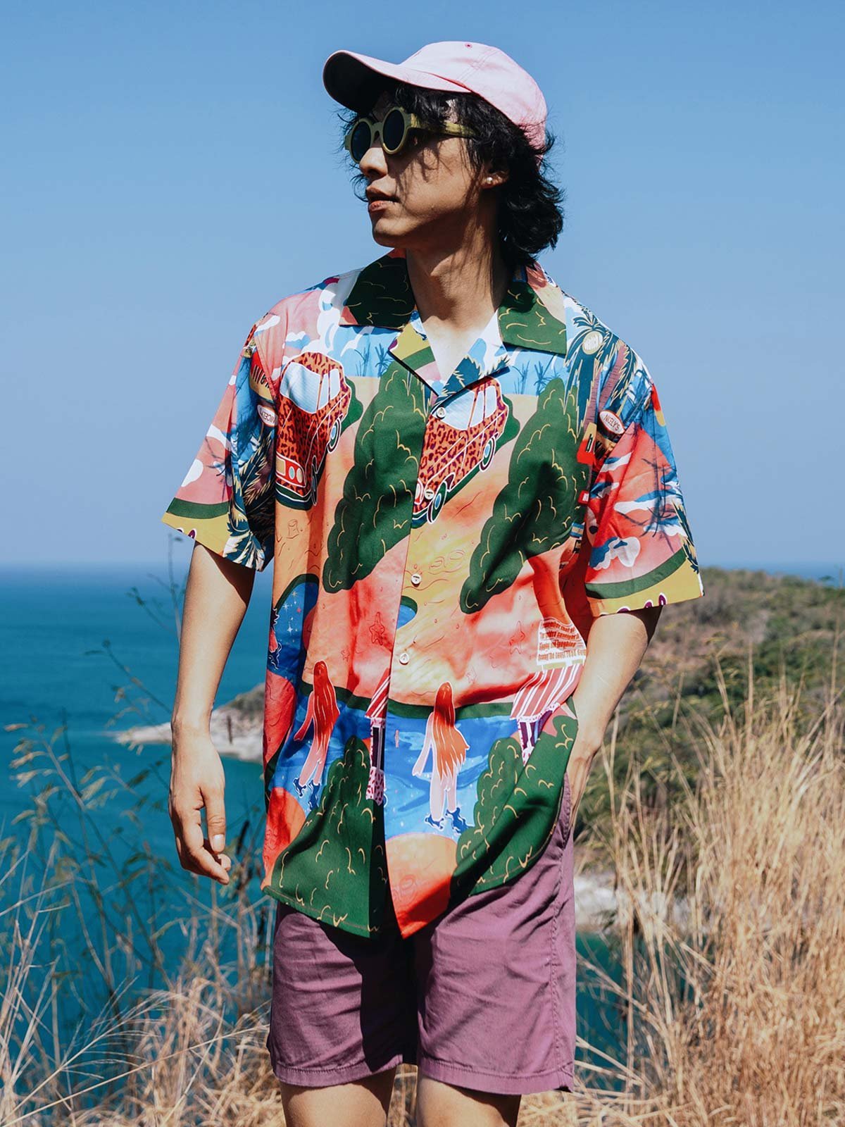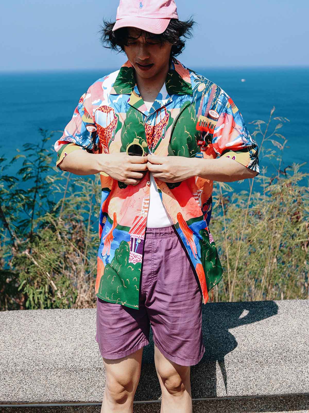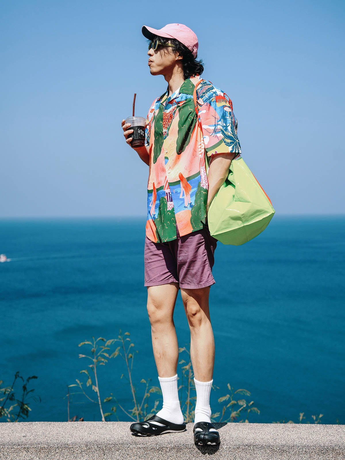 シャツのパターンと色彩を引き立てるため、シンプルな単色のショーツとカジュアルシューズの組み合わせを推奨します。これにより、夏のカジュアルで個性的なストリートスタイルが完成します。