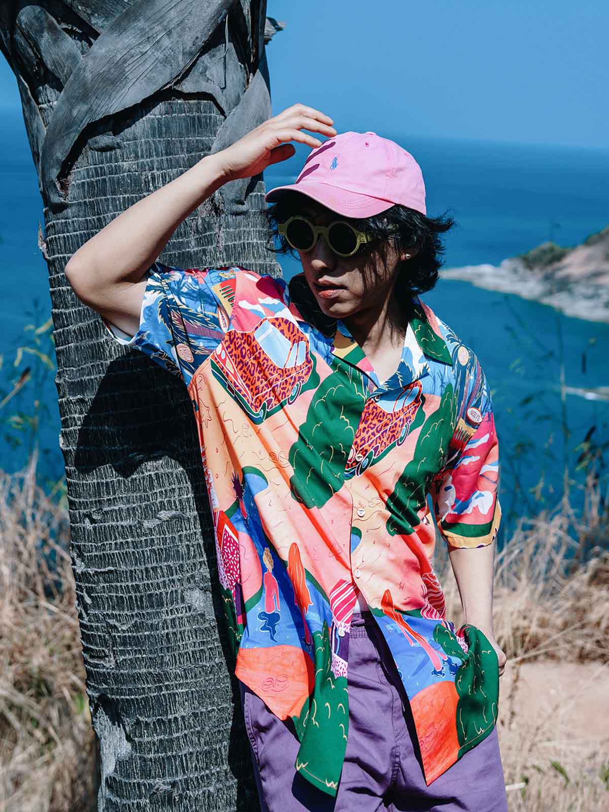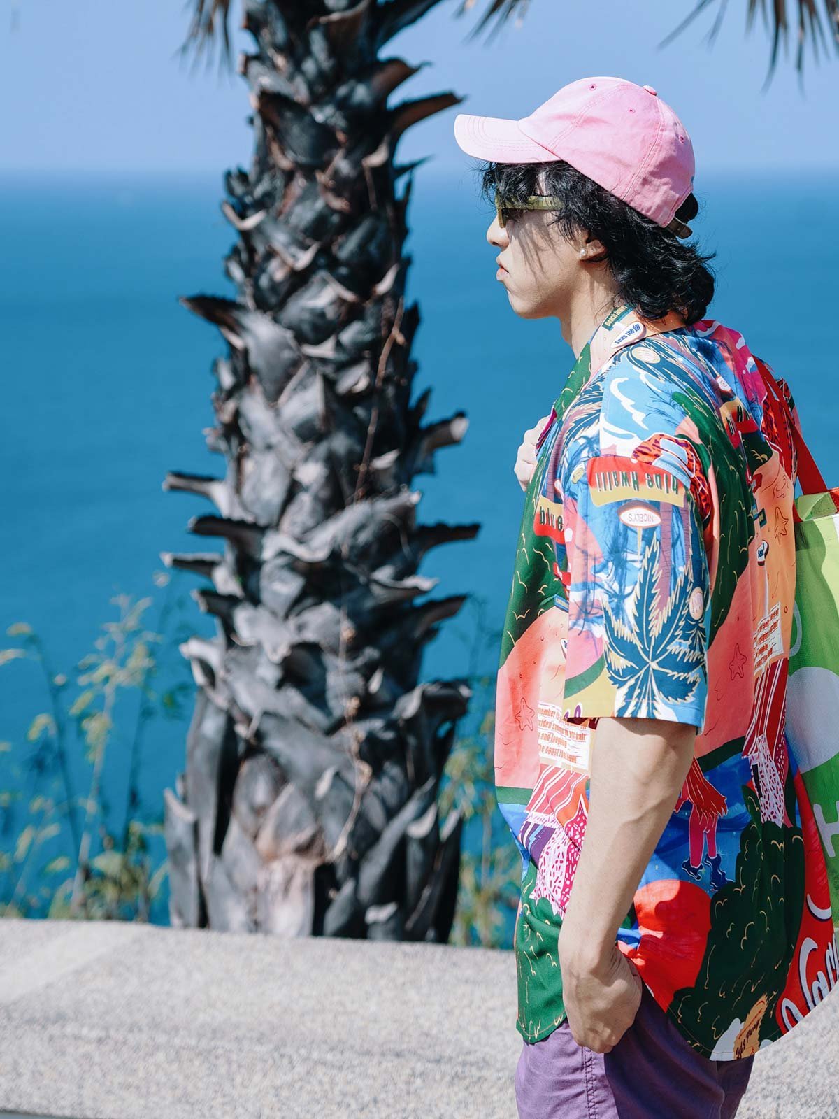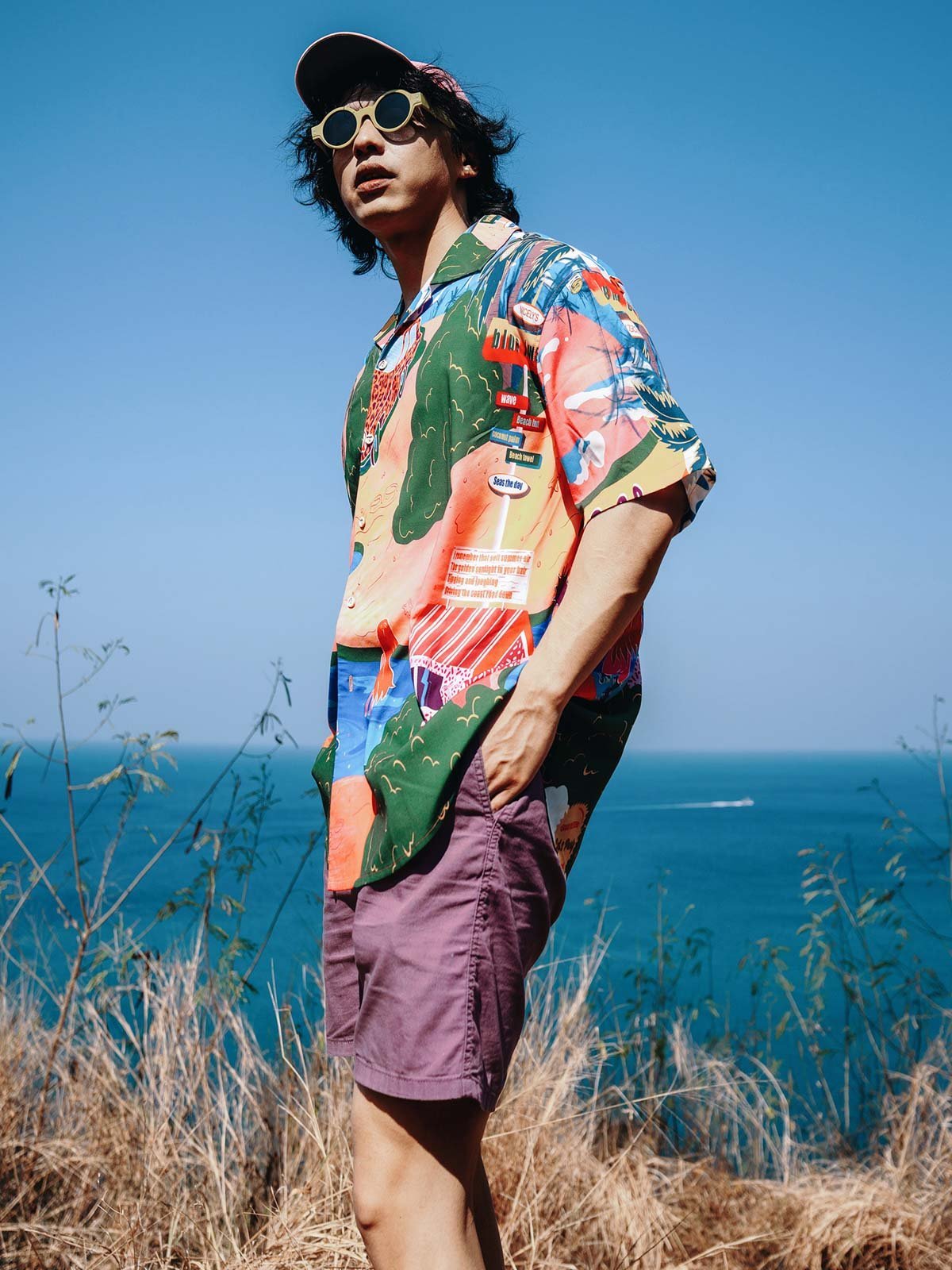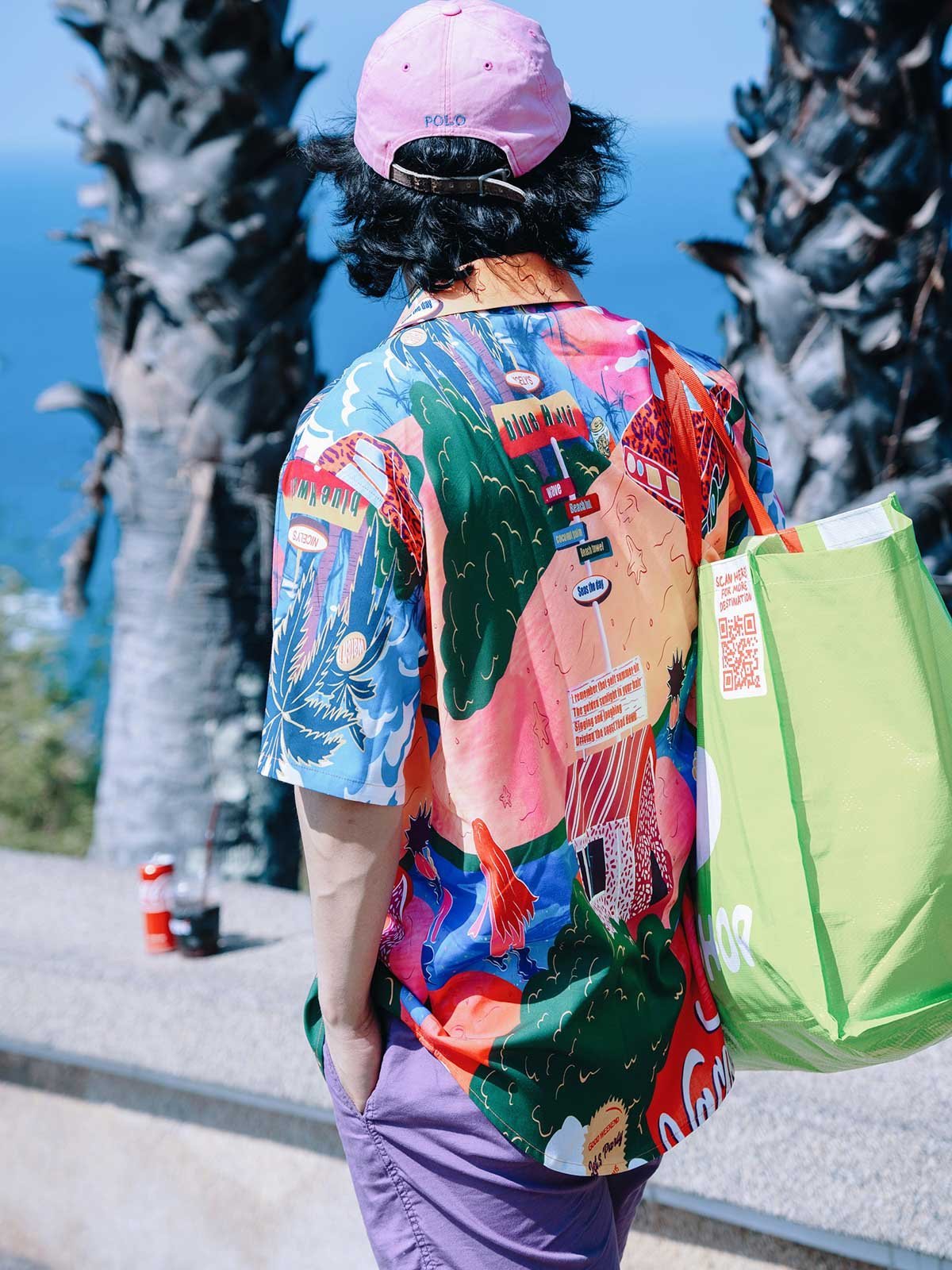 シャツのパターンと色彩を引き立てるため、シンプルな単色のショーツとカジュアルシューズの組み合わせを推奨します。これにより、夏のカジュアルで個性的なストリートスタイルが完成します。