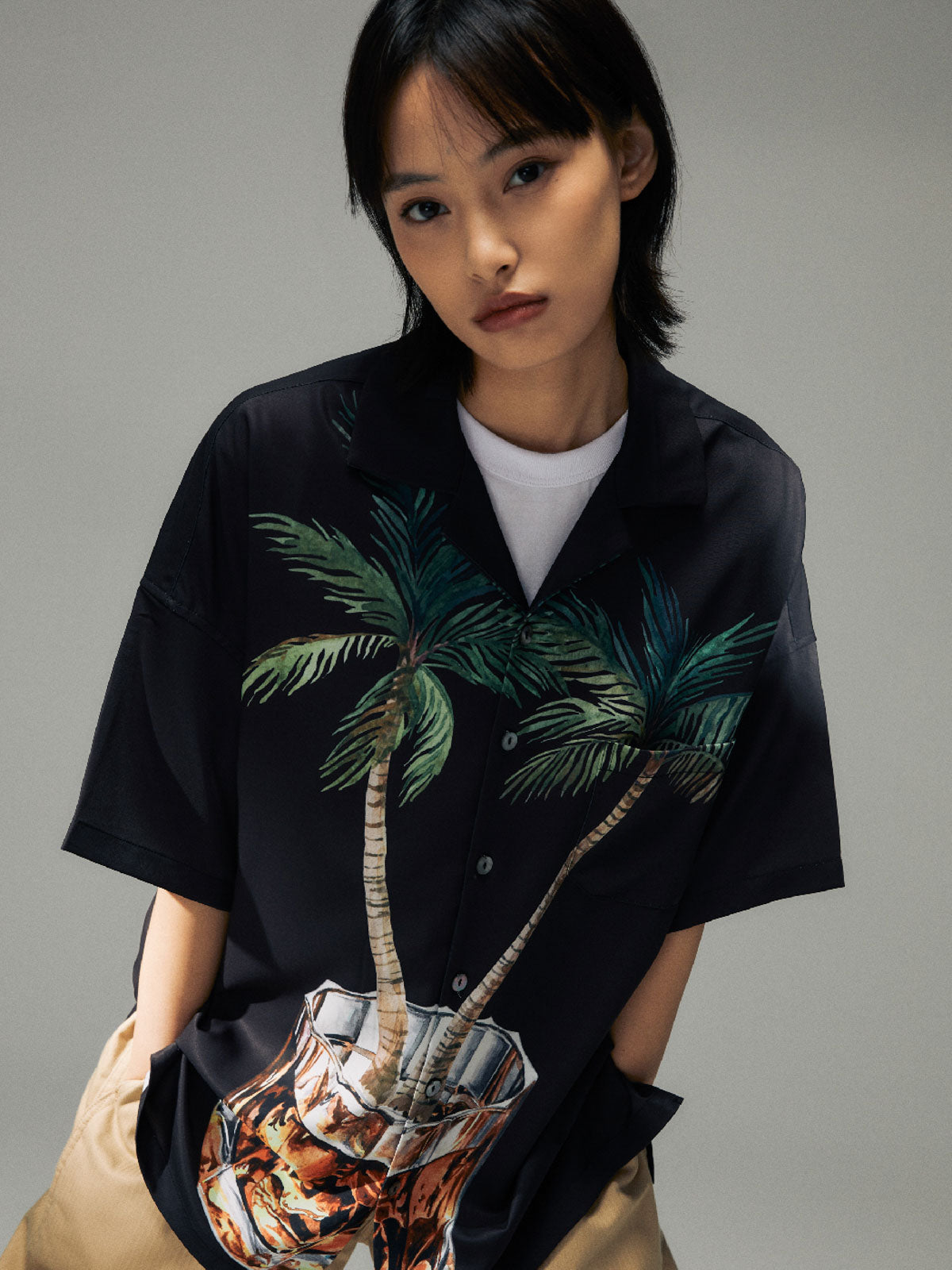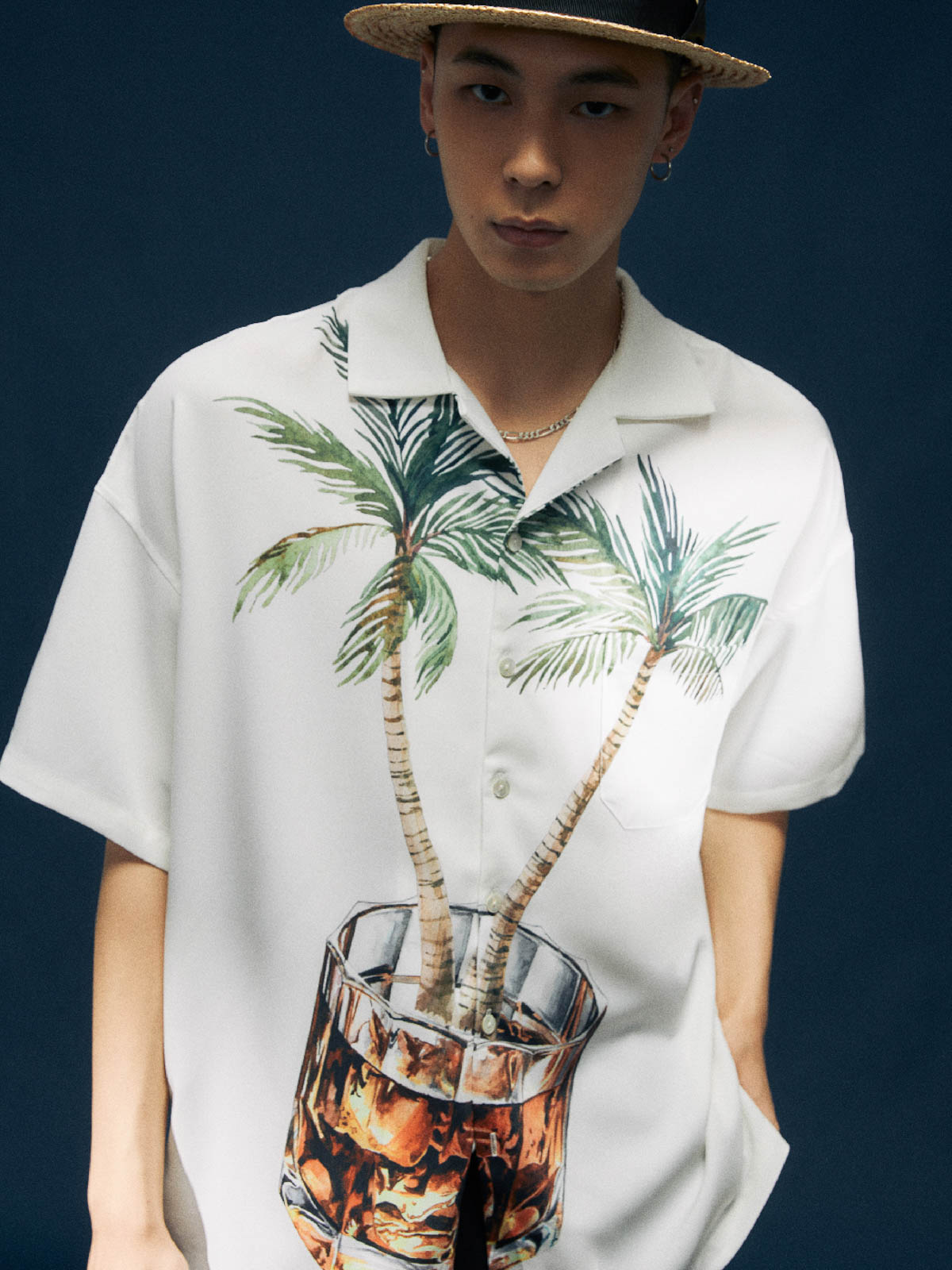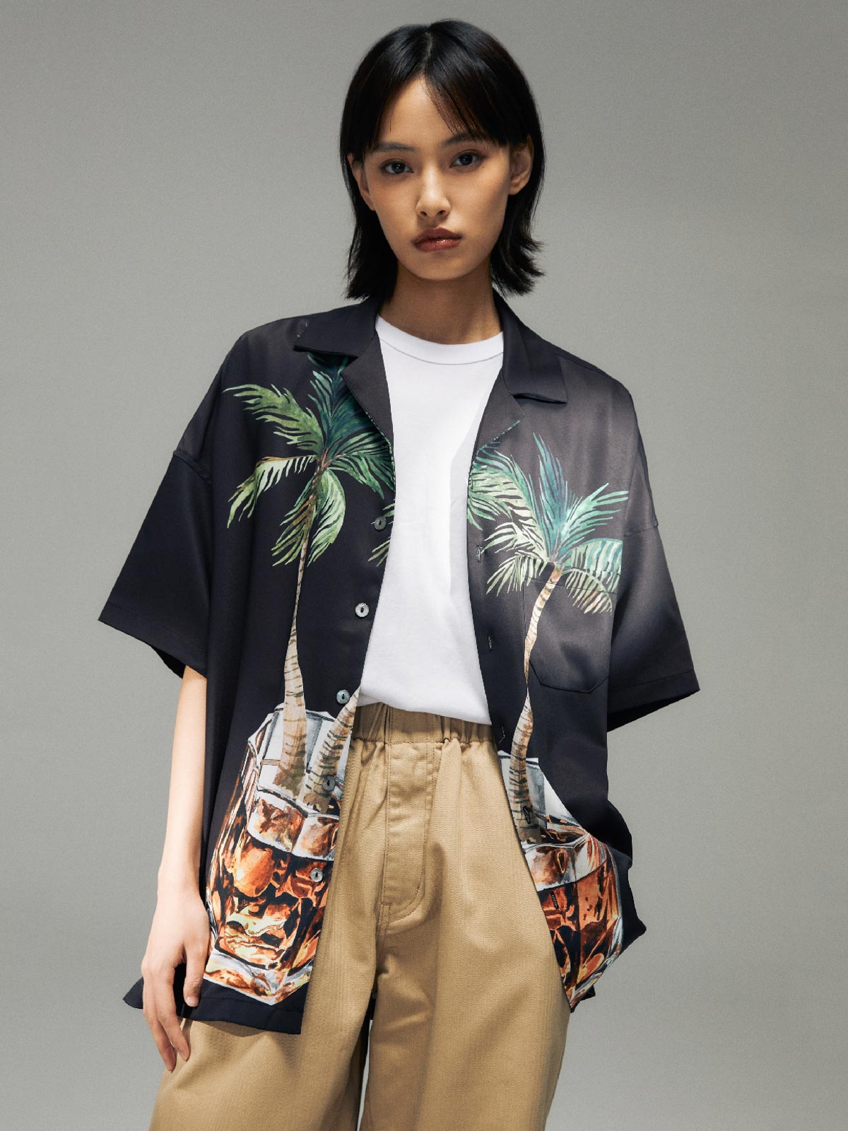 ヤシの木とウイスキーグラスのプリントが融合し、快適な生活態度を表現した100%ポリエステル素材のシャツ。涼しく快適な夏の着こなしに最適。