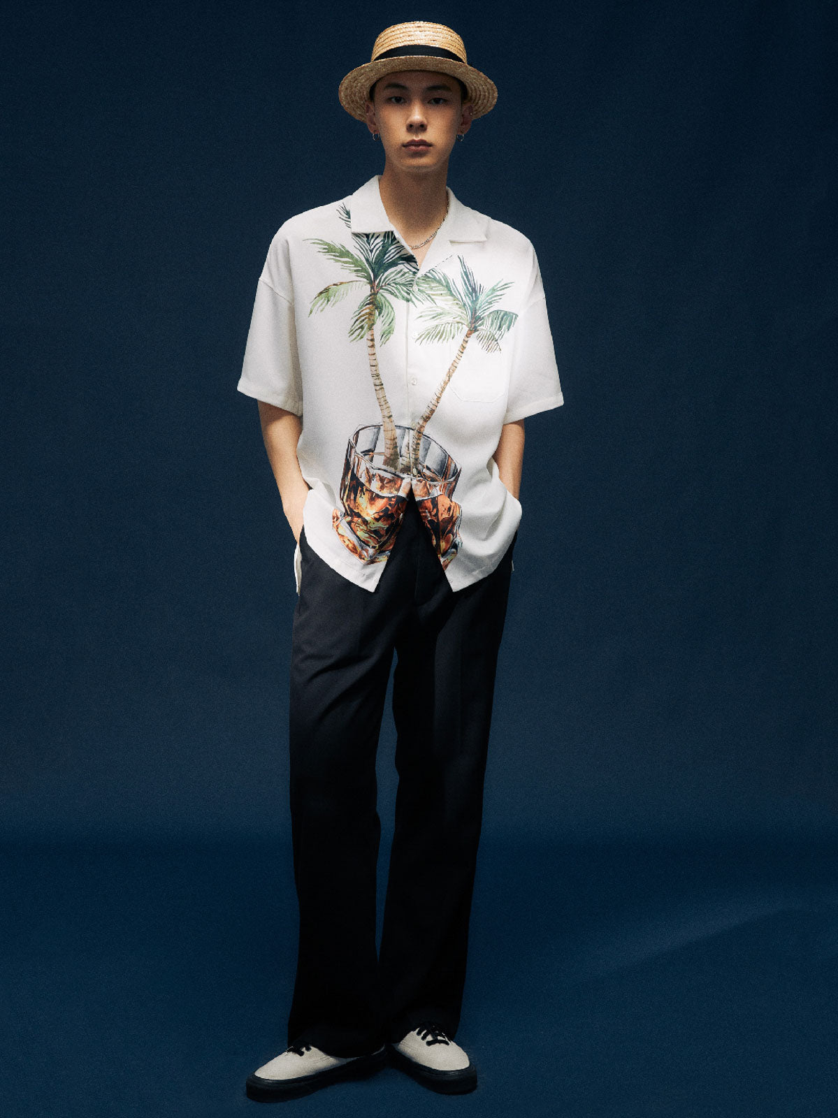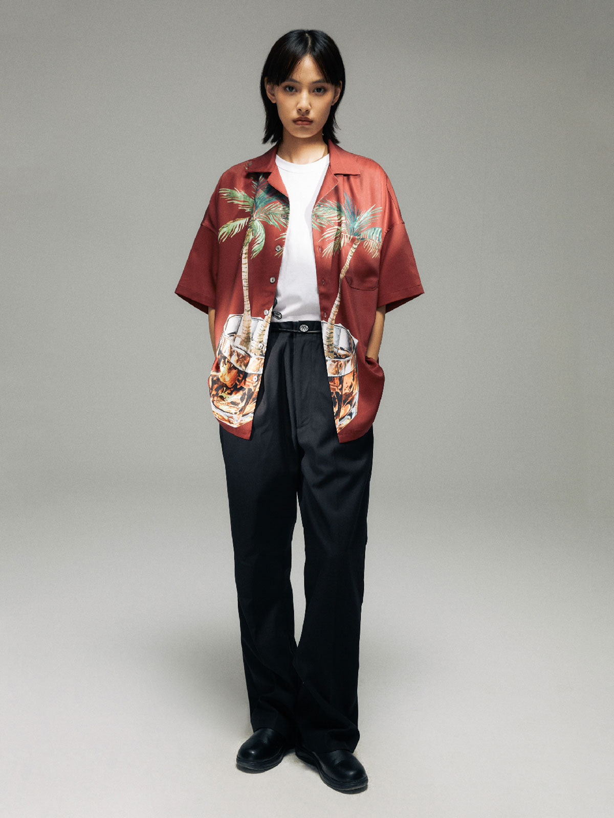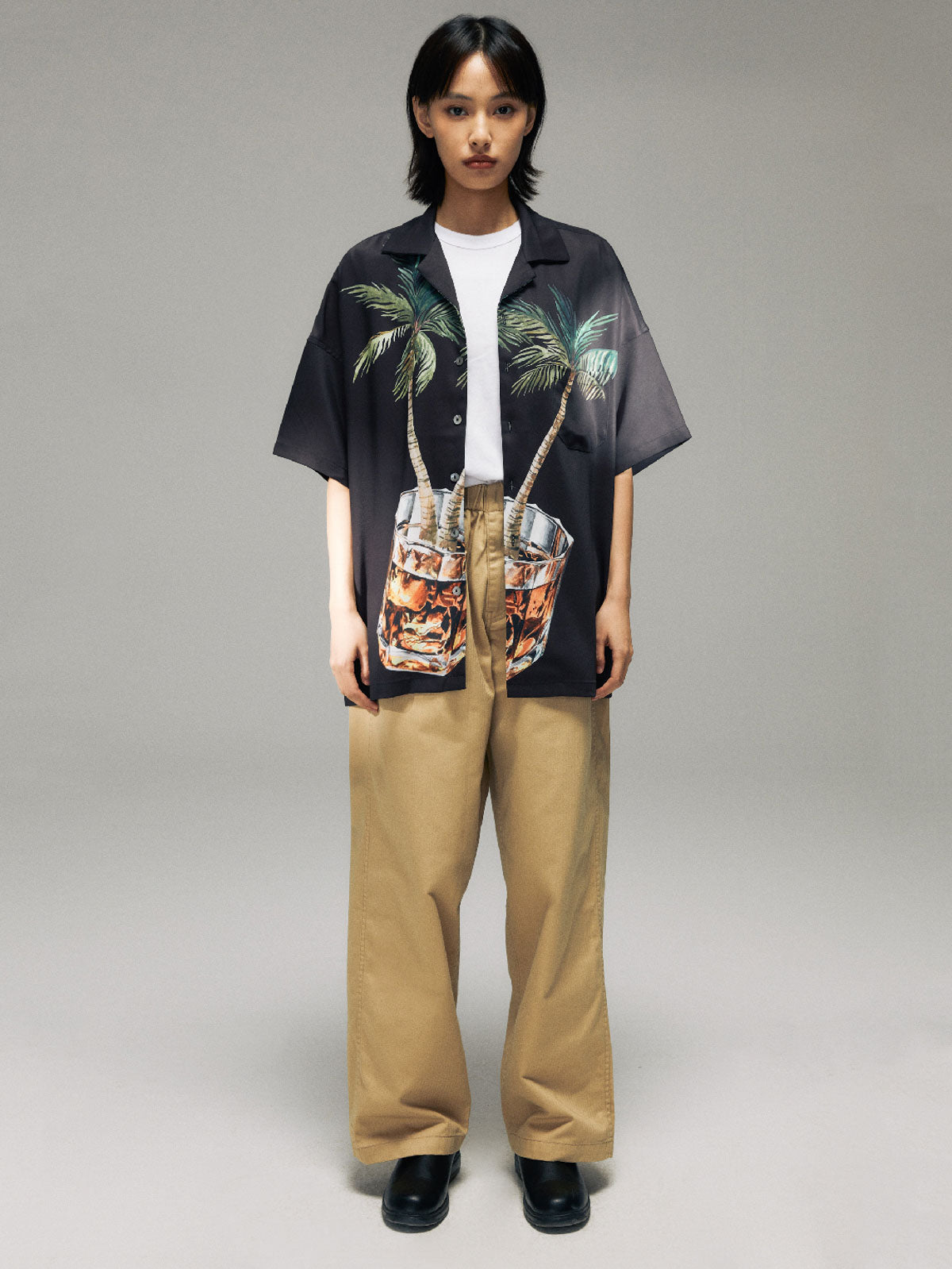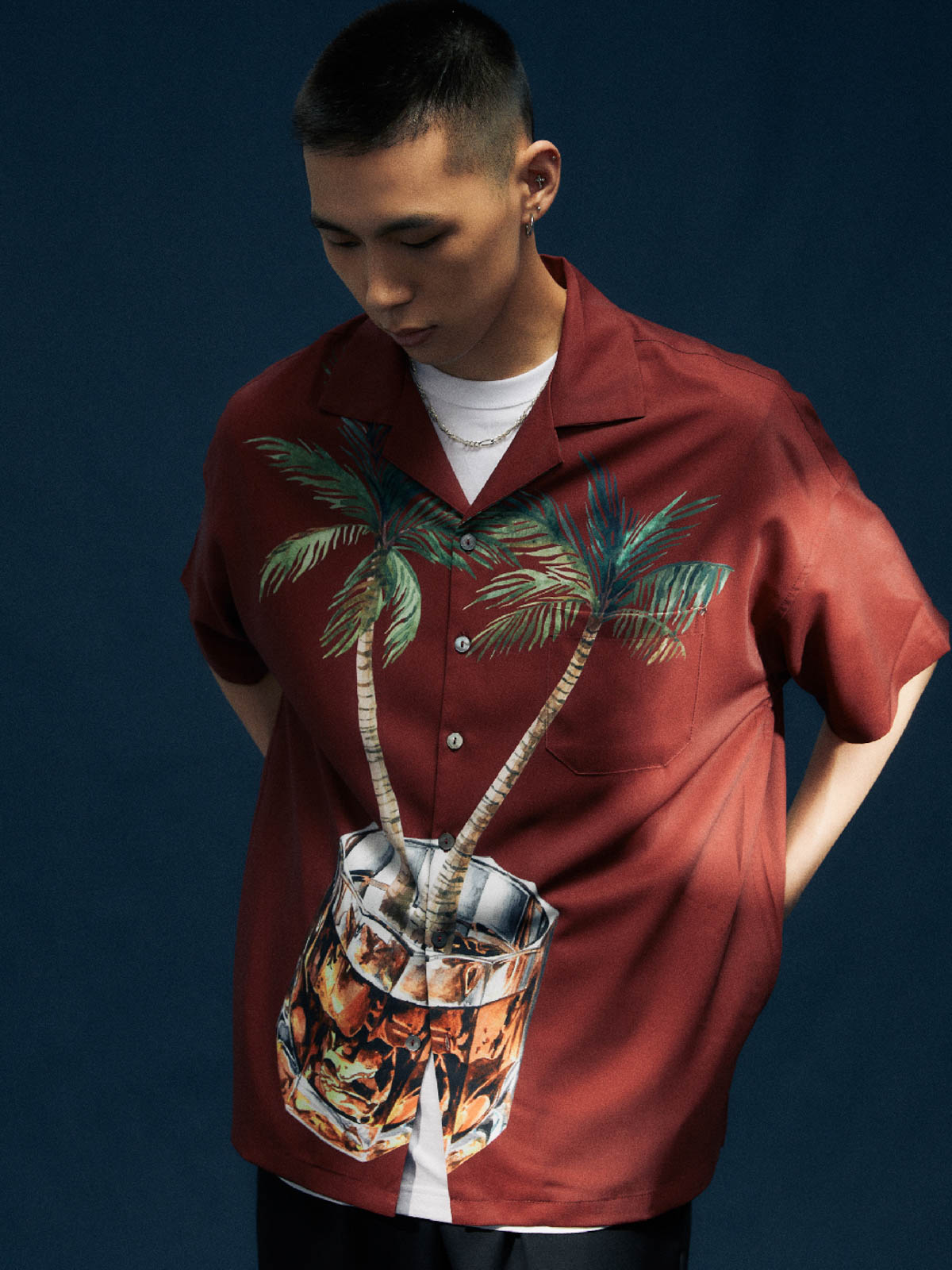 ヤシの木とウイスキーグラスのプリントが融合し、快適な生活態度を表現した100%ポリエステル素材のシャツ。涼しく快適な夏の着こなしに最適。