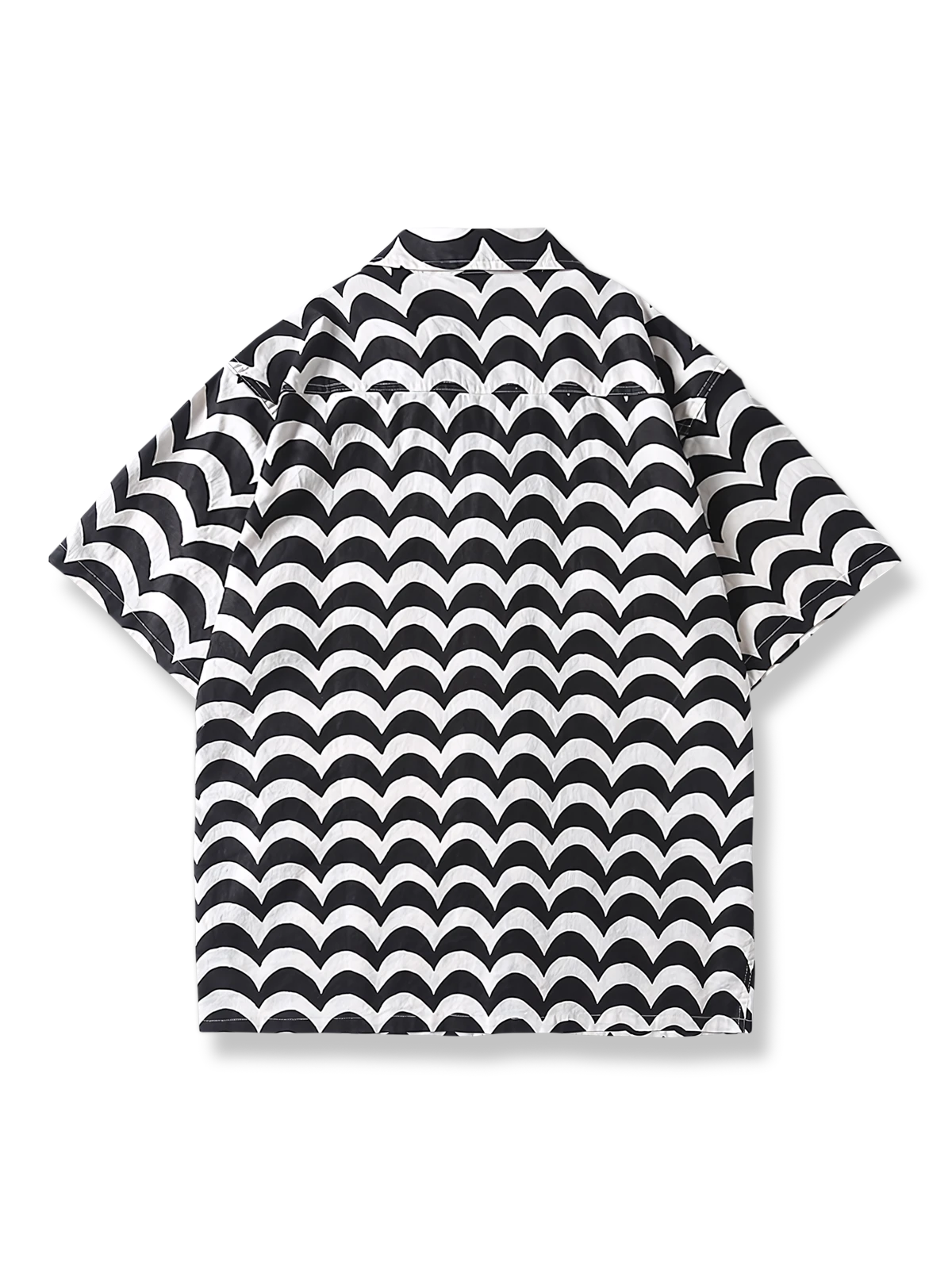 このシャツは1950年代のラテンアメリカ、特にキューバの熱帯気候に触発された象徴的なキューバカラーを採用しています。デザイナーはキューバの街並みと地元のリラックスした生活様式からインスピレーションを得て、リラックスしたカジュアルスタイルを象徴しています。波状のパターンはレトロスタイルを際立たせ、豊かな文化的背景とクラシックファッションへの現代的解釈を表現しています。