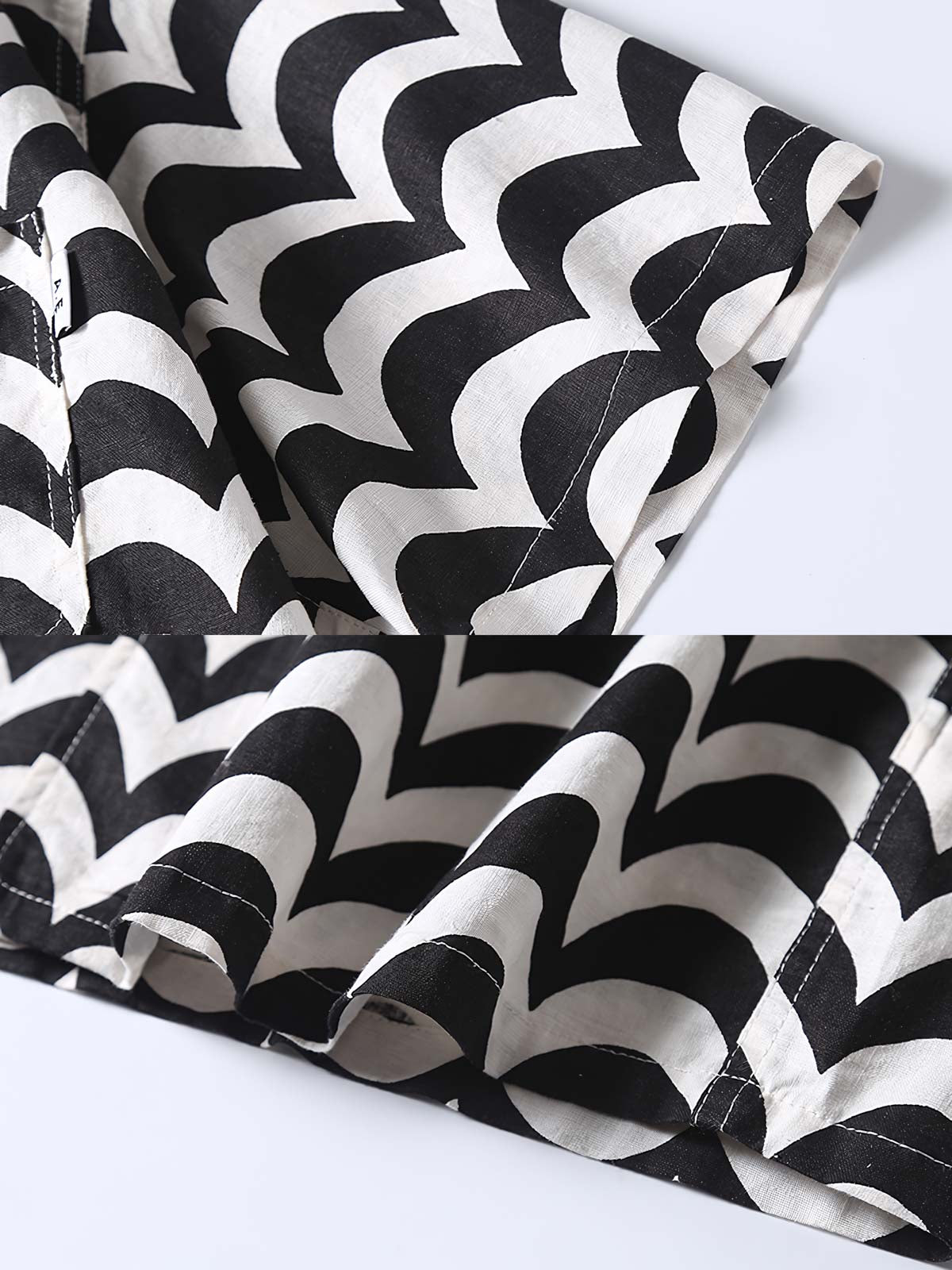 高品質のリネン素材を使用しており、その天然繊維は優れた吸湿性と通気性で知られています。波状のパターンはコントラストの強い黒と白の色調で、クラシックなスタイルに視覚的インパクトを加えています。細やかな縫製技術が衣服の耐久性とディテールの精緻さを保証します。