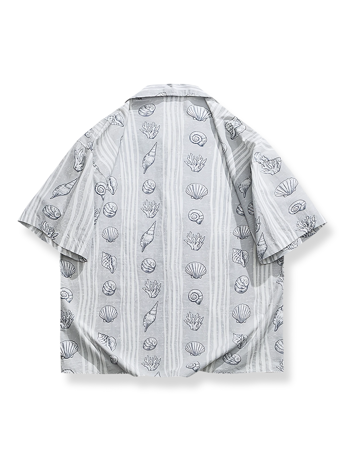 この貝殻プリントの半袖シャツは、海岸線のリラックスした生活からインスピレーションを得ています。明るい貝殻のパターンが施されており、20世紀の海辺リゾート文化を彷彿とさせるデザインです。