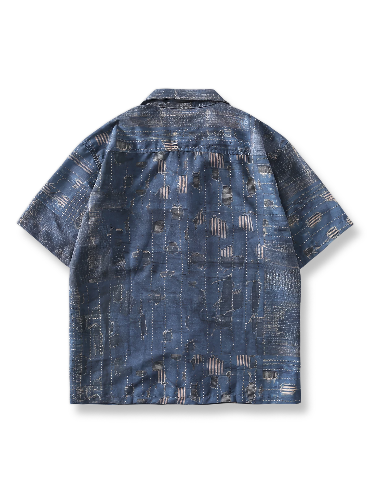 デニムの歴史は19世紀のアメリカに始まり、もともとは耐久性のあるワークウェアとして使用されてきました。この半袖シャツは、伝統的なデニムの粗野な質感を取り入れ、現代のプリント技術を用いてレトロな工業スタイルと現代的なファッション要素を融合させています。その結果、独特の視覚効果を創出しており、クラシックとモダンの交差点に位置しています。
