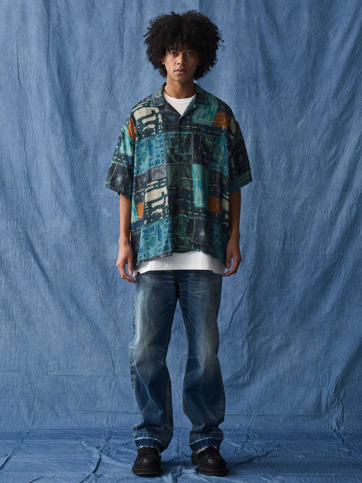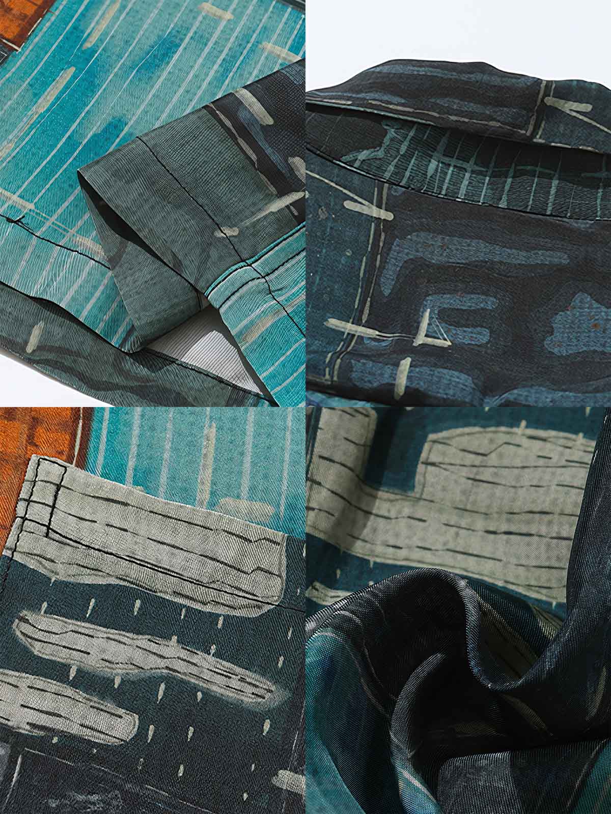 薄手の生地を使用し、抽象的なパターンがプリントされています。生地の質感とプリントのディテールは、遠目にも独特の存在感を放ちます。