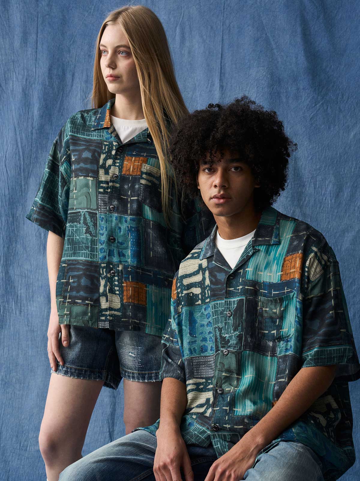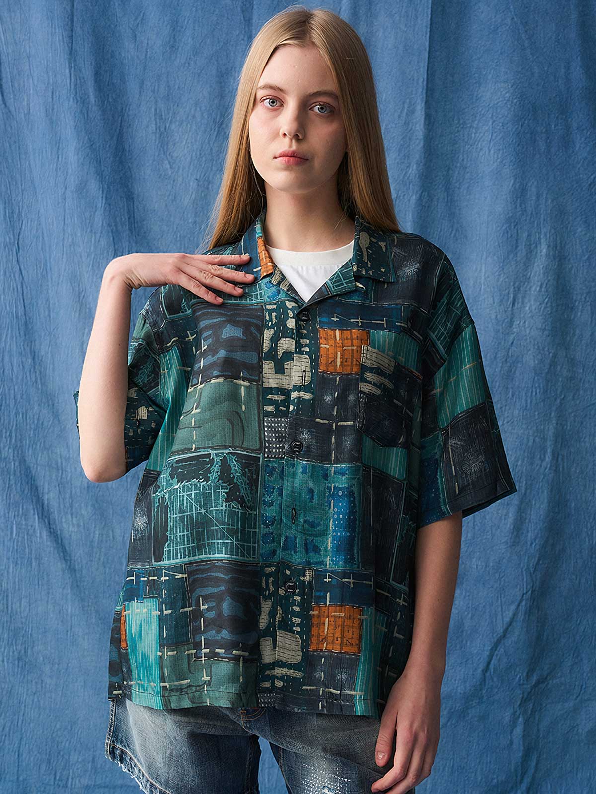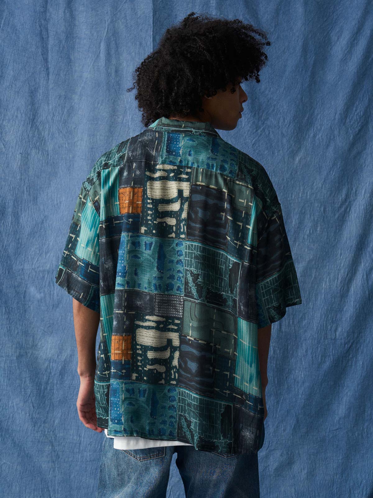 このアロハシャツは、伝統的なトロピカルな雰囲気を現代的な都市景観の抽象アートに融合させたデザインです。アロハシャツの起源はハワイにありますが、この衣服はその歴史を再解釈し、現代のファッション感覚に合わせたアートピースへと昇華しました。