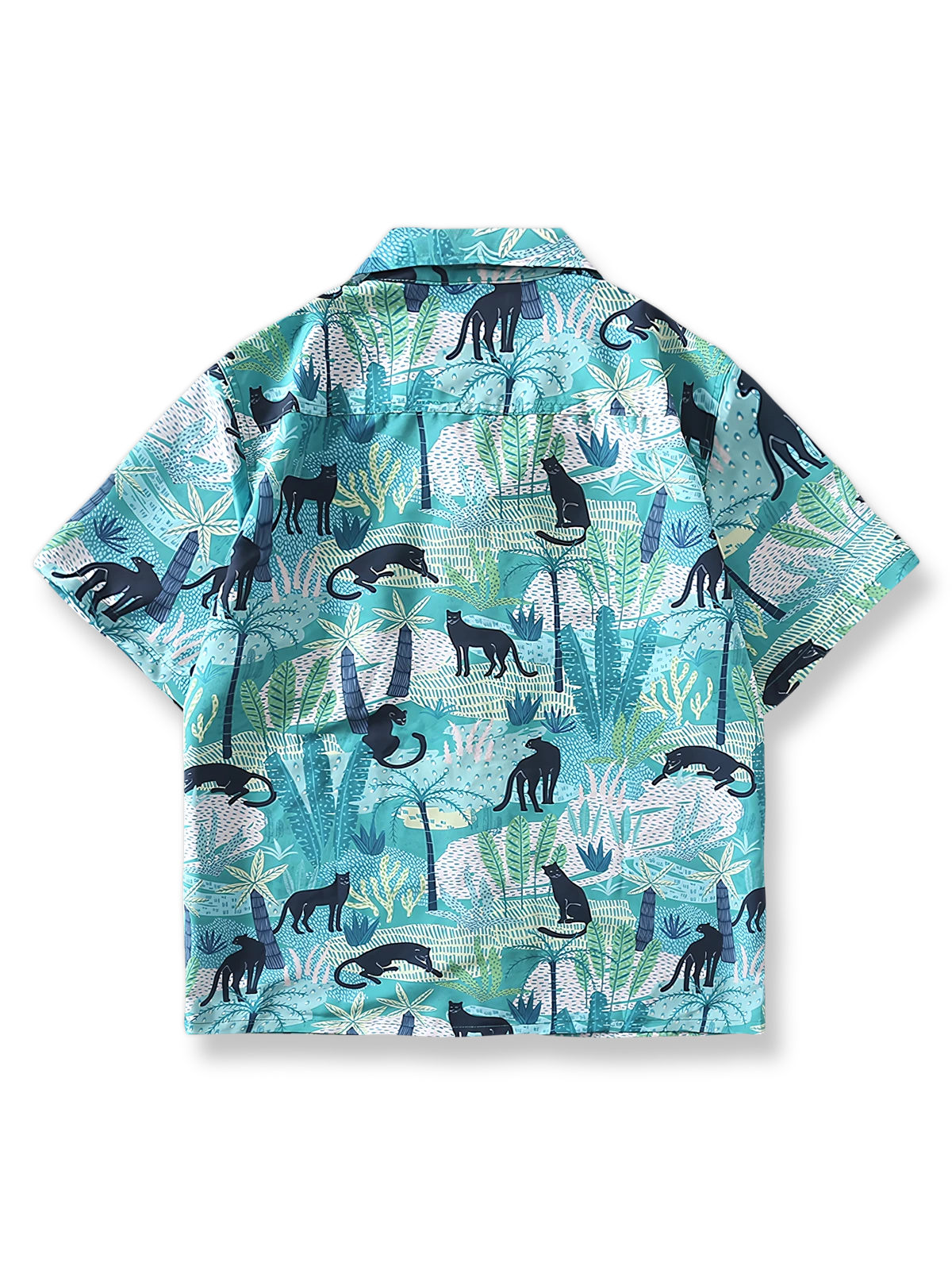 ハワイアンシャツは、その生き生きとした熱帯プリントとリラックスしたカジュアルスタイルで知られ、夏のビーチやバカンスに欠かせない象徴的な衣服です。このシャツは熱帯ジャングルと野生動物のパターンを採用し、冒険とリラックスの雰囲気を創出しています。
