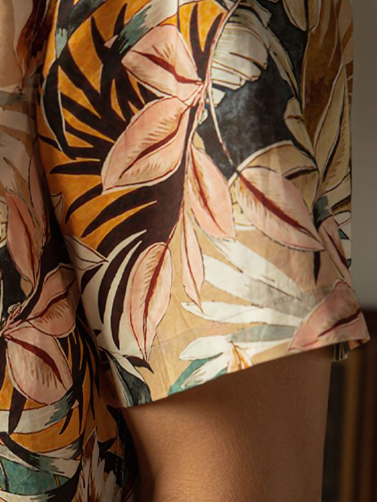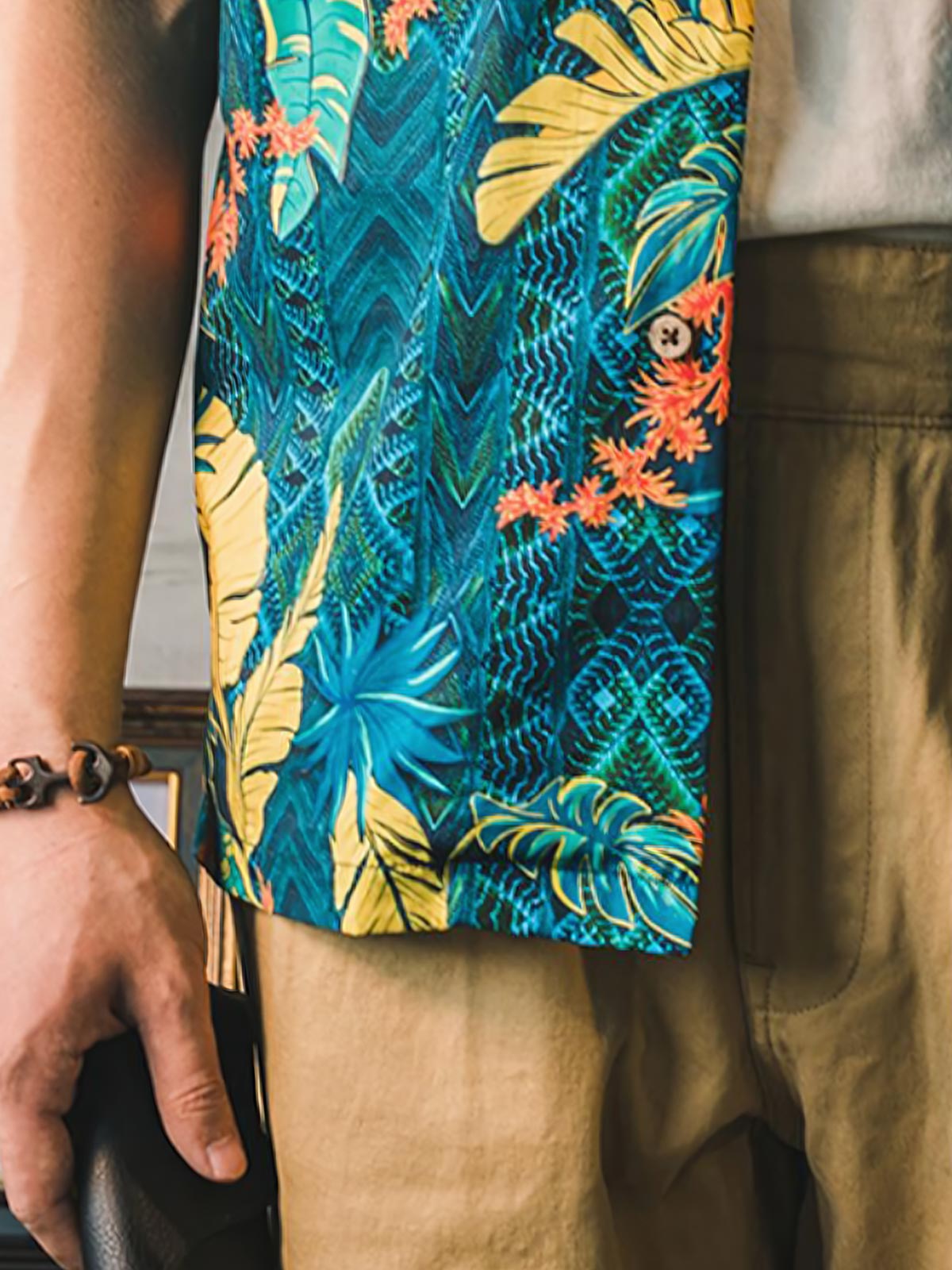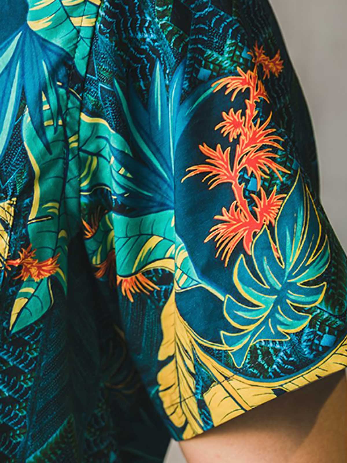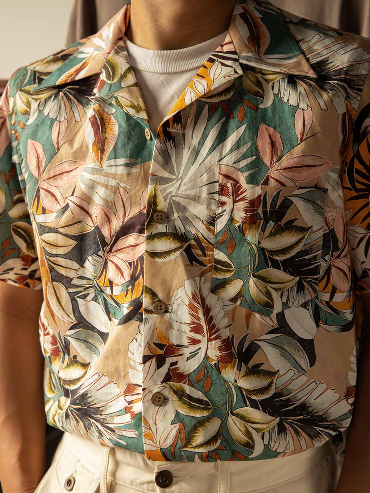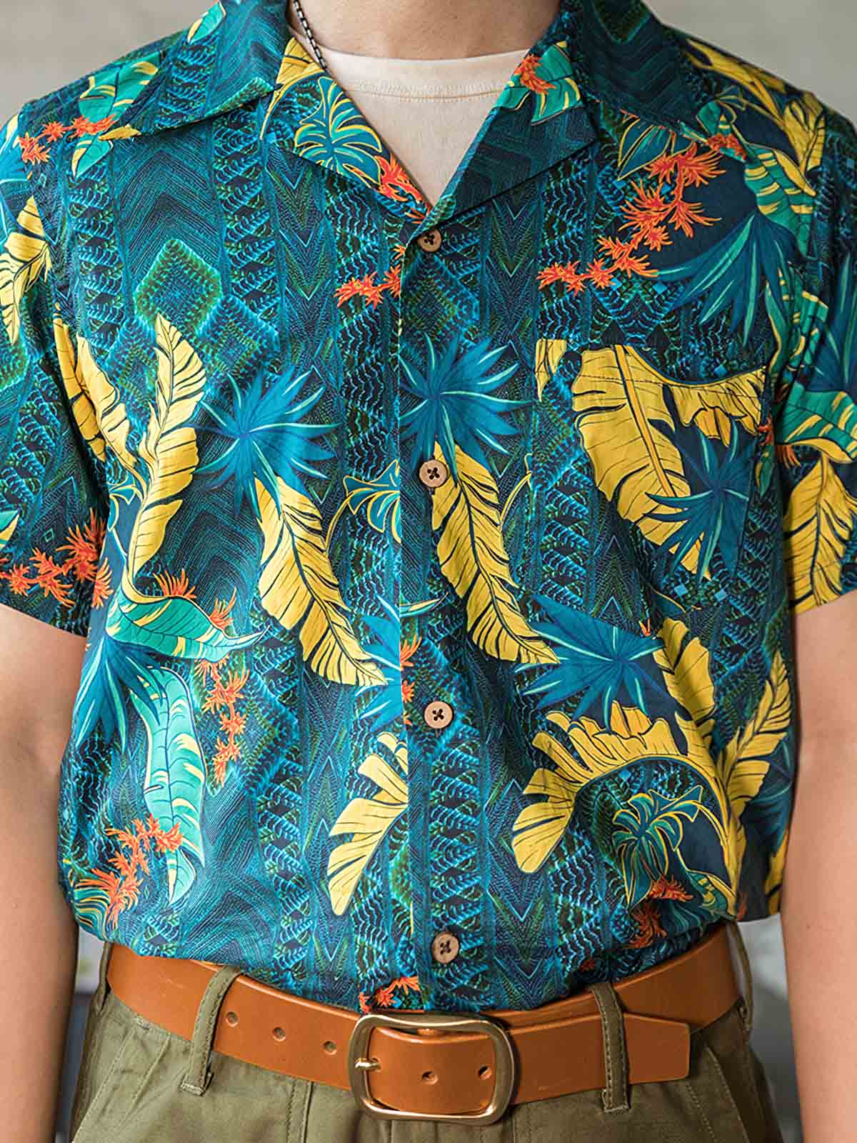ユニークなプリントパターンは、島の生活をリラックスした雰囲気で表現しており、各ボタンはパームフルーツから作られています。時間が経つにつれて色と質感が自然に変化し、着用する楽しみが増します。シャツの裏地や前面のポケットも、快適さと実用性を考慮して設計されています。