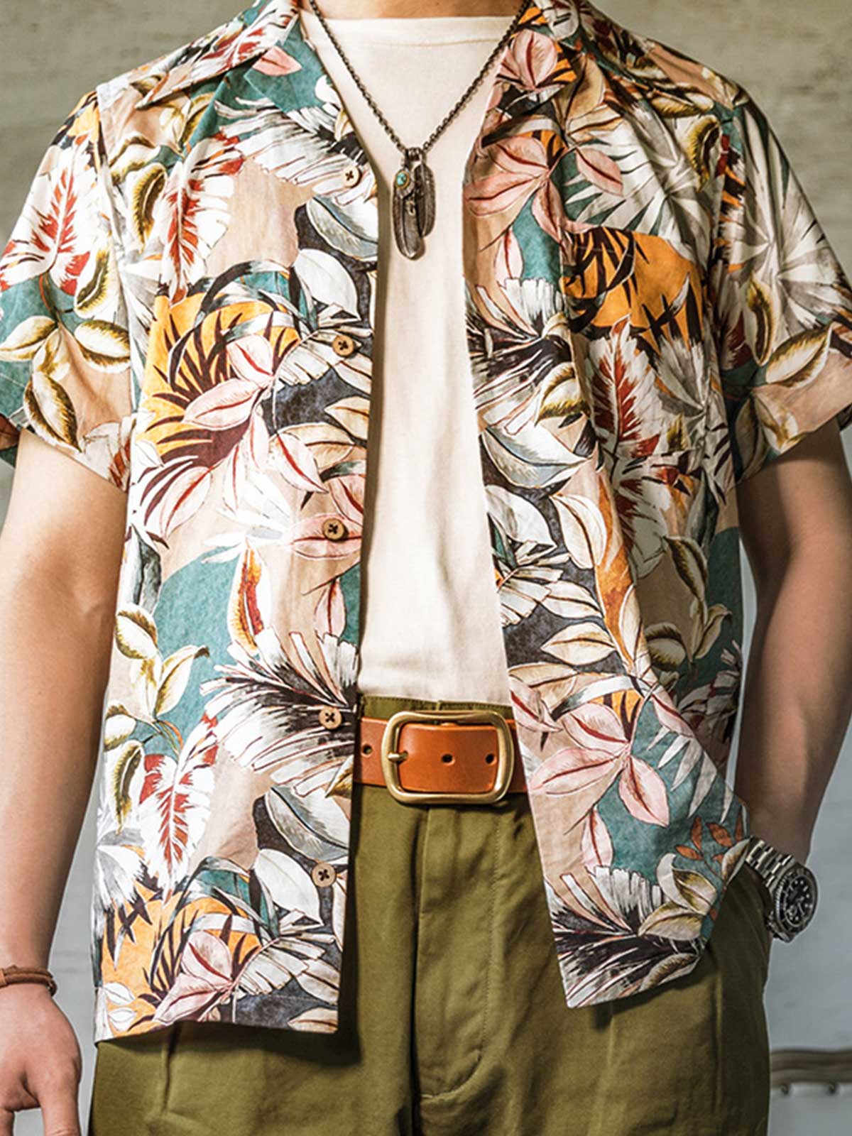 このシャツは、無地のカジュアルパンツとシンプルなサンダルを合わせることで、シャツ自体の色とパターンを際立たせ、明るく夏らしいカジュアルスタイルを簡単に作り出せます。