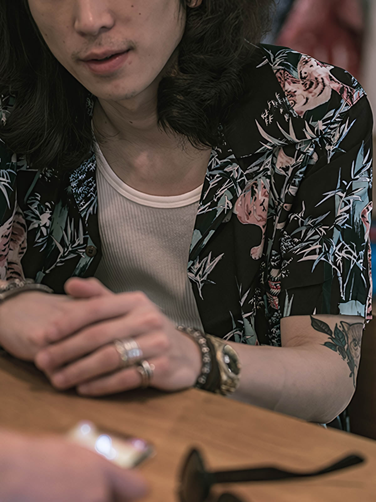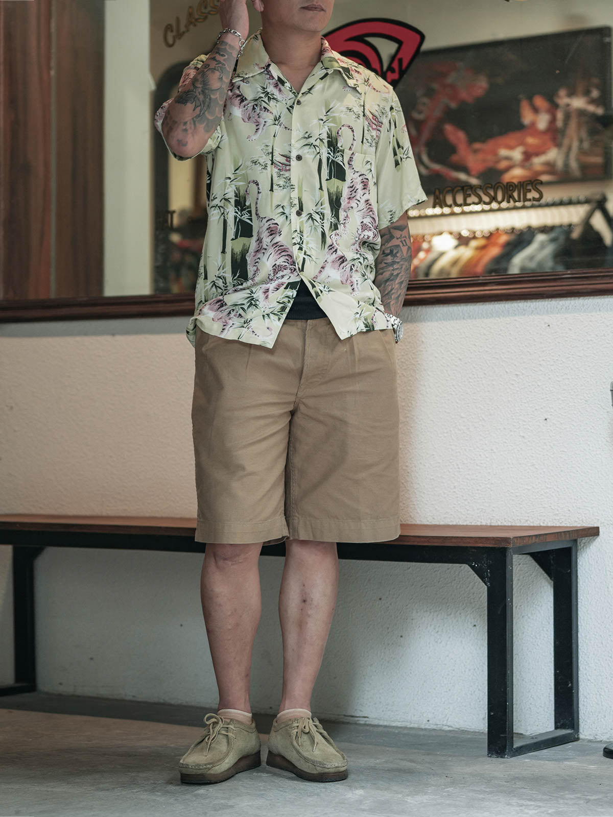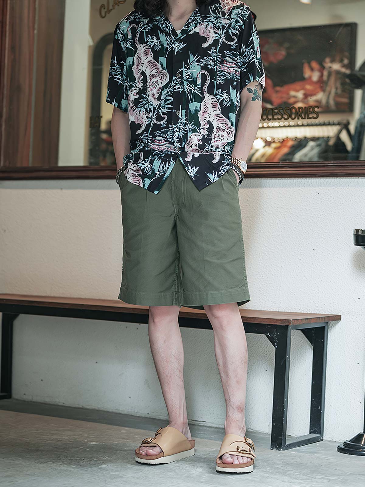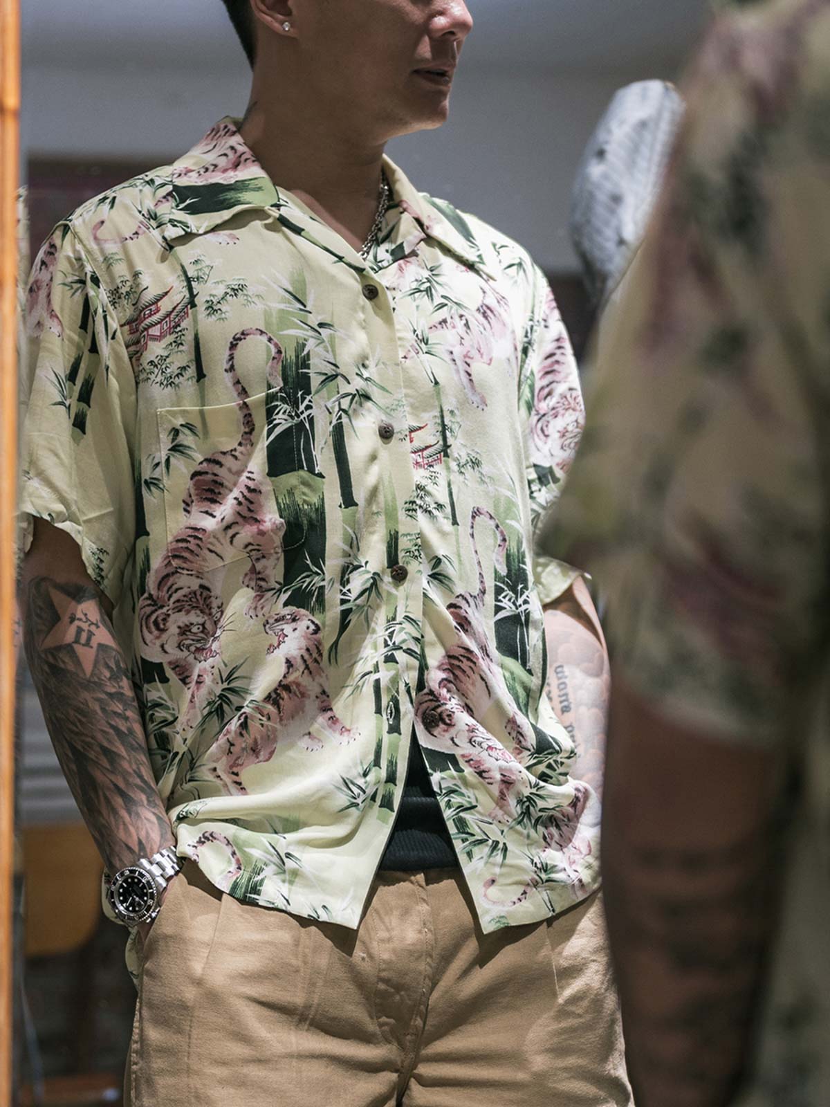 軽くて通気性の良い生地を使用しており、快適な着用感を実現しています。シャツには精密な印刷技術で浮世絵の竹林とトラが描かれており、ビビッドな色彩と細部にわたるこだわりが際立っています。耐久性と美観を兼ね備えた丁寧なステッチが各シームに施されています。