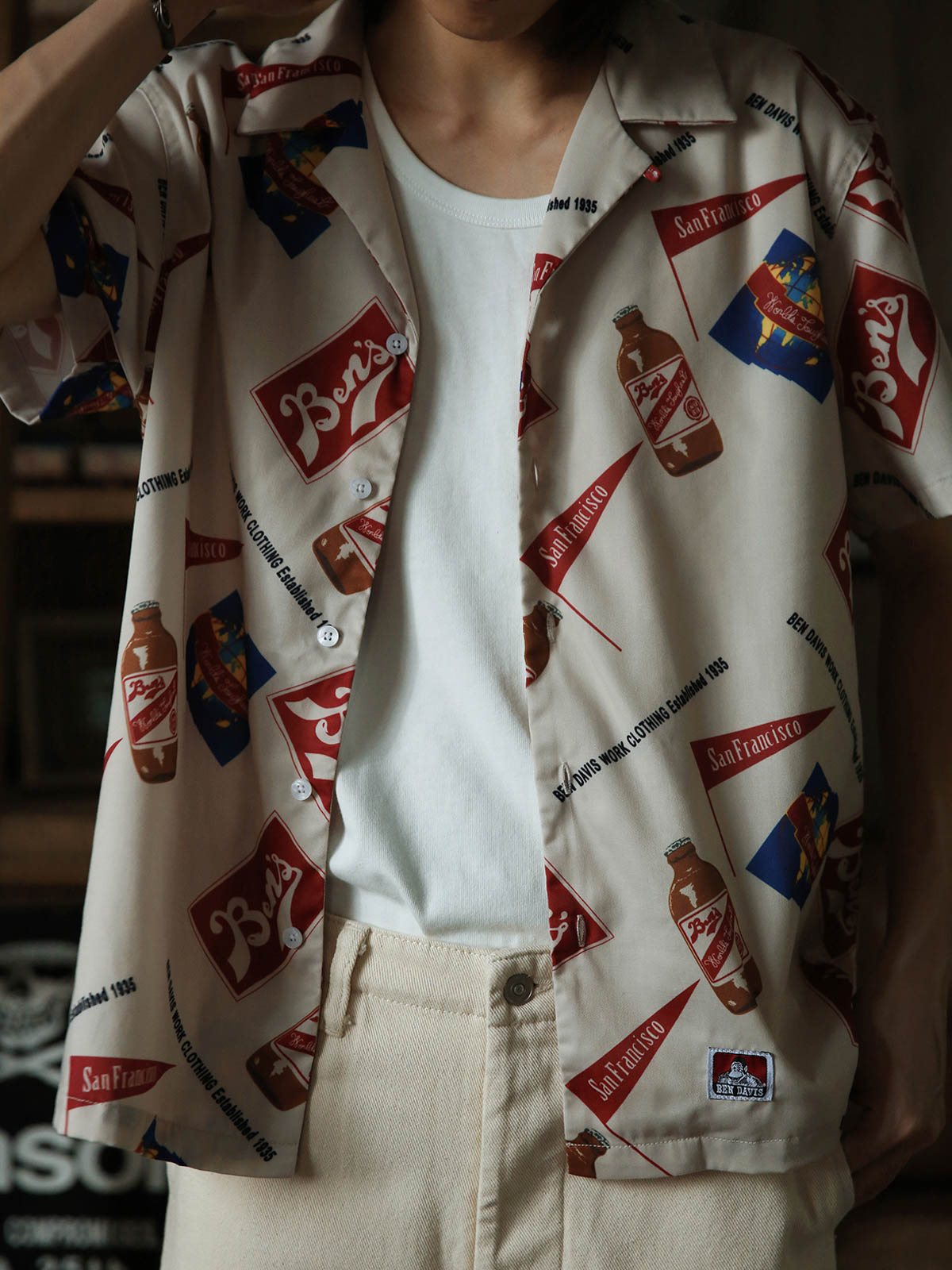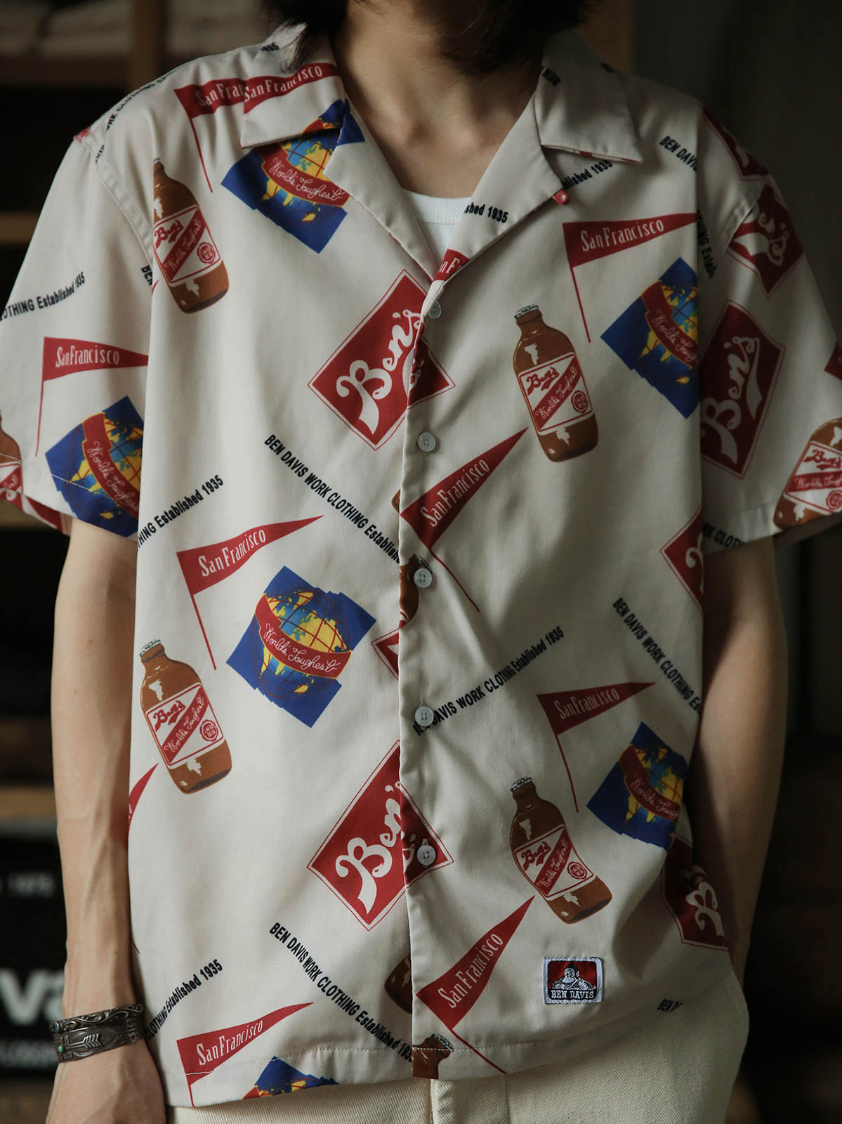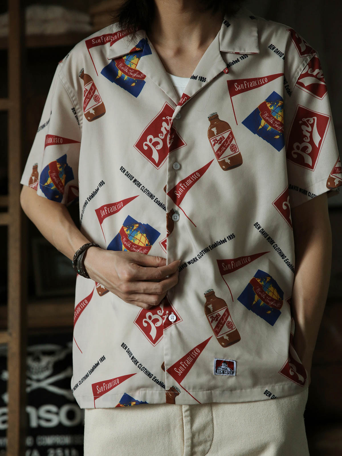 個性とファッション性に溢れるフラッグとボトル柄のアロハシャツ、夏のカジュアルスタイルに最適。
