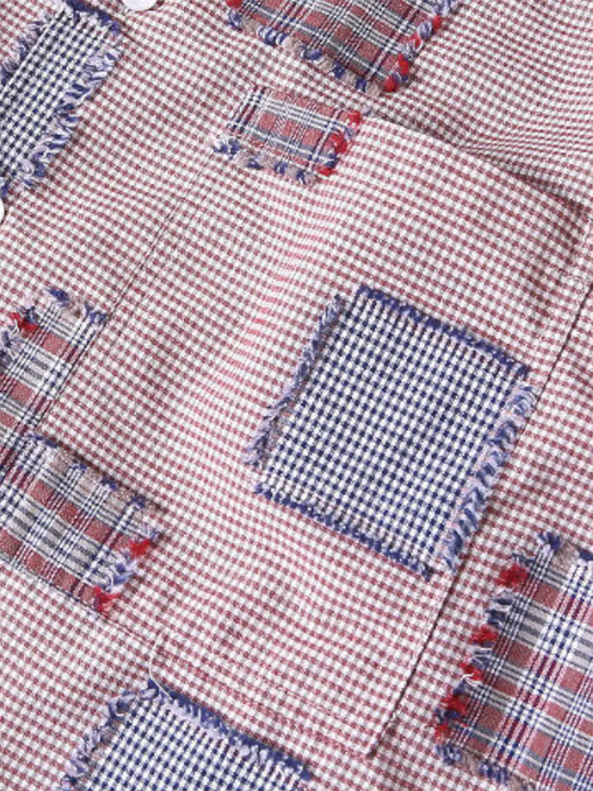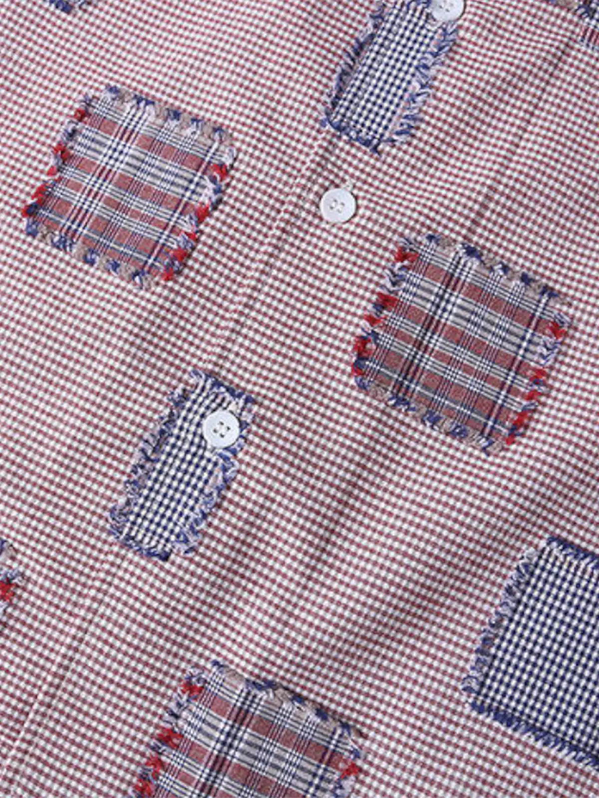 上品な細格子を色織りで表現し、随所に施された“プディング”風パッチワークがアクセントとなる一枚。軽やかなポリエステル100%生地は柔らかく通気性に優れ、洗練されたドレープをキープしながらも型崩れしにくい安定感を実現。ゆったりとしたボックスシルエットが自然な着心地を提供し、胸元のワンポケットが機能性をプラス。