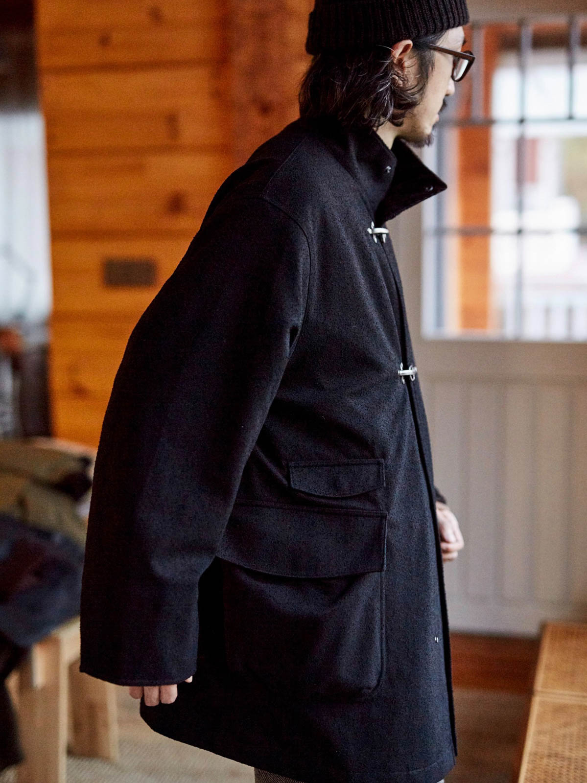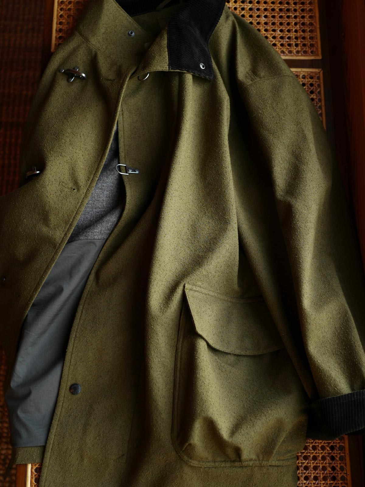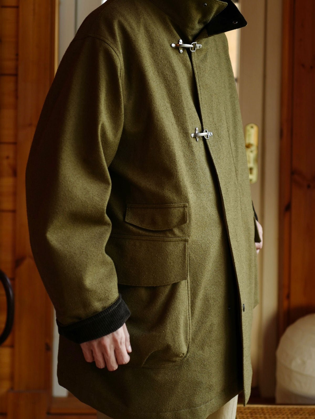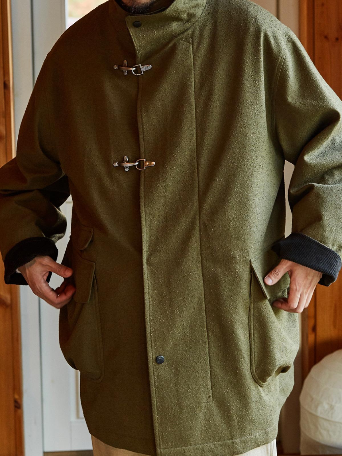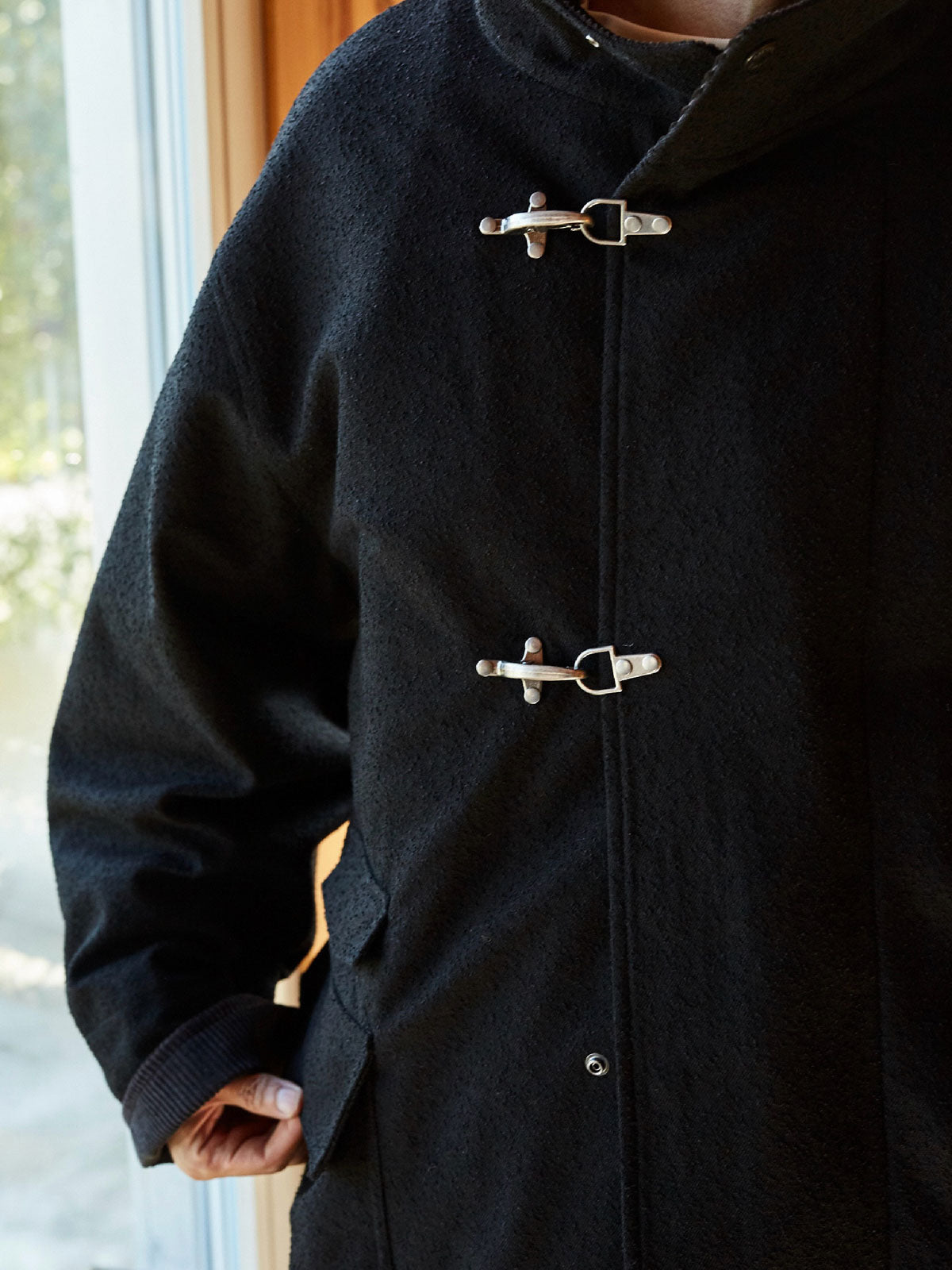 このコートは、改良されたフライトボタン付きのテクスチャードコートです。伝統的な消防士のユニフォームに触発されたデザインで、堅牢で着脱が容易な点が特徴です。フライトボタン、またはバックルとして知られるこの実用的なクロージャーシステムは、耐久性と操作のしやすさで知られるワークウェアやミリタリーウェアによく見られます。