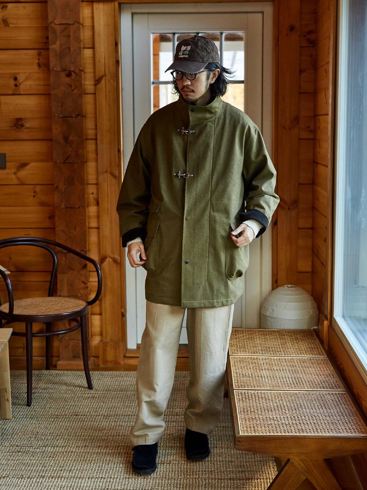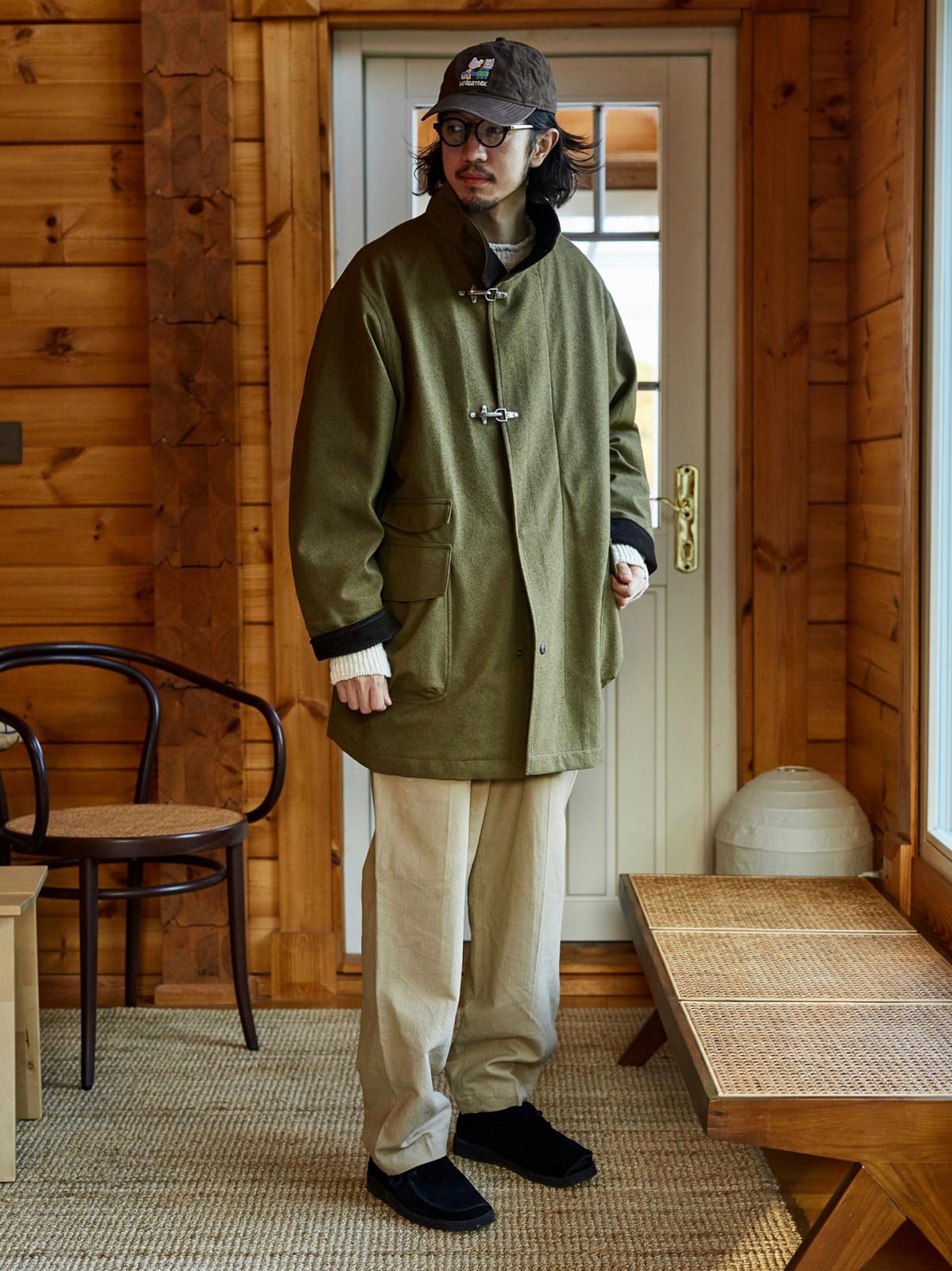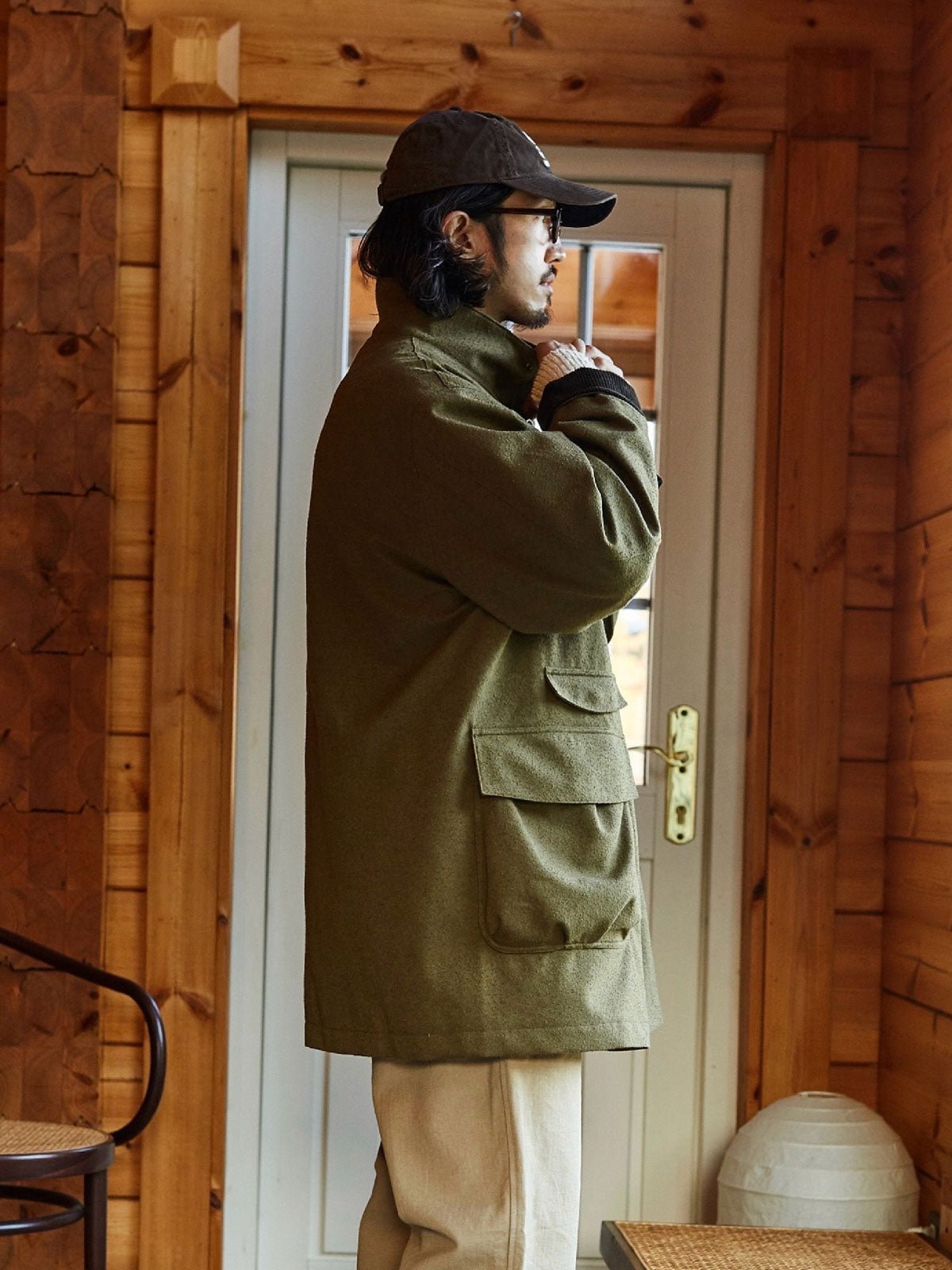 このコートは、画像のようなライトカラーのパンツ、例えばベージュのカジュアルパンツやシンプルな黒の靴と合わせると良いでしょう。そのシンプルさと実用性は、都市のカジュアルウェアや週末のリラックススタイルに最適です。インナーには無地のTシャツや軽いニットを選び、全体のリラックスした雰囲気を保ちましょう。