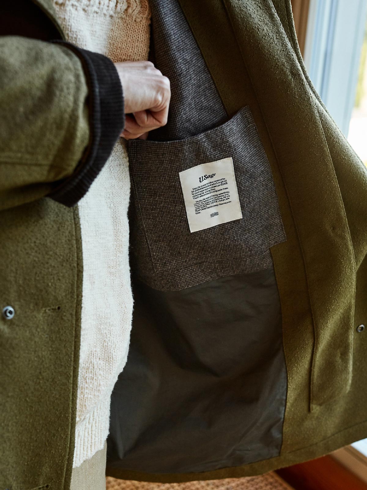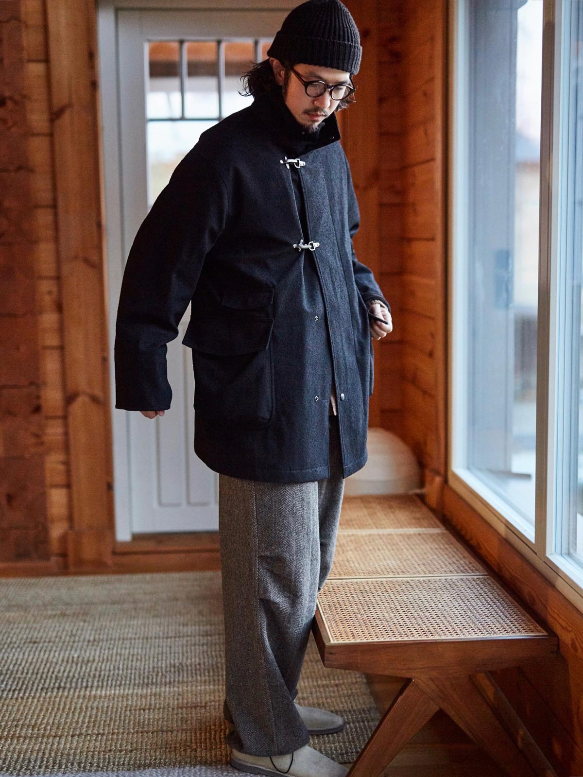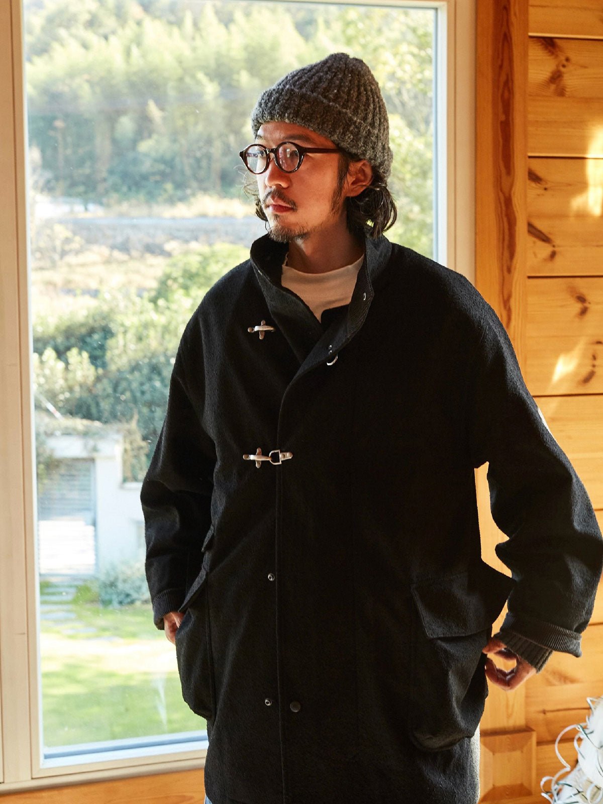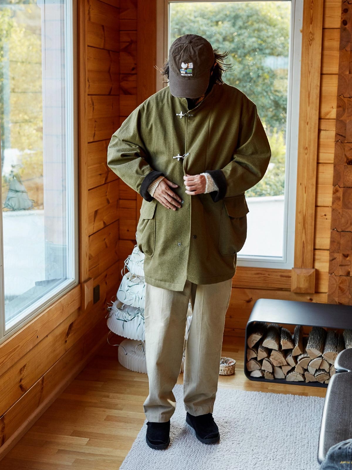 このコートは、画像のようなライトカラーのパンツ、例えばベージュのカジュアルパンツやシンプルな黒の靴と合わせると良いでしょう。そのシンプルさと実用性は、都市のカジュアルウェアや週末のリラックススタイルに最適です。インナーには無地のTシャツや軽いニットを選び、全体のリラックスした雰囲気を保ちましょう。