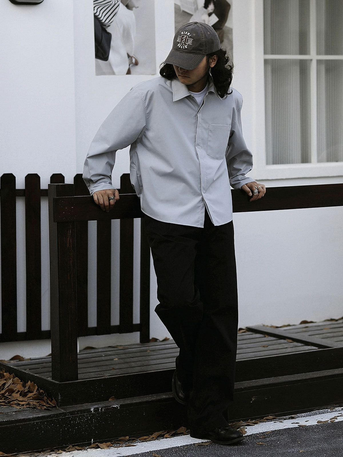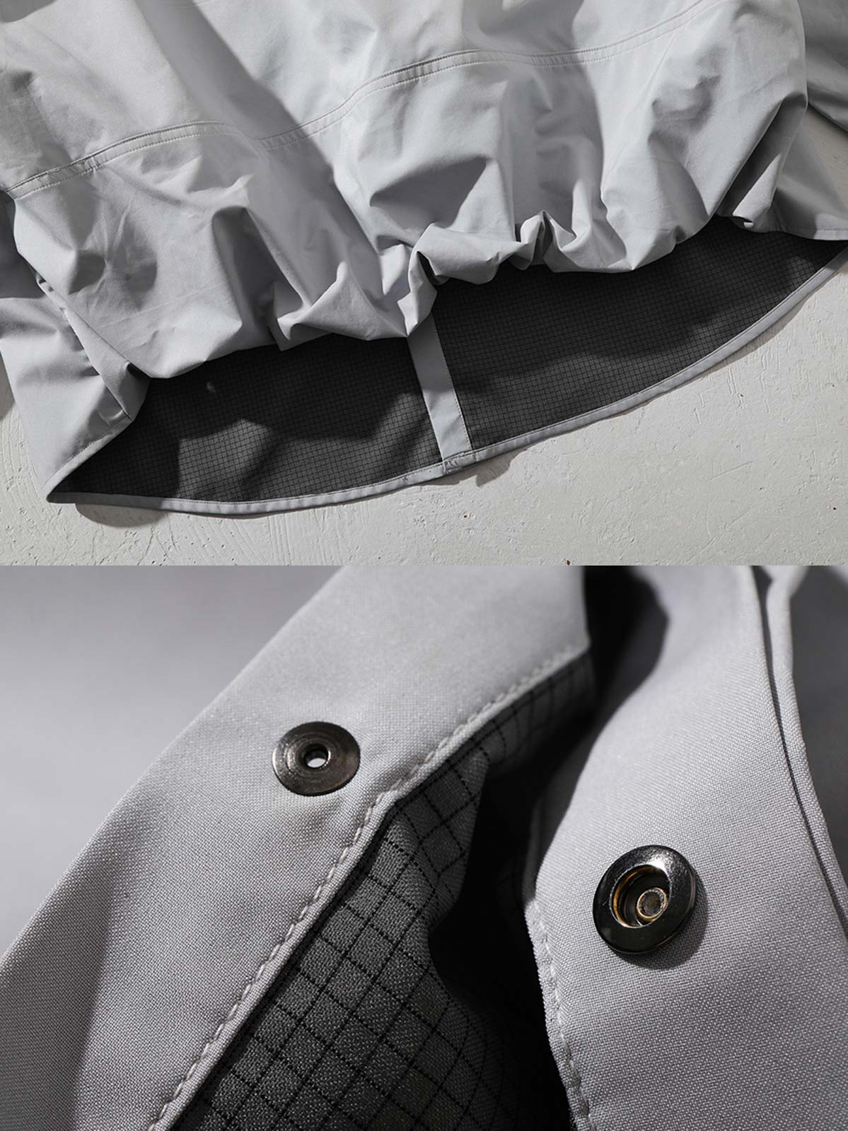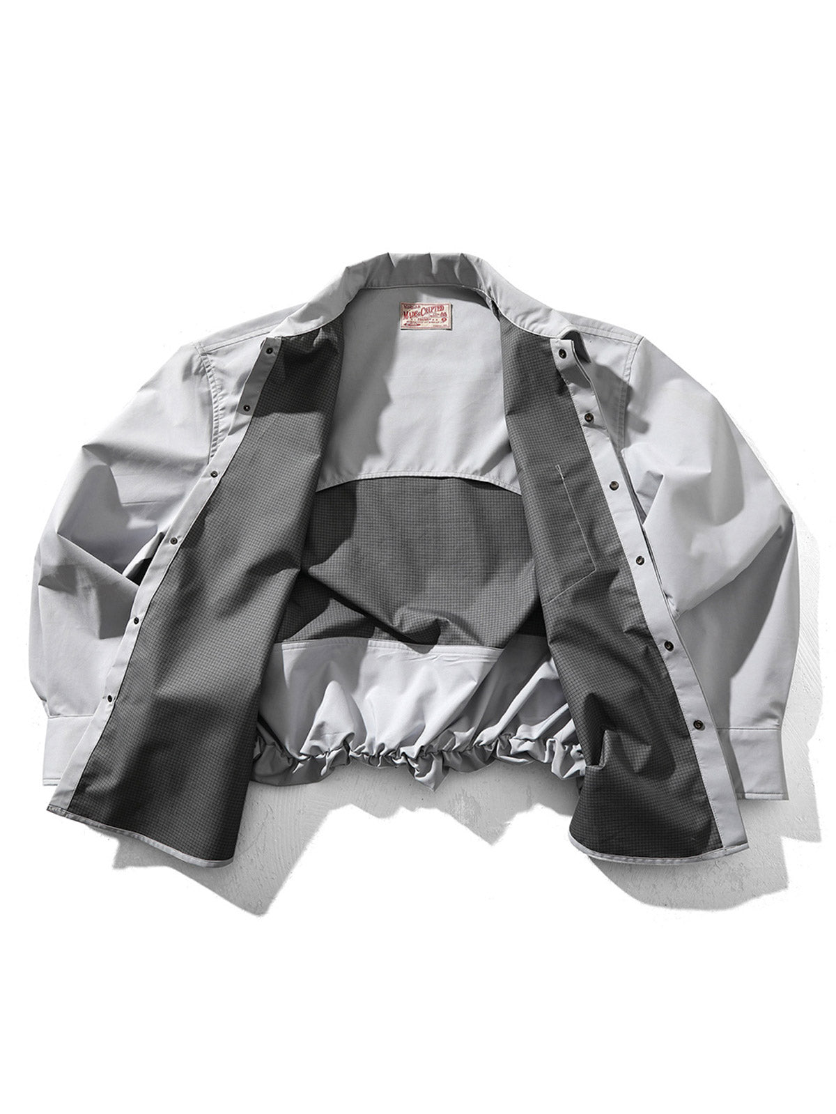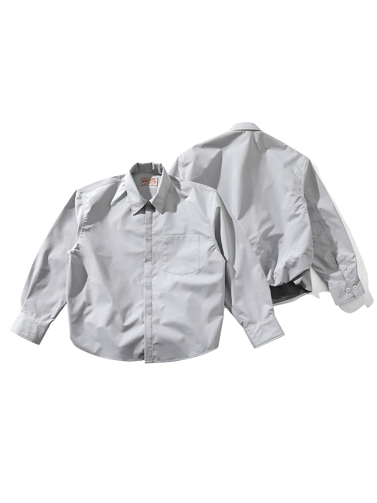このシャツは、100%ポリエステル製の超軽量防風素材を使用し、シンプルでシャープなシルエットが特徴です。通勤や日常のコーディネートに最適です。背面には二重構造が施され、防風性と耐久性が向上しています。スタンダードなショート丈カットと大きめのポイントカラーが、洗練された雰囲気を引き立てます。フロントは隠しボタン仕様ですっきりとした印象を演出。袖口には大きな樹脂製ボタンがアクセントとして配置され、デザイン性を高めています。内蔵ゴムによる後ろ裾のドレープ効果と前後差のあるデザインが、さまざまなアイテムとの相性を良くしています。15~16針の高密度ステッチが、シャツの精密な仕立てを際立たせます。
