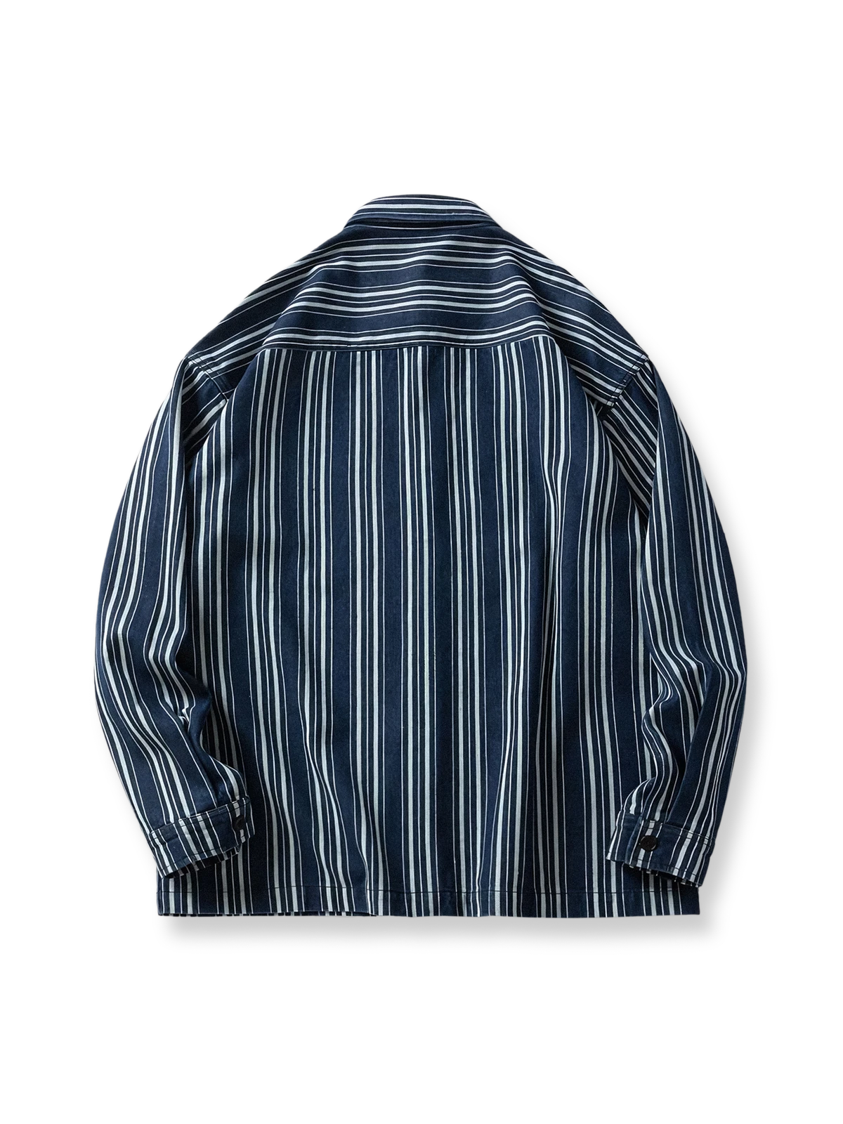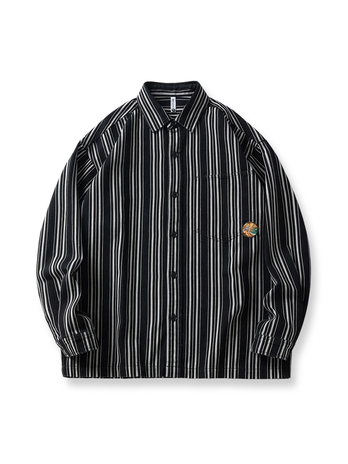 このワークシャツは、ブラックとホワイトのストライプデザインを採用し、ルーズフィットのシルエットと実用的なワークポケットを兼ね備えた、耐久性とスタイルを両立した一着です。胸元にあしらわれたスカルバッジが個性的なアクセントとなり、着用者の独自のスタイルを引き立てます。ビンテージアイテムとの相性も良く、強いビンテージワークスタイルを演出でき、日常からアウトドアまで幅広いシーンで活躍します。しっかりとした通気性の良い生地を使用しており、年間を通じて快適に着用可能です。