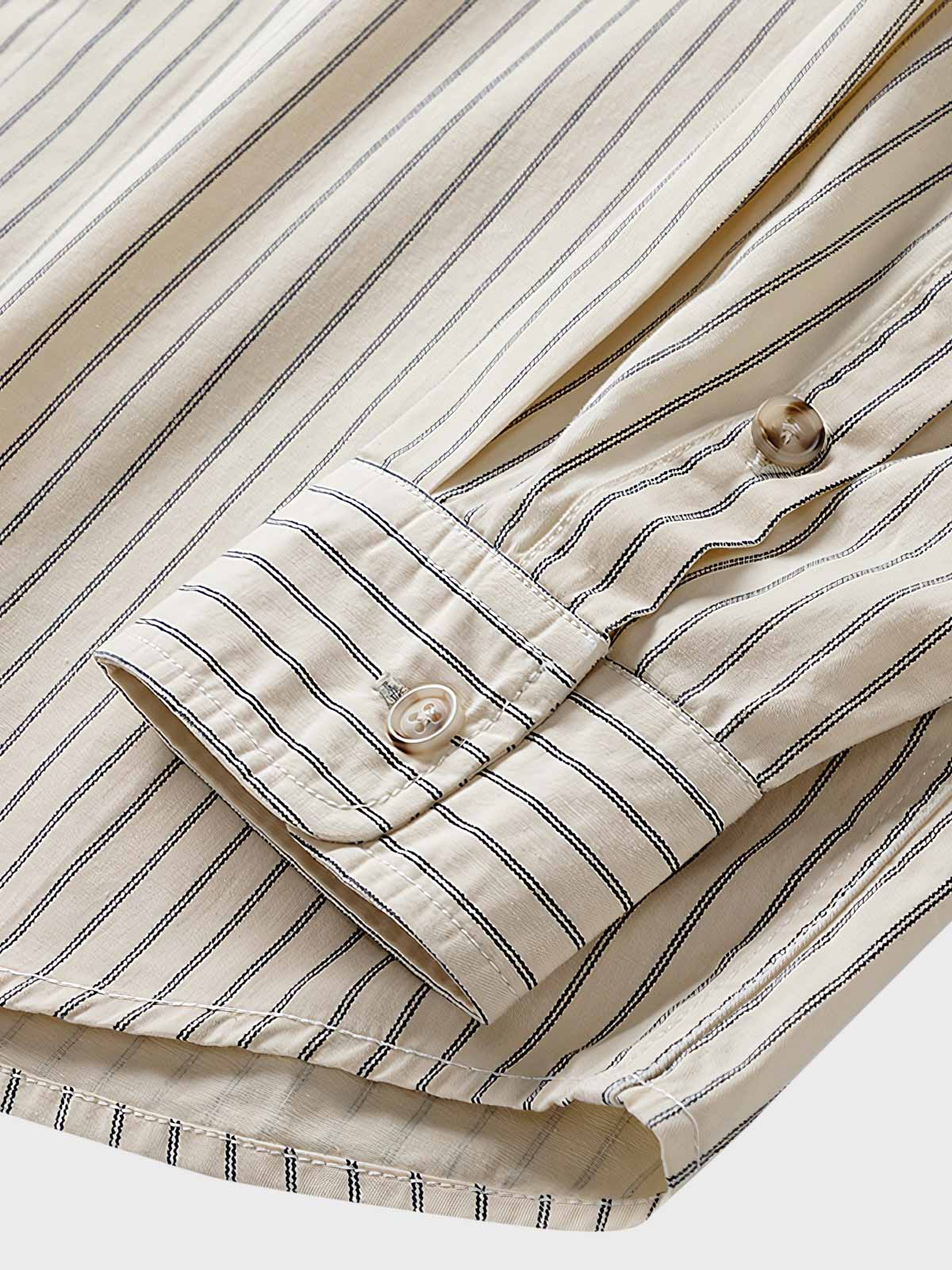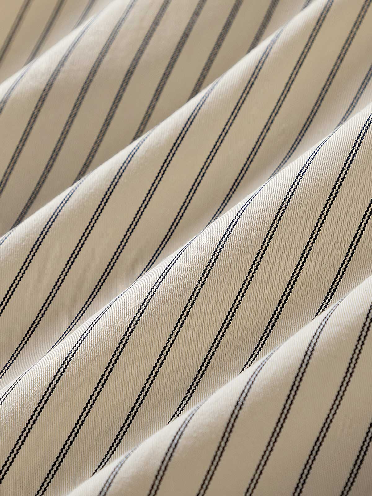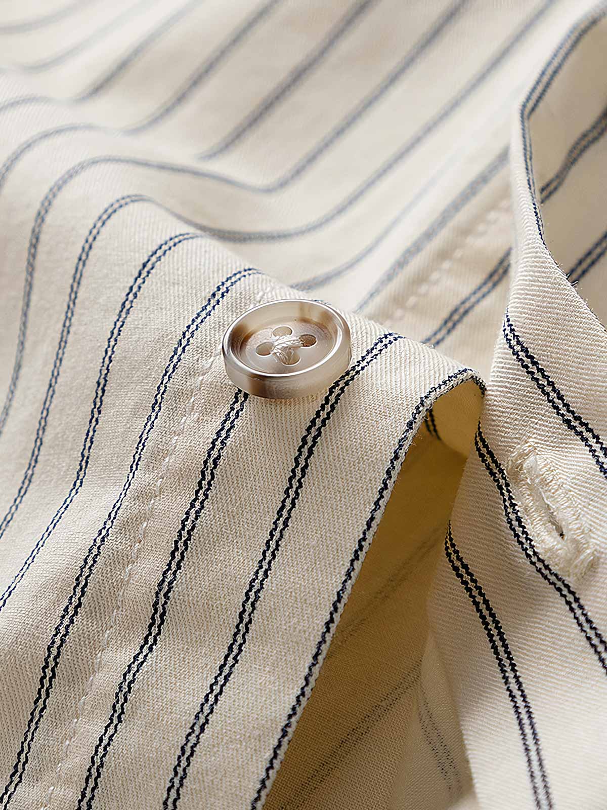 耐久性に優れた柔らかいコットン素材を使用しており、ストライプパターンは縦のラインを強調してスマートな印象を与えます。実用的なフラップポケットが装いにアクセントを加えます。