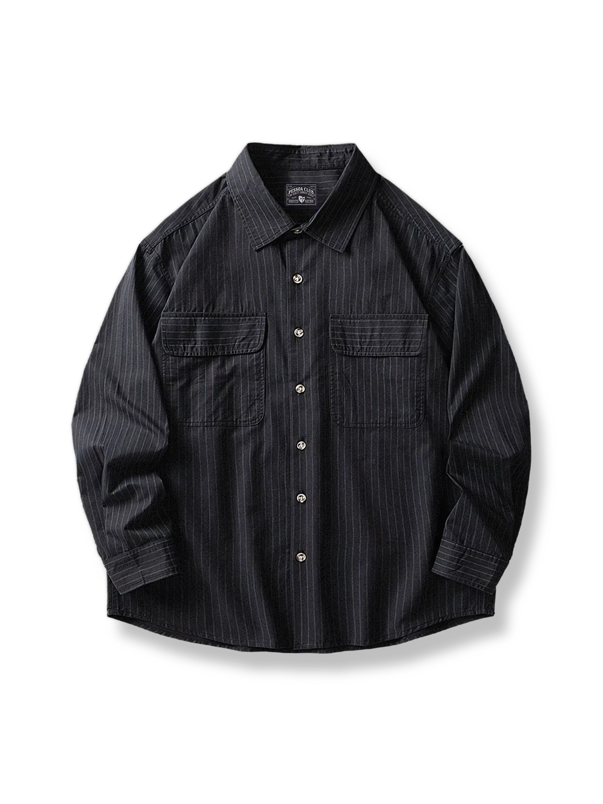 このシャツは、古典的なワークウェアの影響を受けたストライプパターンを現代風にアレンジしたものです。昔ながらの労働者の服装に見られる機能的なポケットを特徴とし、現代の都会的なワードローブに取り入れやすいアイテムになっています。